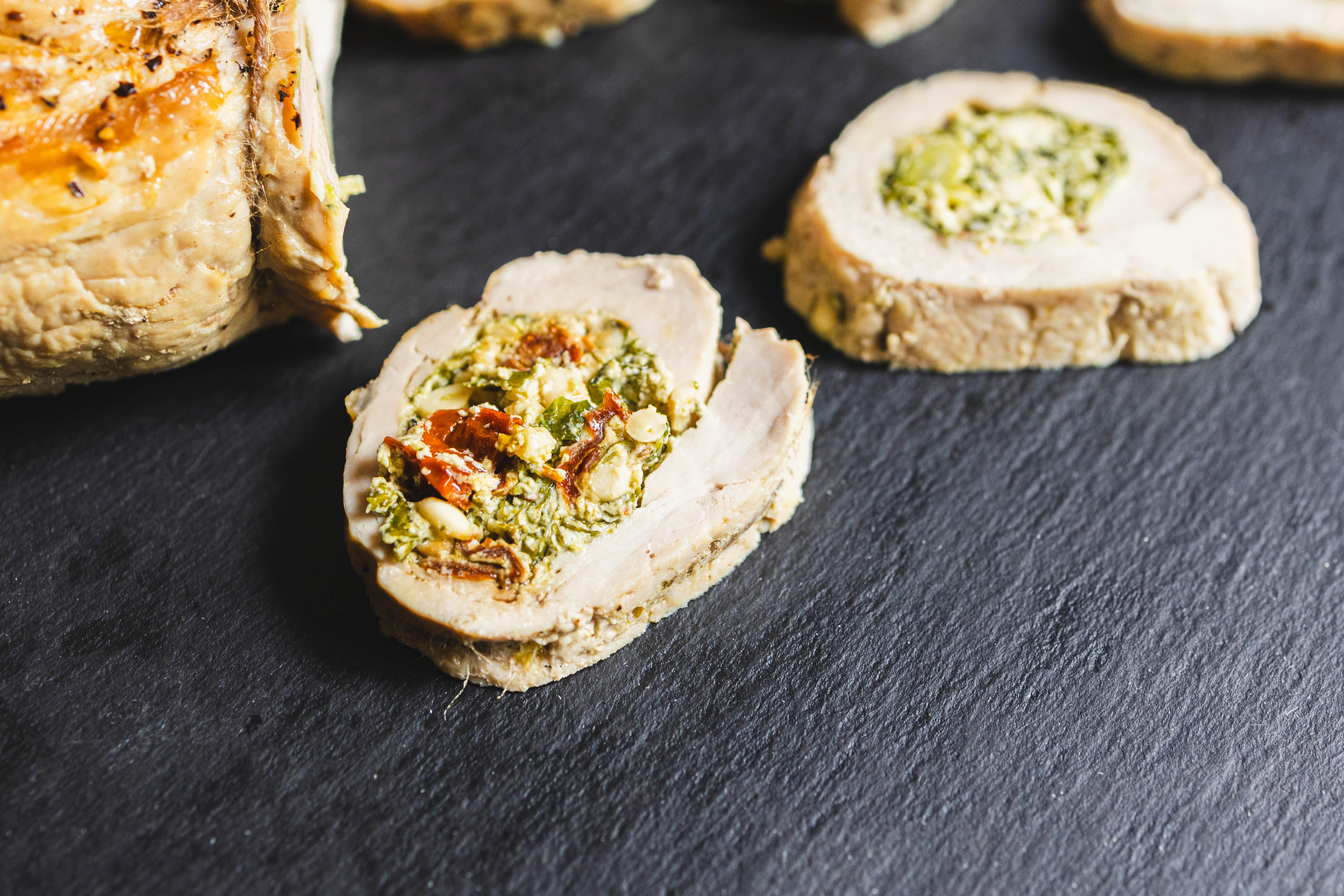 Step 4 -Spread the kale mixture over the pounded tenderloin and re-roll it. Use kitchen string to tightly tie it in 4 sections to keep it secure.