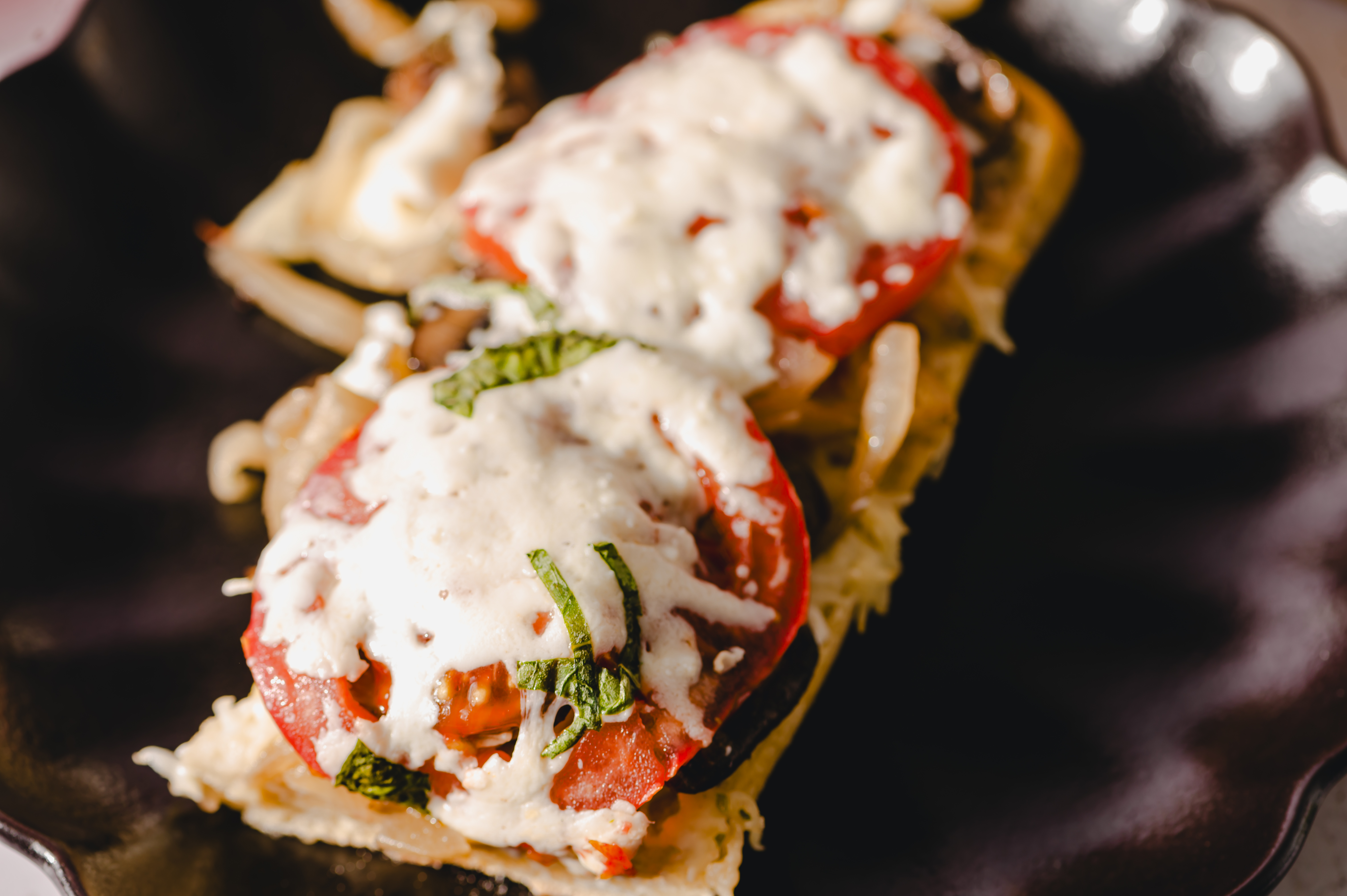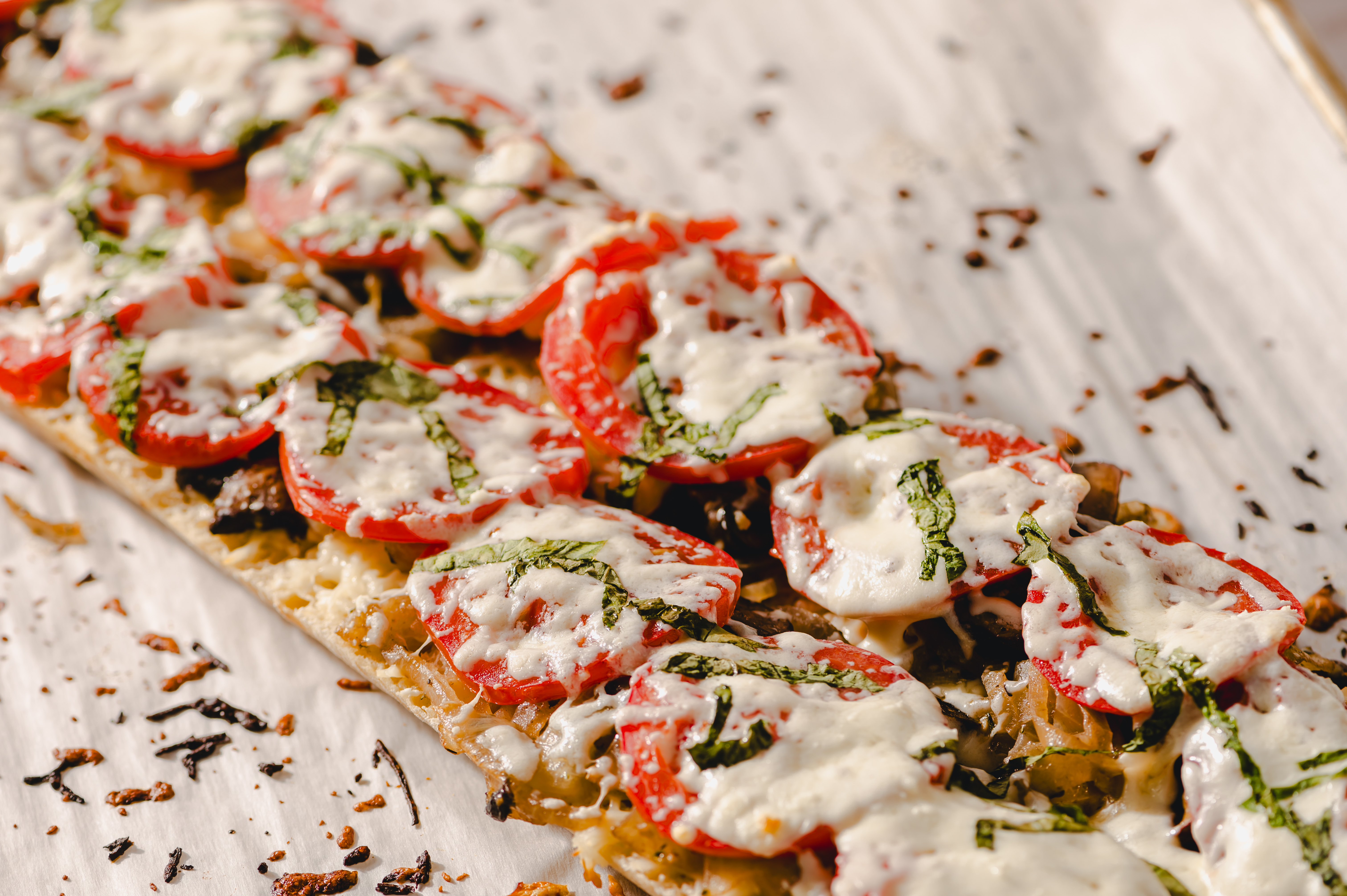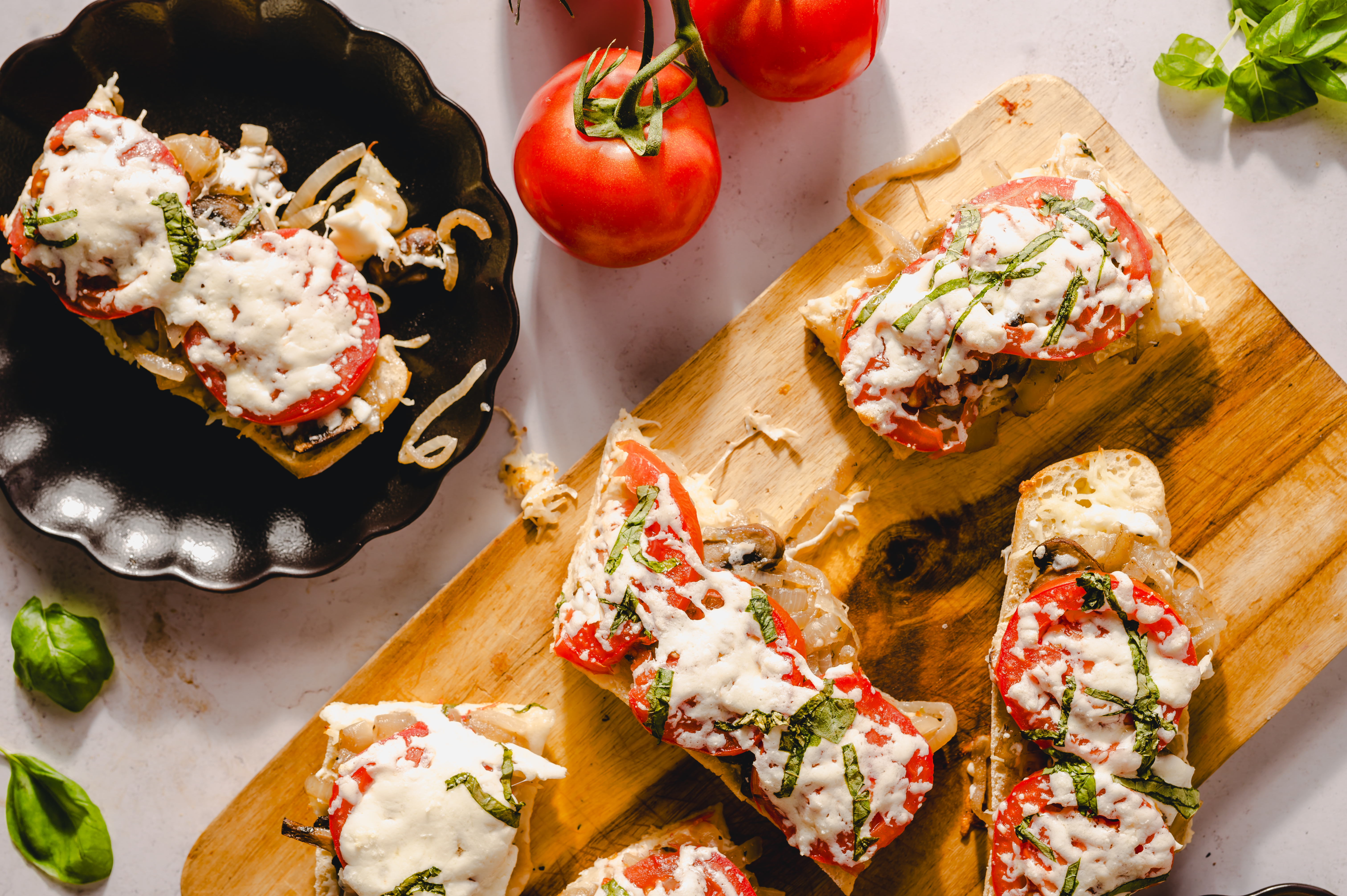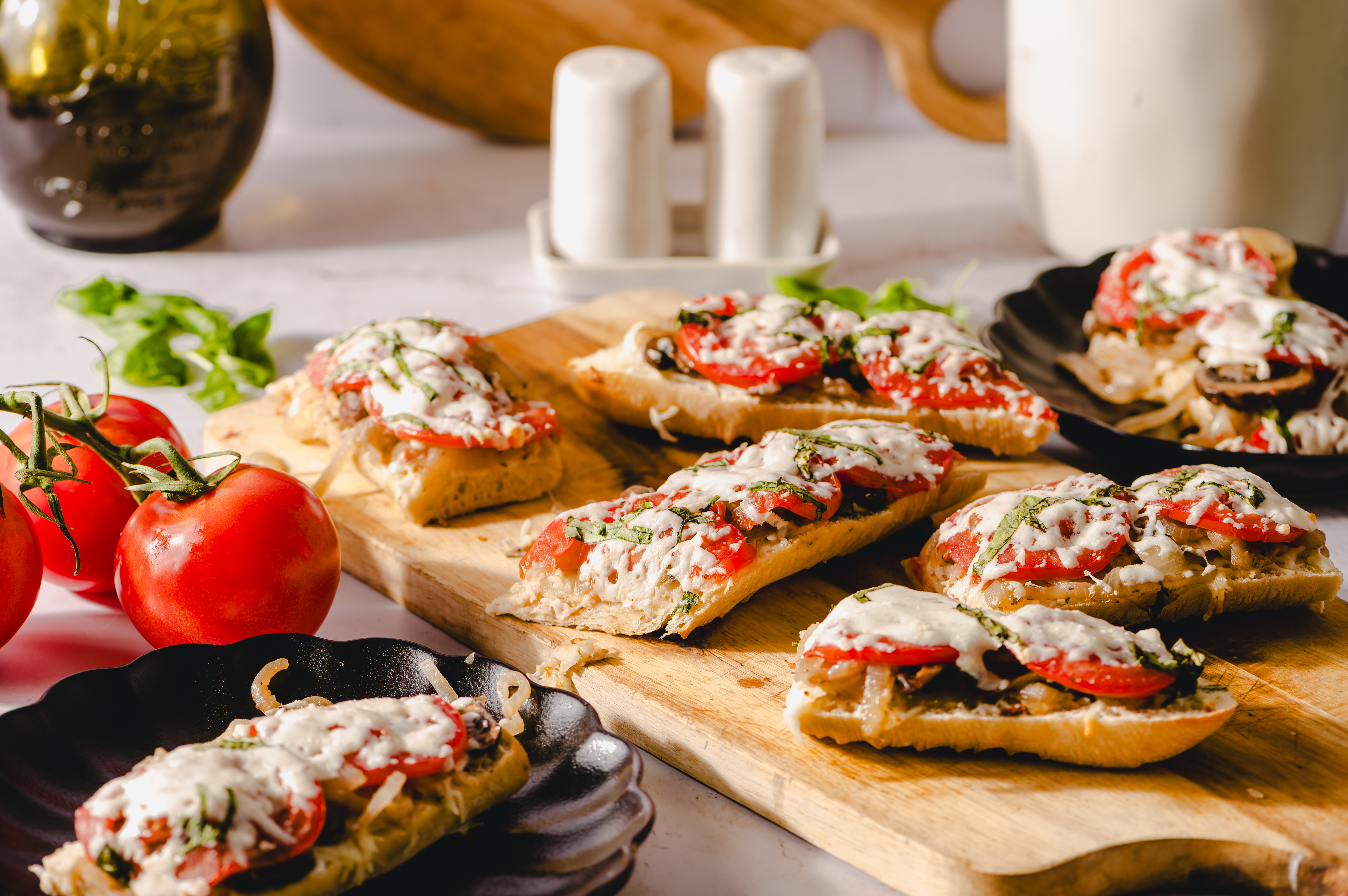Ditch the delivery! Make pizza night a Baguette Pizza night instead! Really, it's so simple — just take a fresh, buttery, French baguette, add a beautiful savory onion and mushroom mixture topped with melted mozzarella cheese, tomatoes slices, and fresh basil leaves and you have an irresistible bite of Italian finery right in your own kitchen! When you want your pizza, you want it to be better and you want it quicker. That's Baguette Pizza!