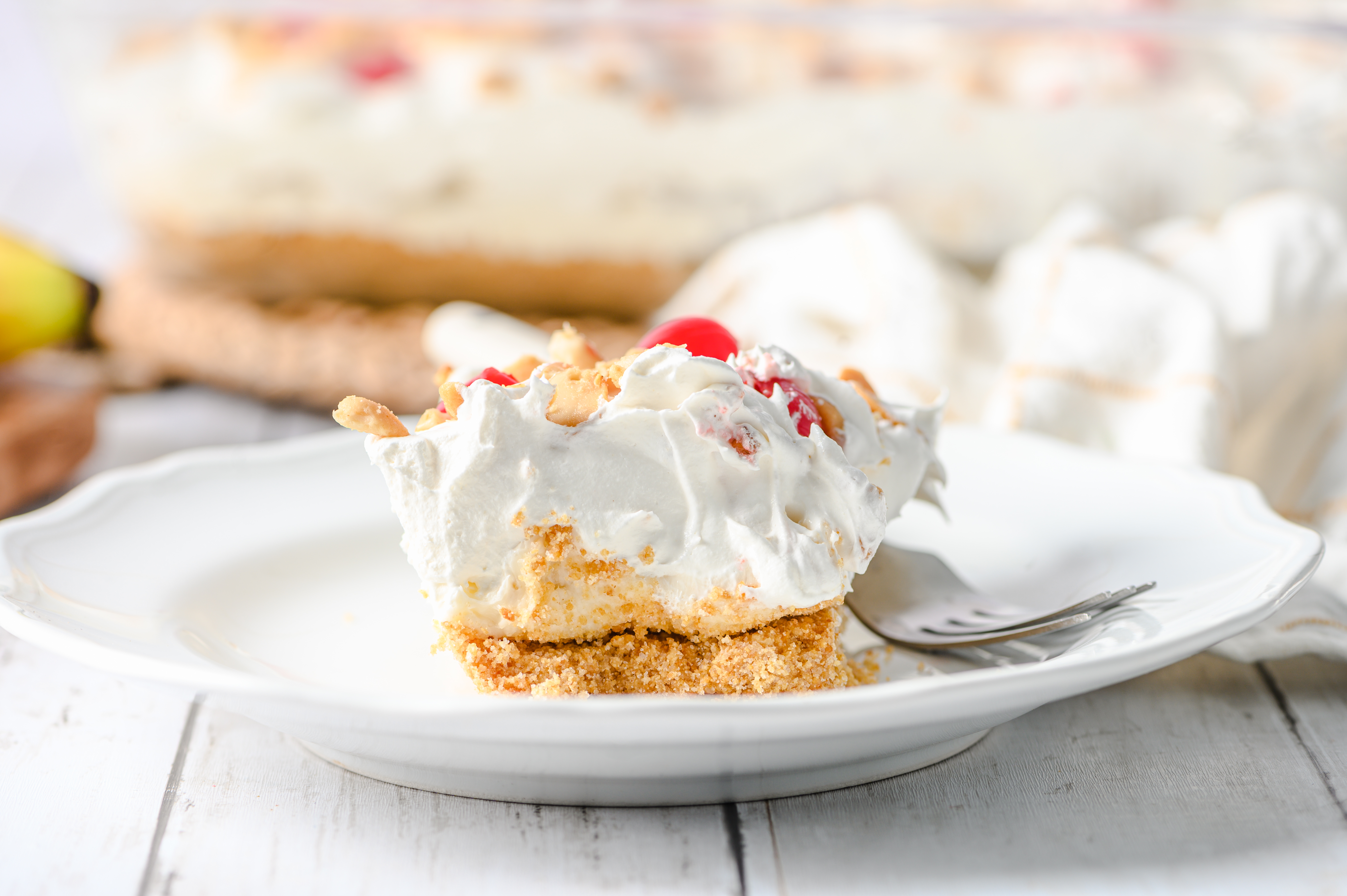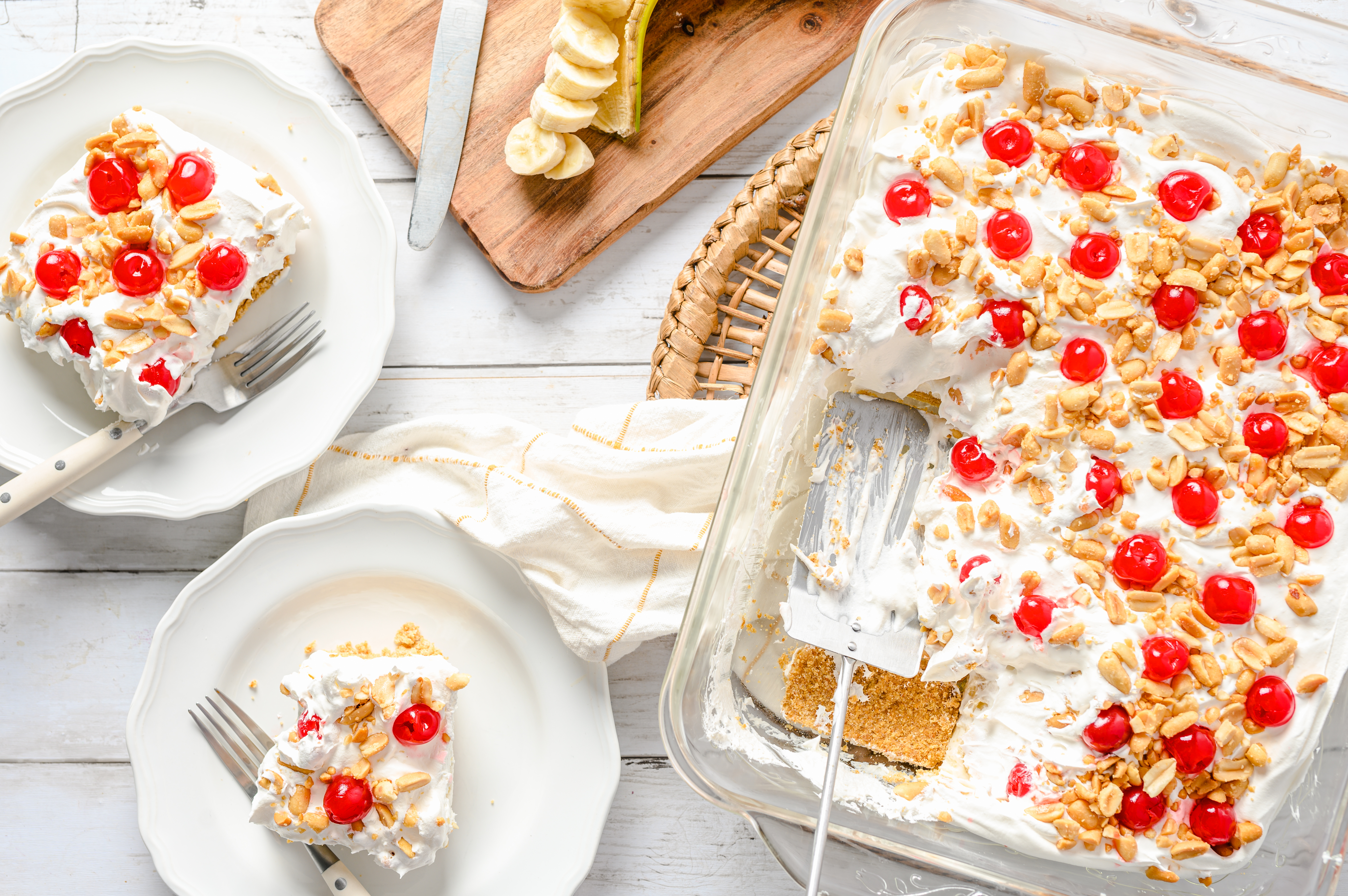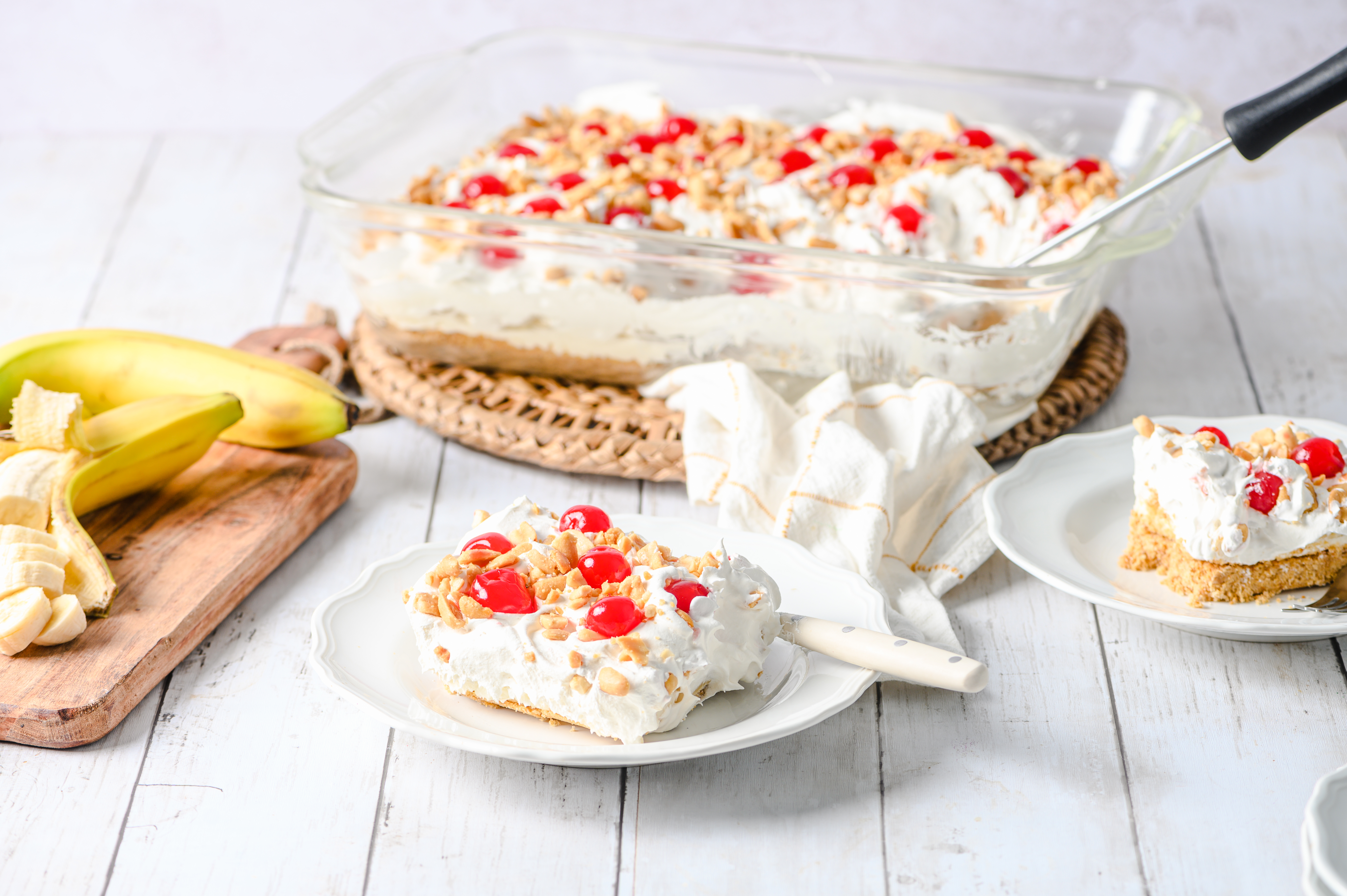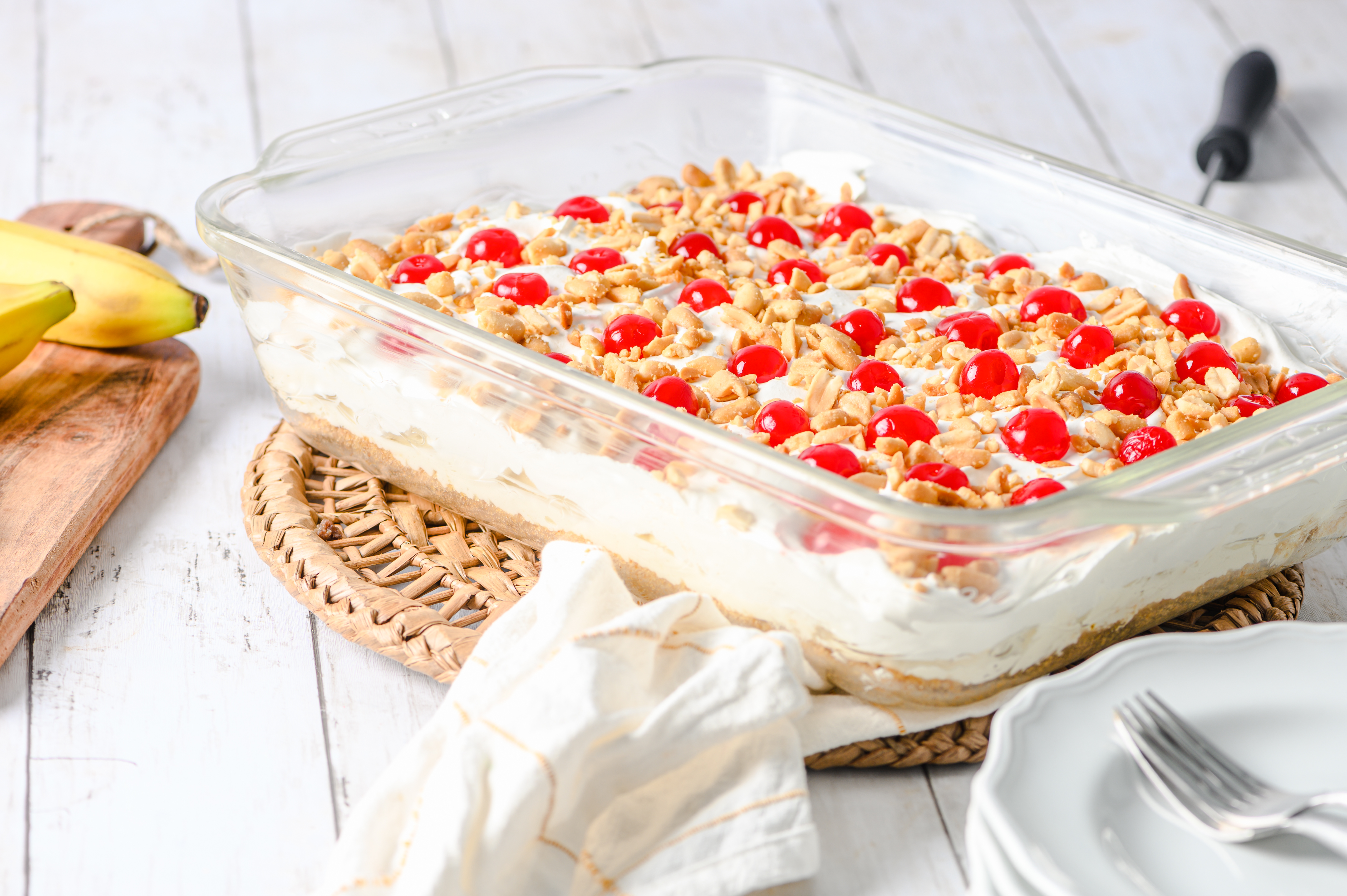 You'll definitely need more than two spoons to dig into this Banana Split Casserole! Isn't it such a fun idea!? It's pretty to look at, too. Go ahead and dig into this big pan of creamy fluff that's layered with all your favorite classic sundae toppings, ranging from fruity to nutty! You'll love the crumbly graham cracker crust that adds a buttery crunch with every bite. Get ready, because sharing this Banana Split Casserole with all your favorite people is about to be the cherry on top of your great day!