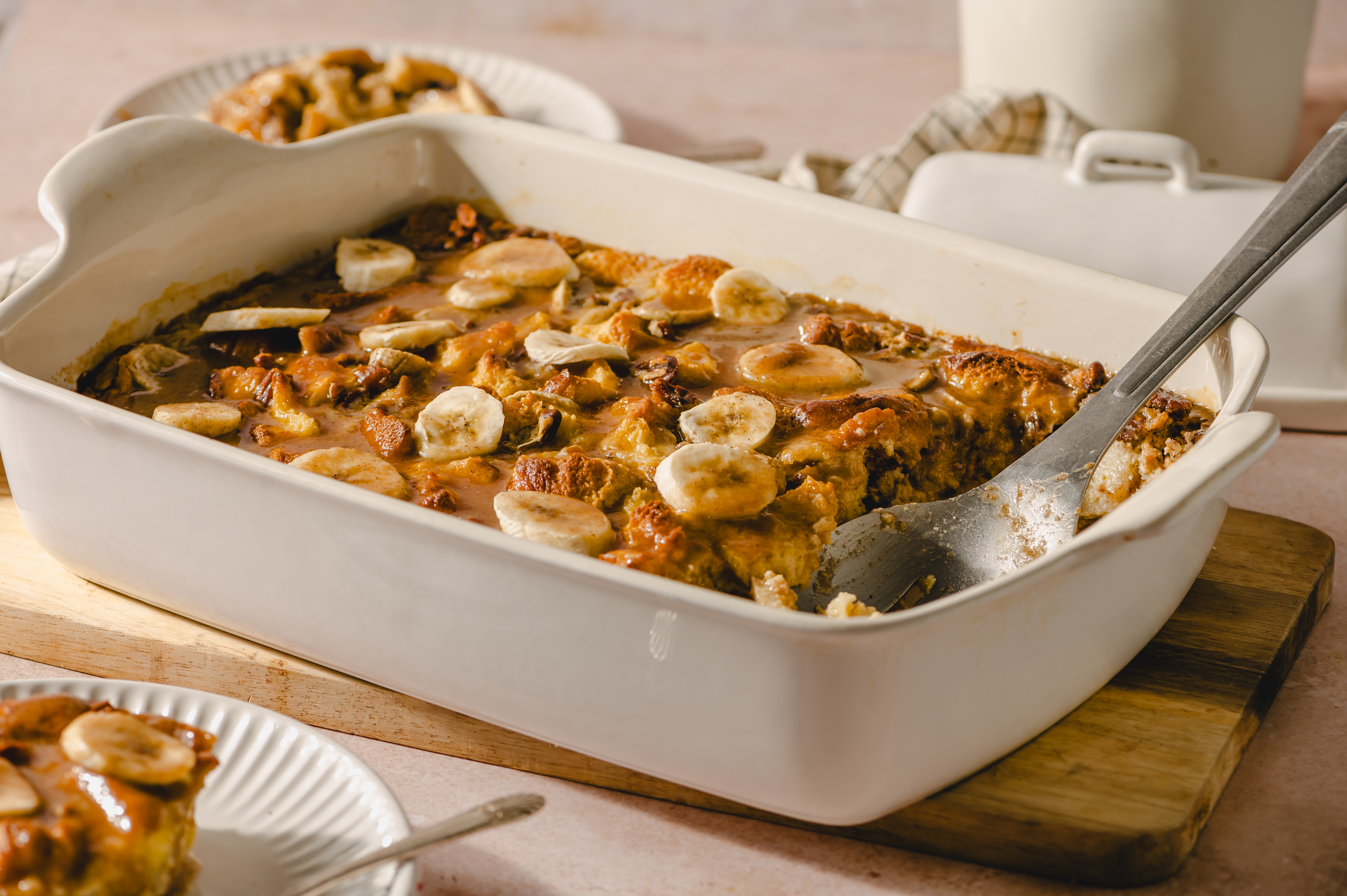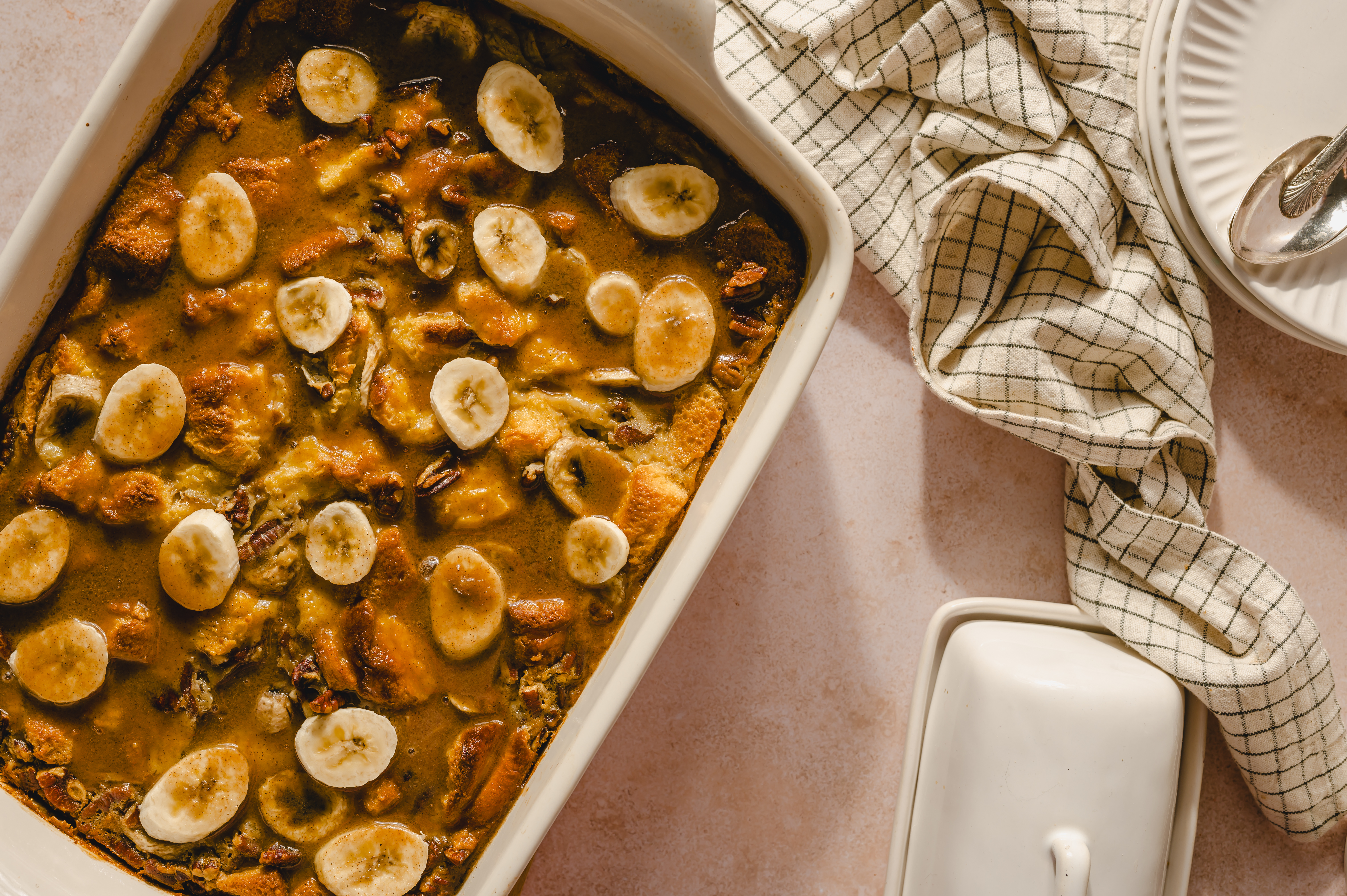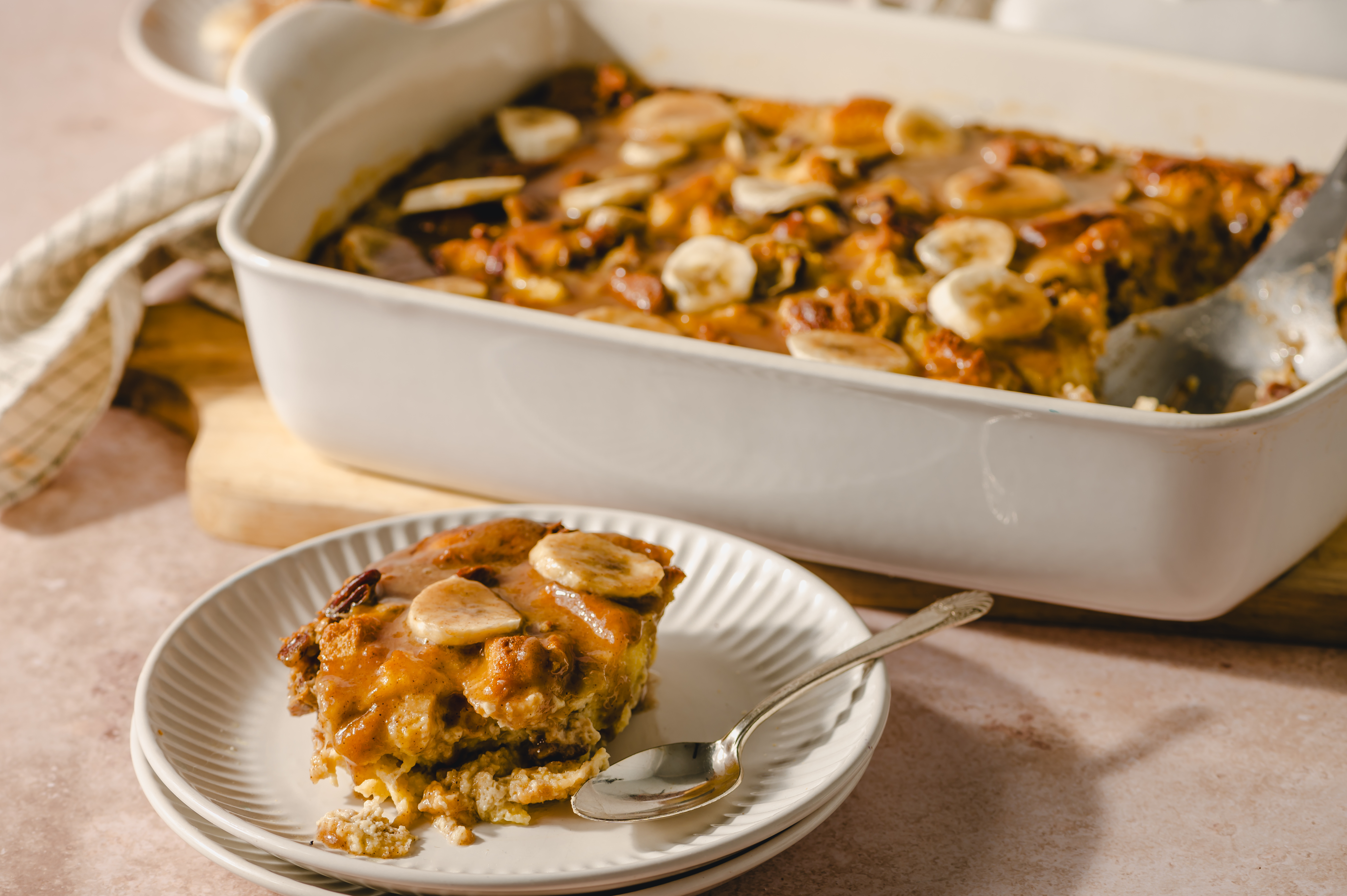 Elegant and easy are a wonderful combination. With Bananas Foster Bread Pudding, your guests will be in awe! Bread cubes are soaked in a creamy, cinnamon custard that's tapped with dark rum, then baked and drizzled with a rich, cinnamon, rum-infused syrup for an impeccable treat! Topped with vanilla ice cream, Bananas Foster Bread Pudding is a dessert masterpiece for all of your special (or just regular) gatherings! There is never a split decision... it's always delicious!