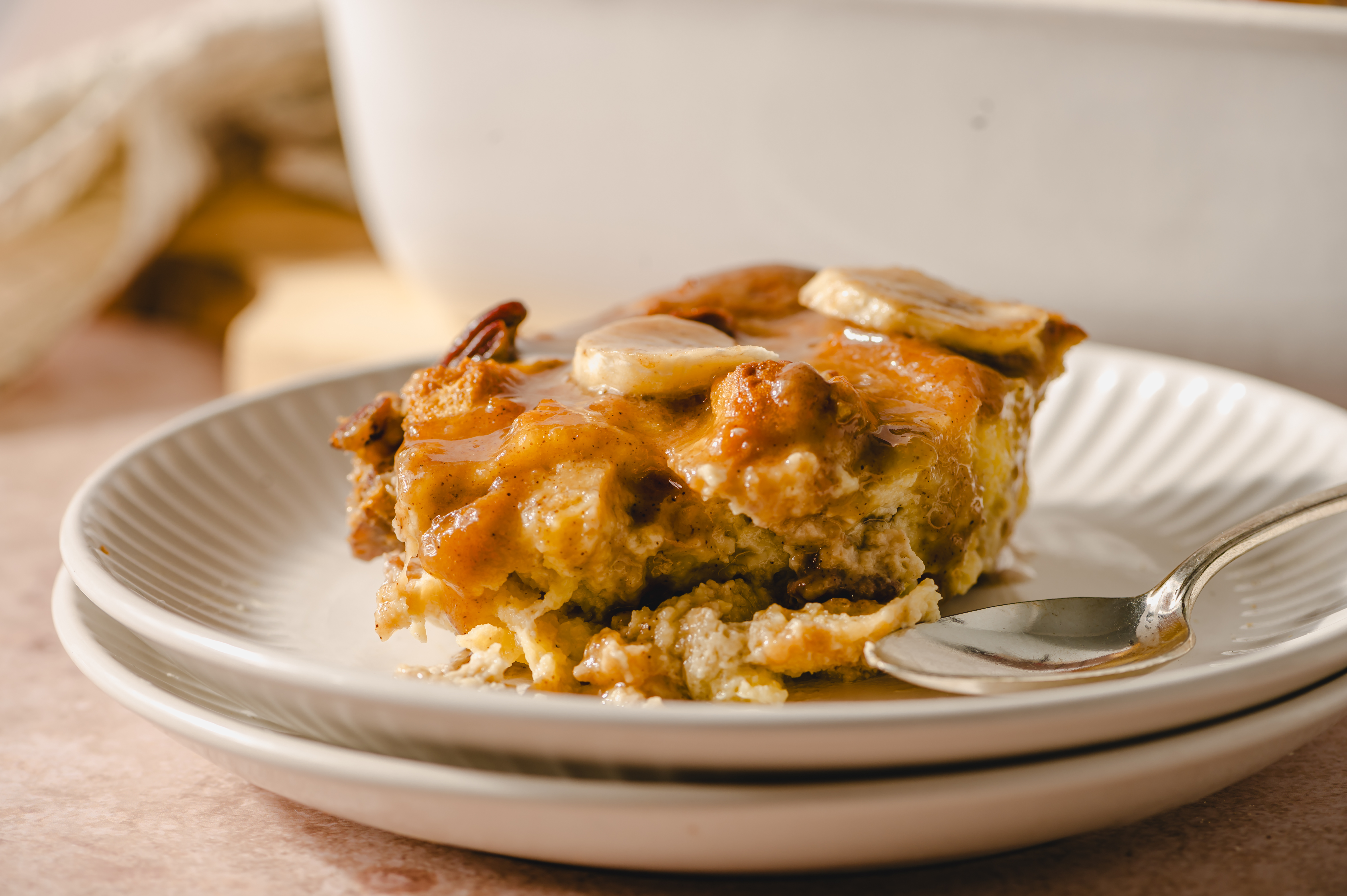 Step 16 -Sprinkle the remaining banana slices over the bread pudding and drizzle with the remaining syrup.