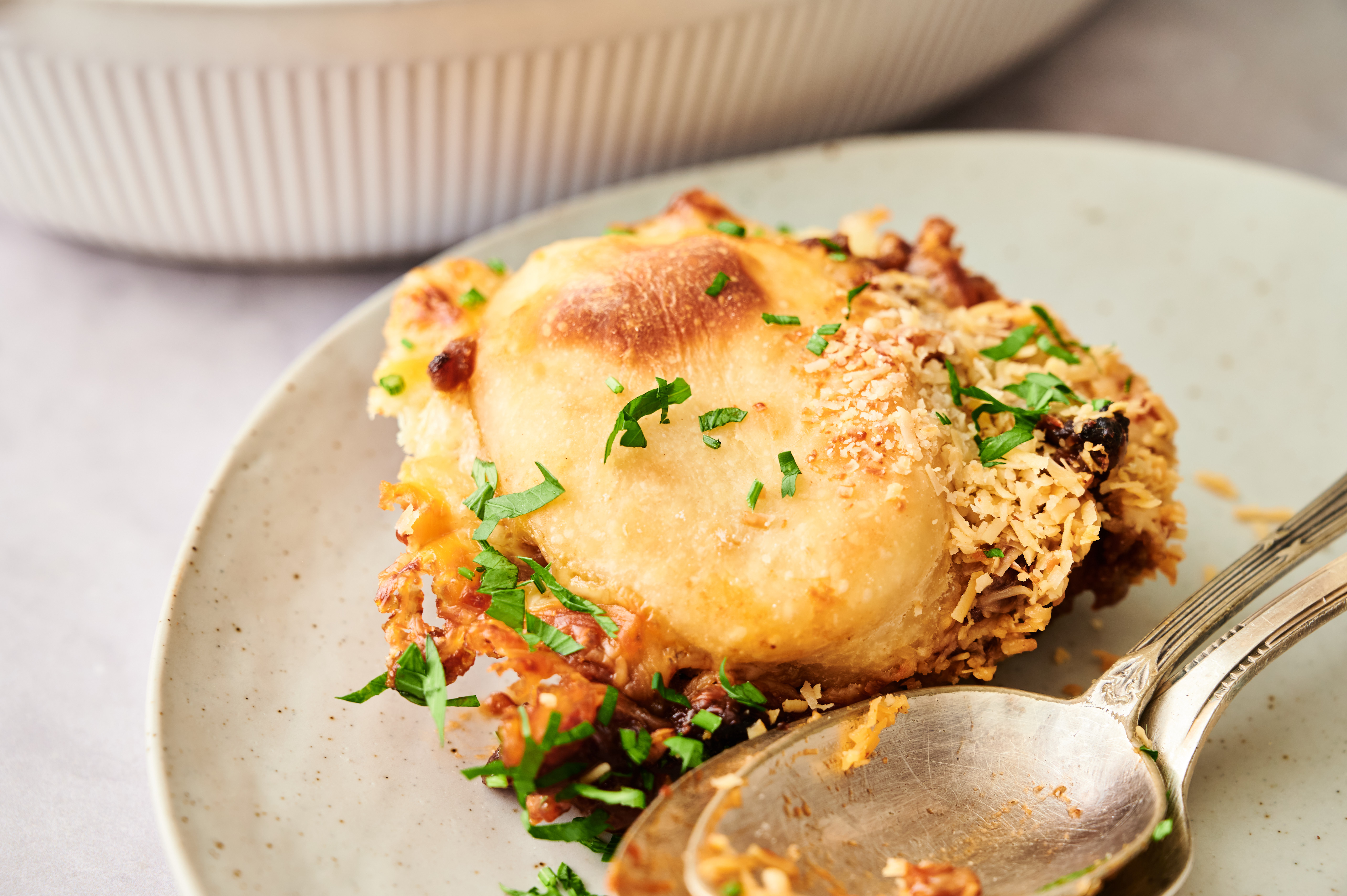 Step 7 -Evenly add the ground beef mixture on top of the biscuit layer.