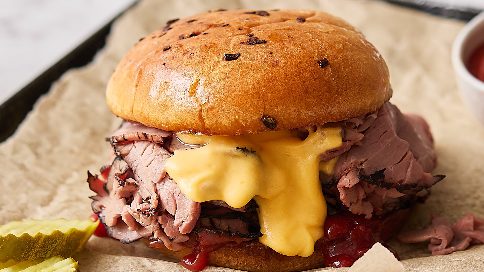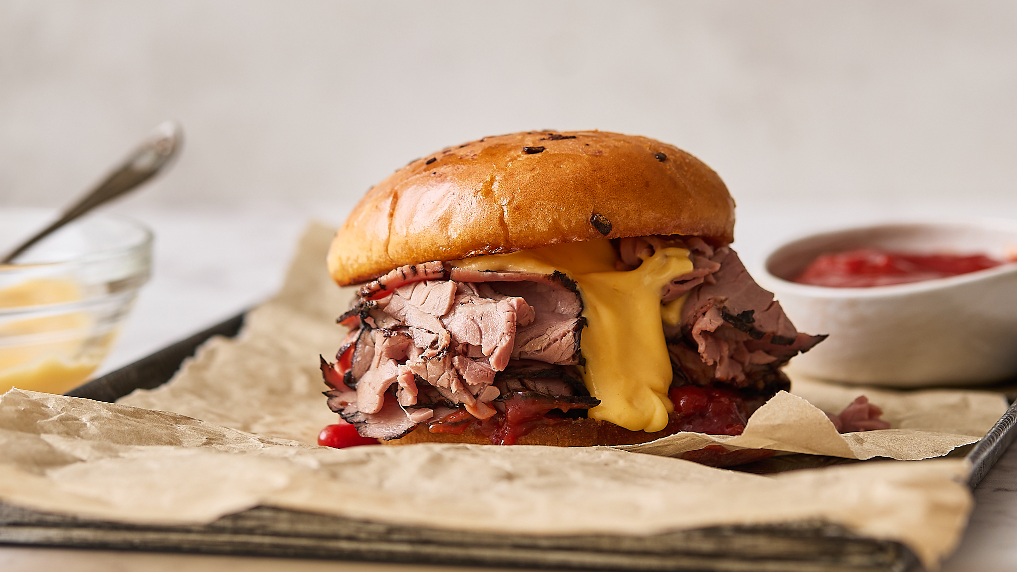 Mmmm, a Beef & Cheddar Sandwich. There's something so wonderful about a hot beef sandwich, already marvelous on its own, but getting topped with a homemade creamy and sharp cheddar sauce? Yum! And all on top of a savory onion bun, too! Add in a second sauce, this one tangy and sweet, and Beef & Cheddar Sandwich becomes a deliciously balanced lunch, ready to eat in just half an hour!