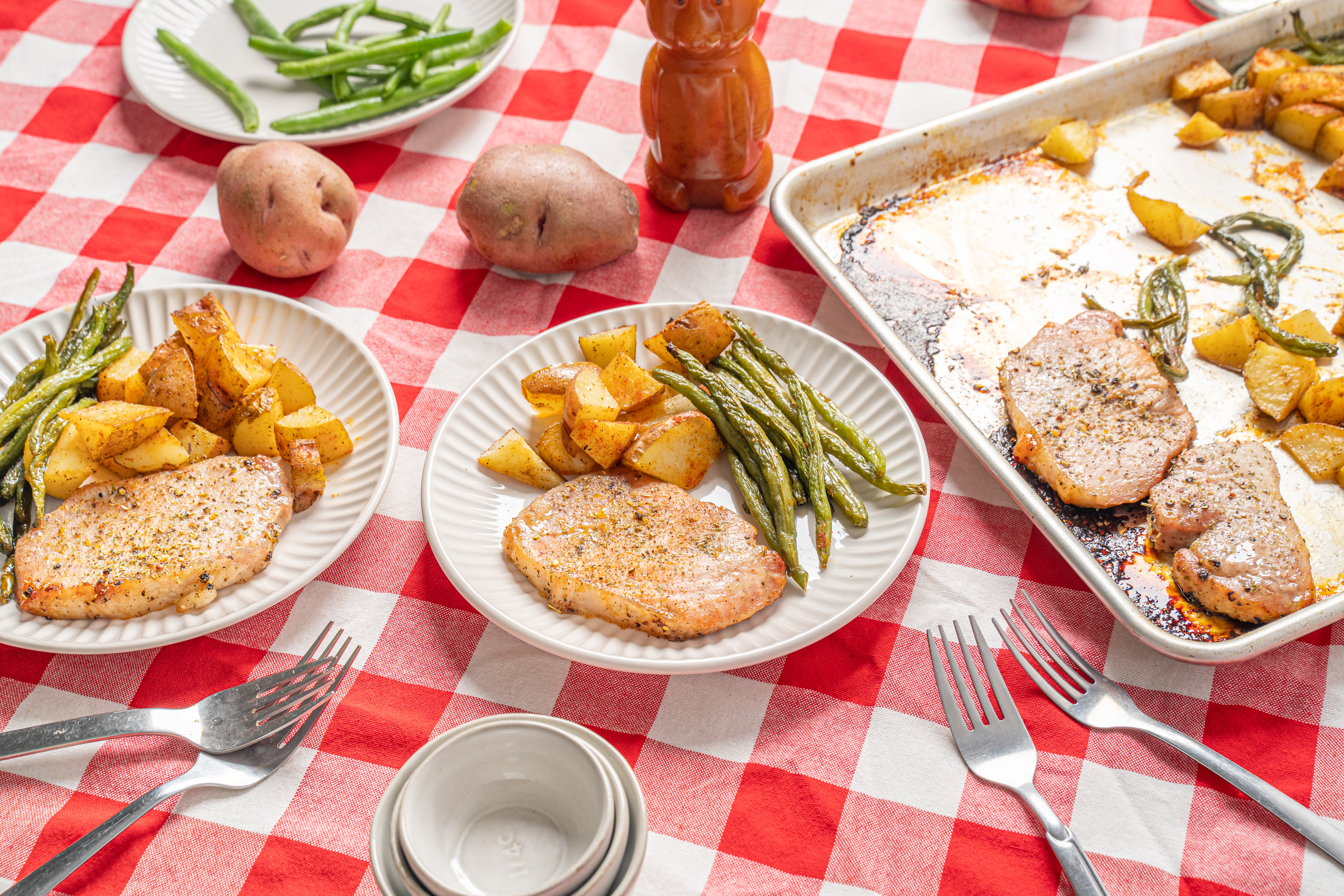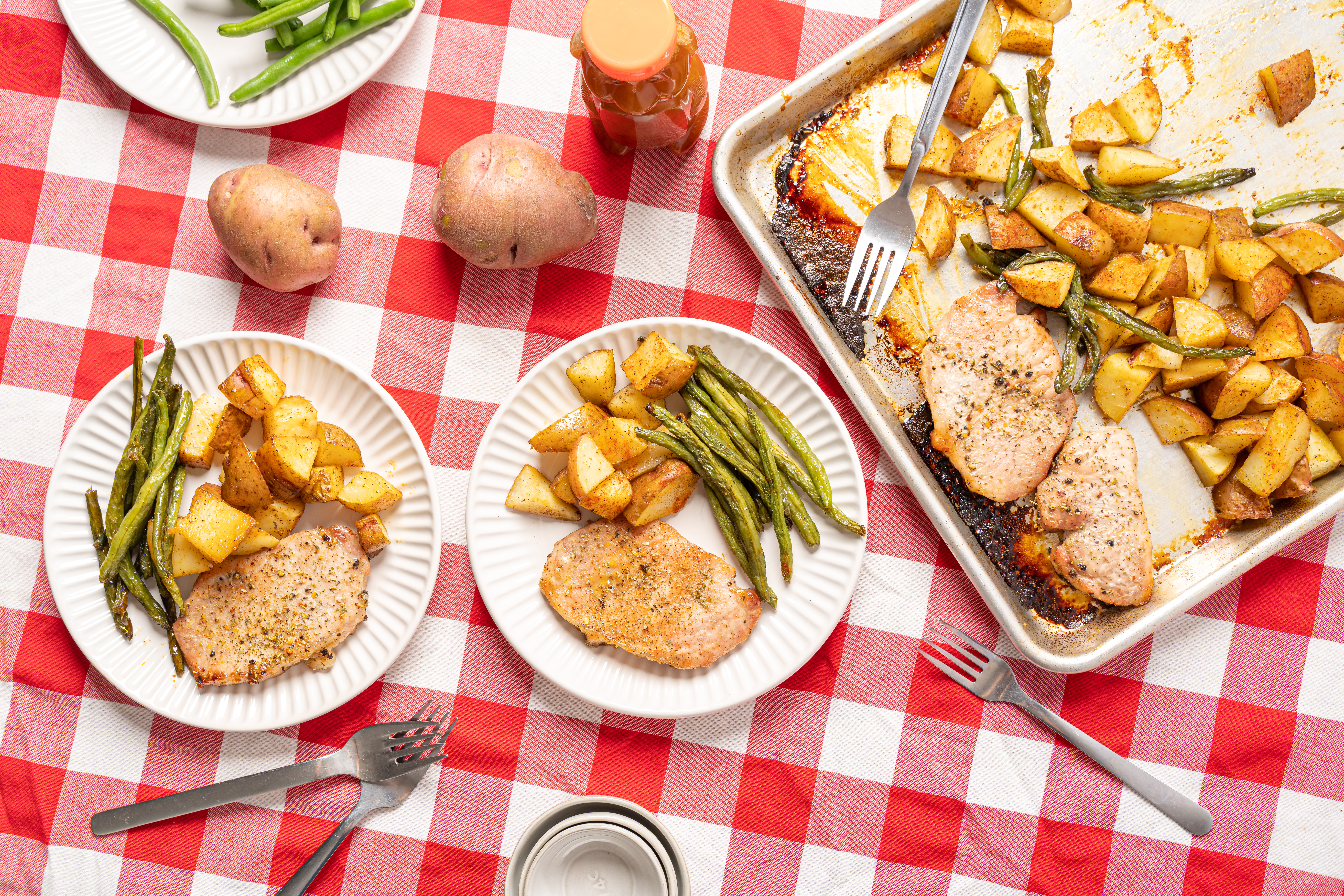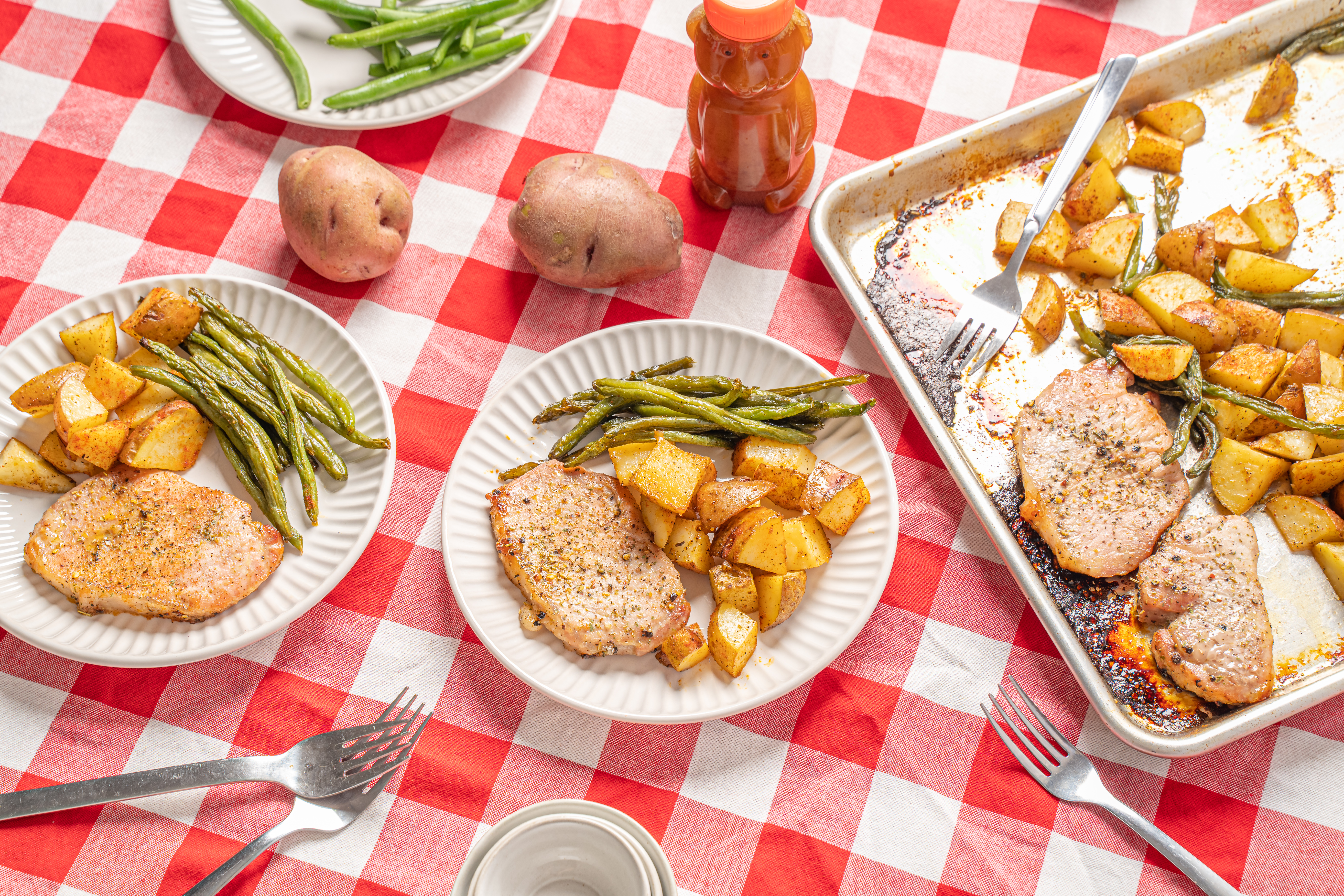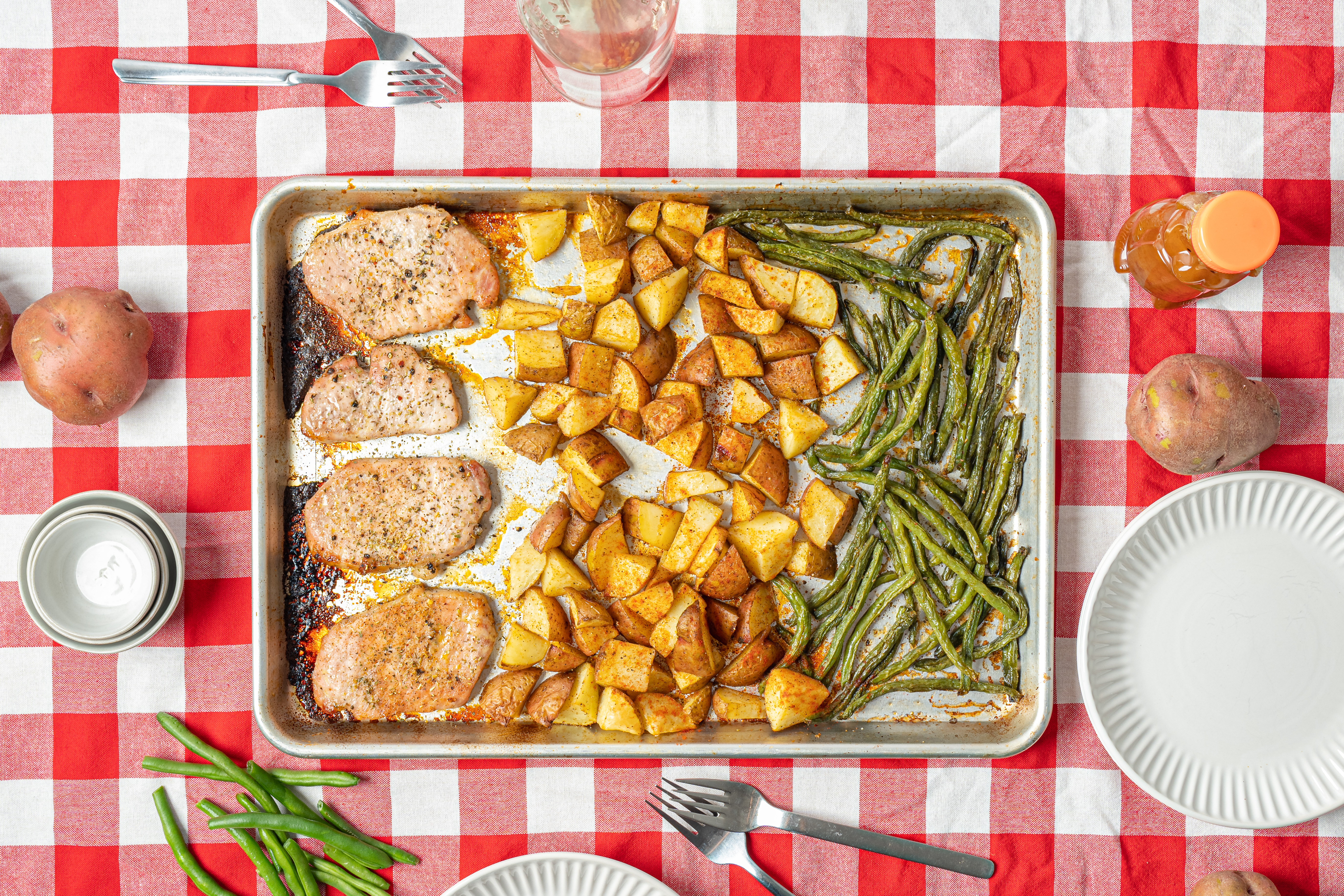 Time to cash in! The Billionaire's Club Pork Chop Dinner has a wealth of flavors ready to impress your discerning tastebuds: crisp green beans, tender red potatoes, and savory pork chops, with the zesty, spicy blend of Creole seasoning to make each bite a goldmine of good tastes! The chops themselves are seasoned with fragrant Italian seasoning and floral, sweet honey to make them the best they can be! And everything is baked on just one sheet! Time to move on up to the high life with this Billionaire's Club Pork Chop Dinner!