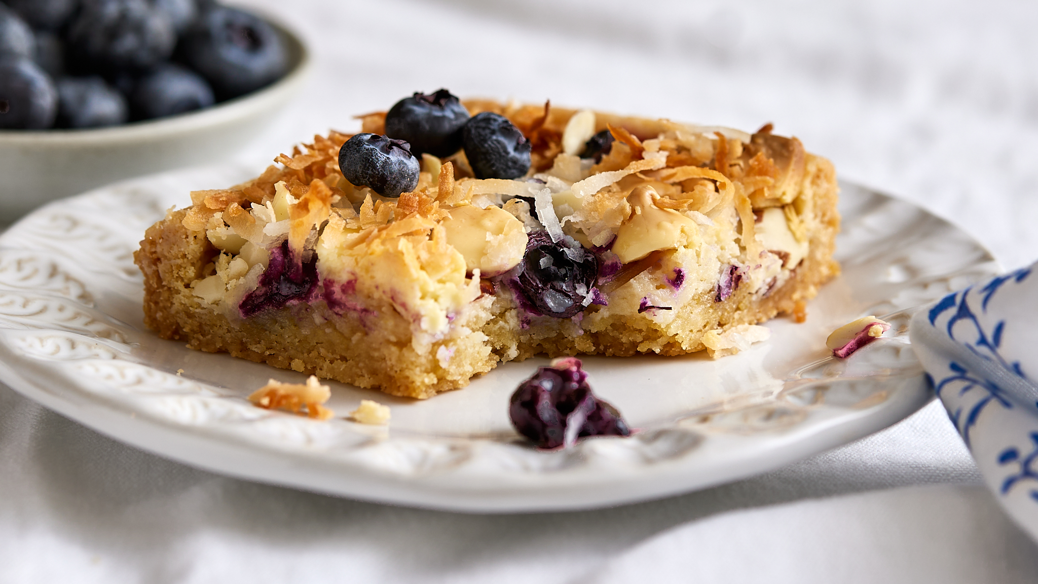 When you need a little treat, no matter what kind of day it's been, these Blueberry Bliss Bars are here to improve it. Any kind of day can always be a bit better, right? These crumbly bites filled with tart blueberries, creamy white chocolate, and crunchy almonds are everything you could ever want to make you feel all the delightful joy that sweet treats bring. Mmm, and that yummy sugar cookie base it rests on could make your day brighter all by itself! These Blueberry Bliss Bars are here to help make you feel better than you did before you bit into them... it's going to be a great day from here on!