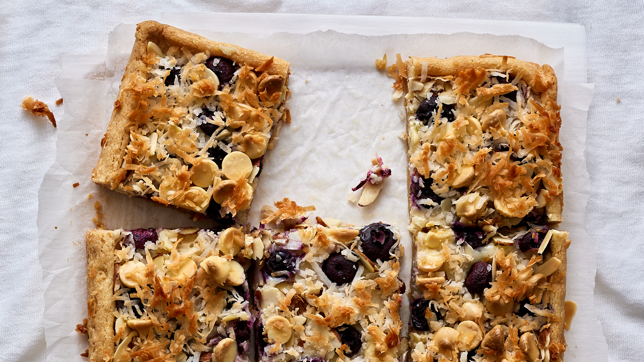 Step 6 -Pour the lemon mixture over the sugar cookie base, then sprinkle with the blueberries, the sliced almonds, the white chocolate chips, and the coconut, in that order.