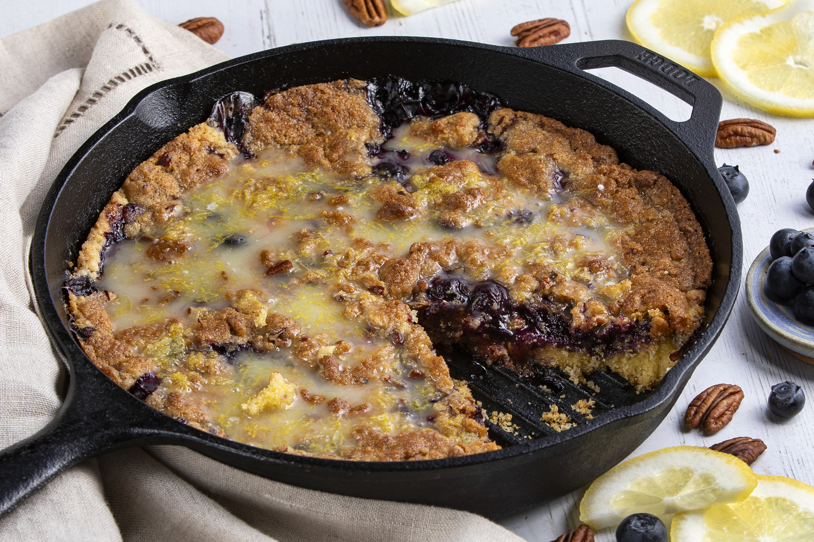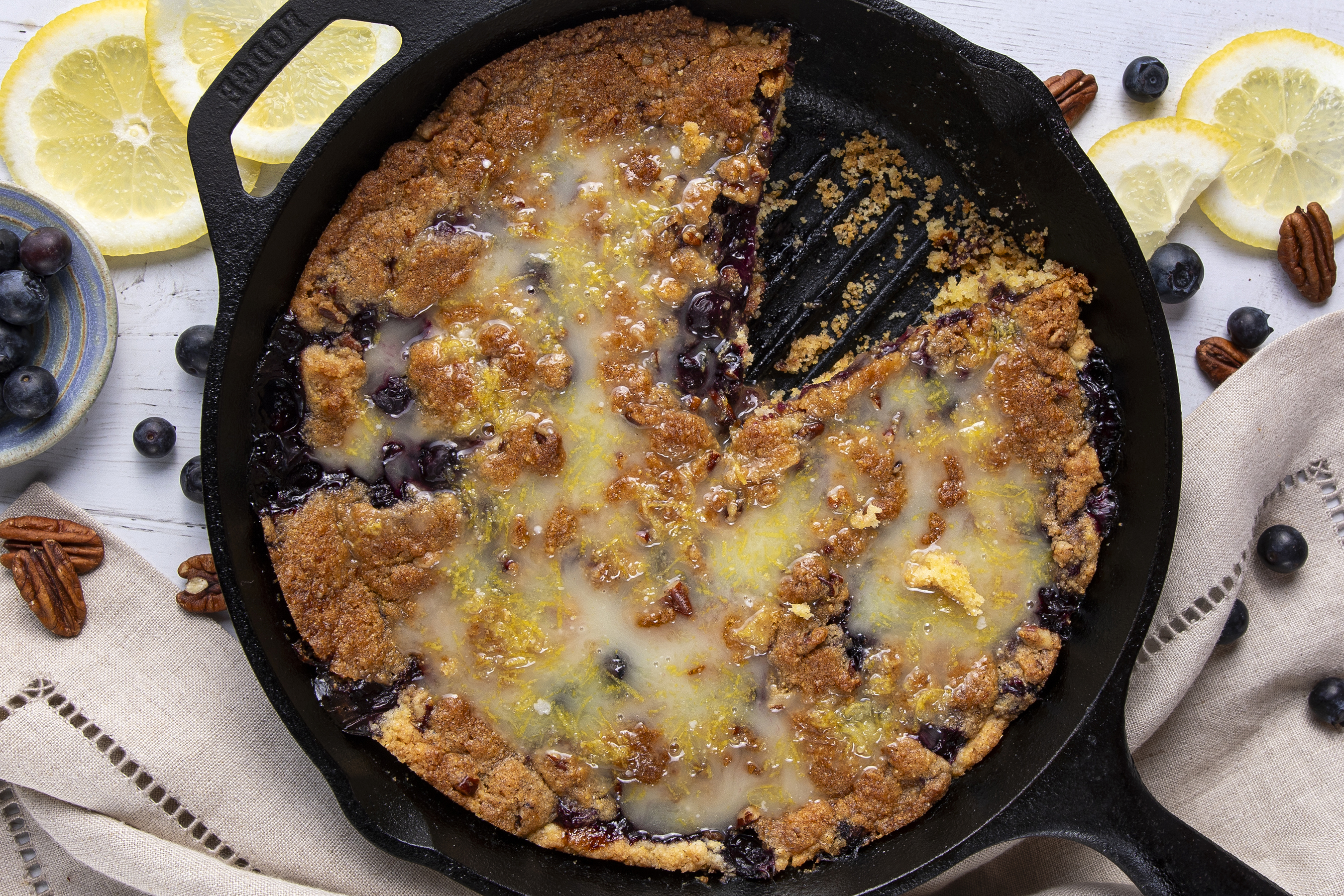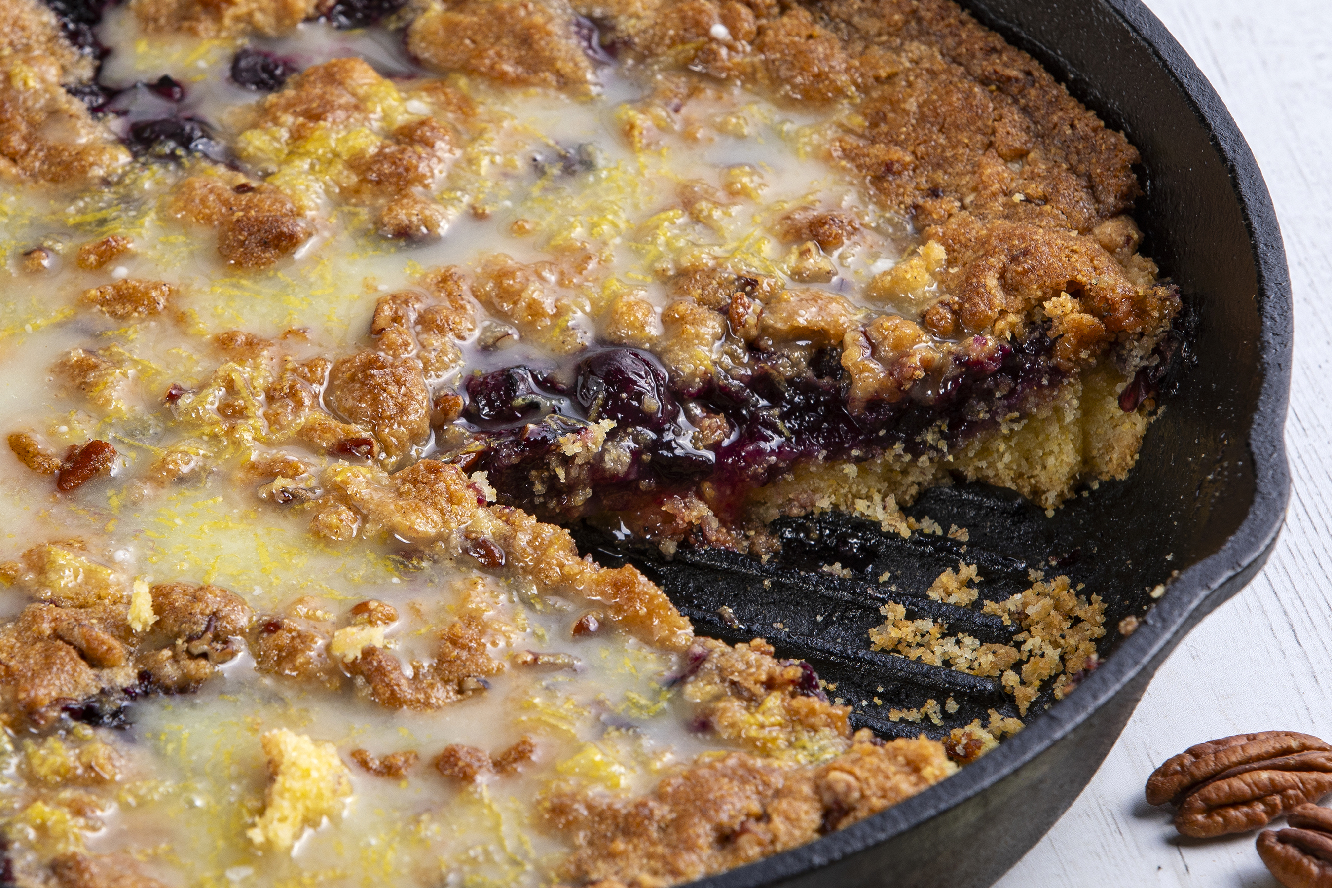 Step 11 -Place the skillet on the middle rack in the oven and bake until the brown sugar mixture is golden-brown and the blueberries are bubbling around the edges, and the internal temperature is between 205 degrees F and 210 degrees F, about 40-45 minutes.