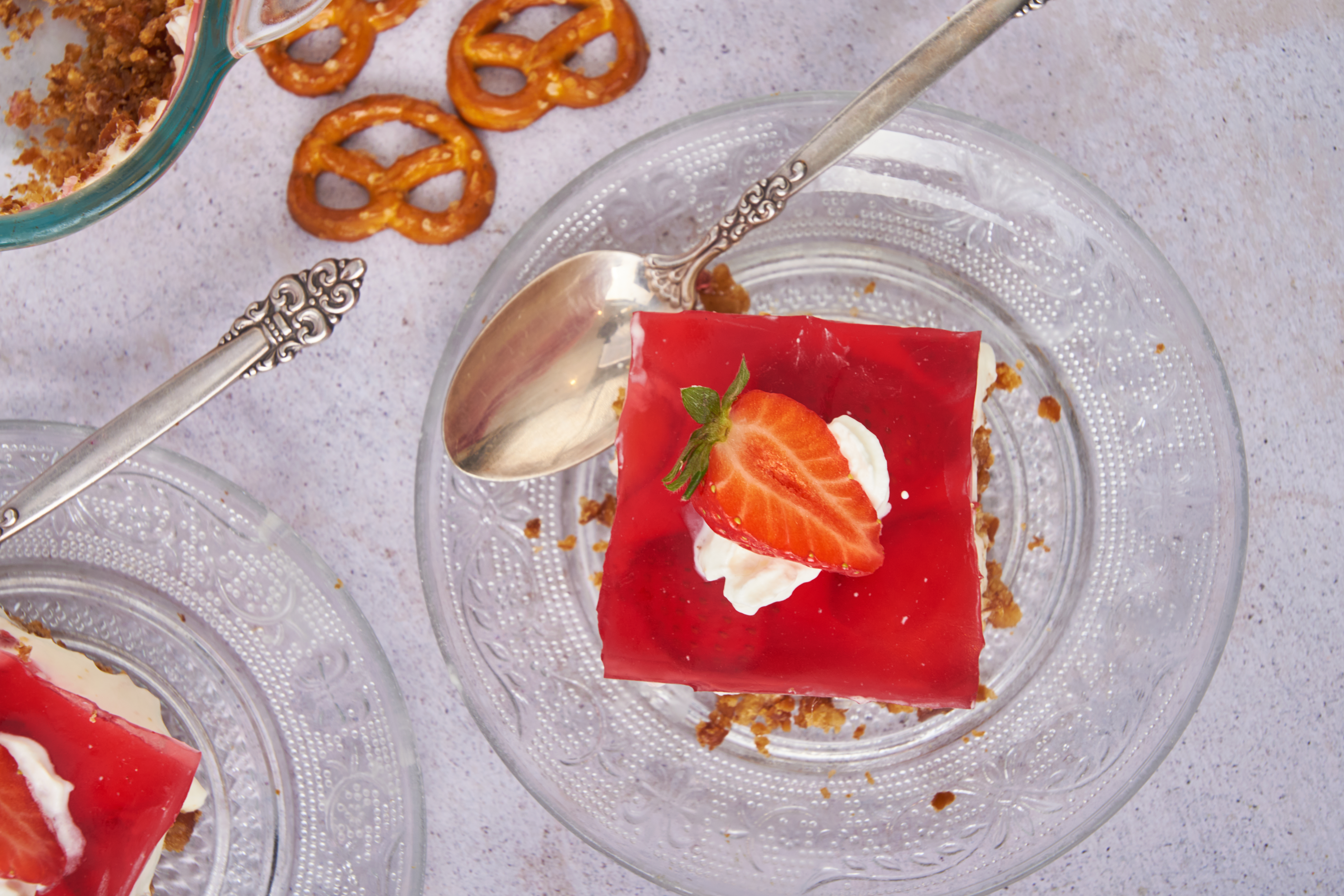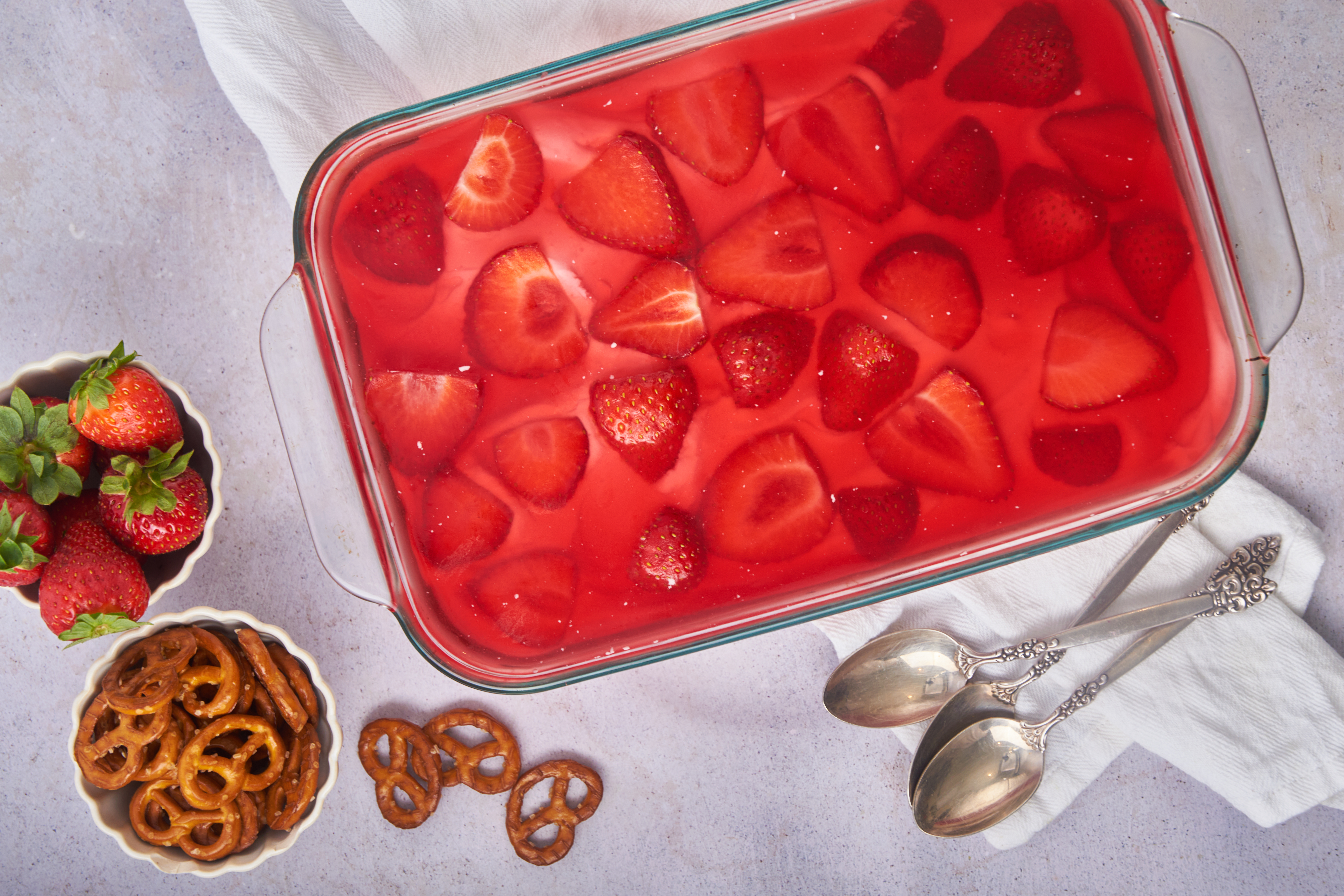 The name's not just for show; this Classic Strawberry Pretzel Delight really is delightful! A crunchy, salty, and brown-sugar-sweetened pretzel crust supports a creamy, tangy, and fluffy cream cheese filling, which would be wonderful just on their own. But it wouldn't be pure joy without the bouncy, summery, ruby-red strawberry topping, complete with plenty of fresh berries! That perfect combination is what makes this Classic Strawberry Pretzel Delight a true marvel. It's a berries-and-cream beauty, just waiting to impress!