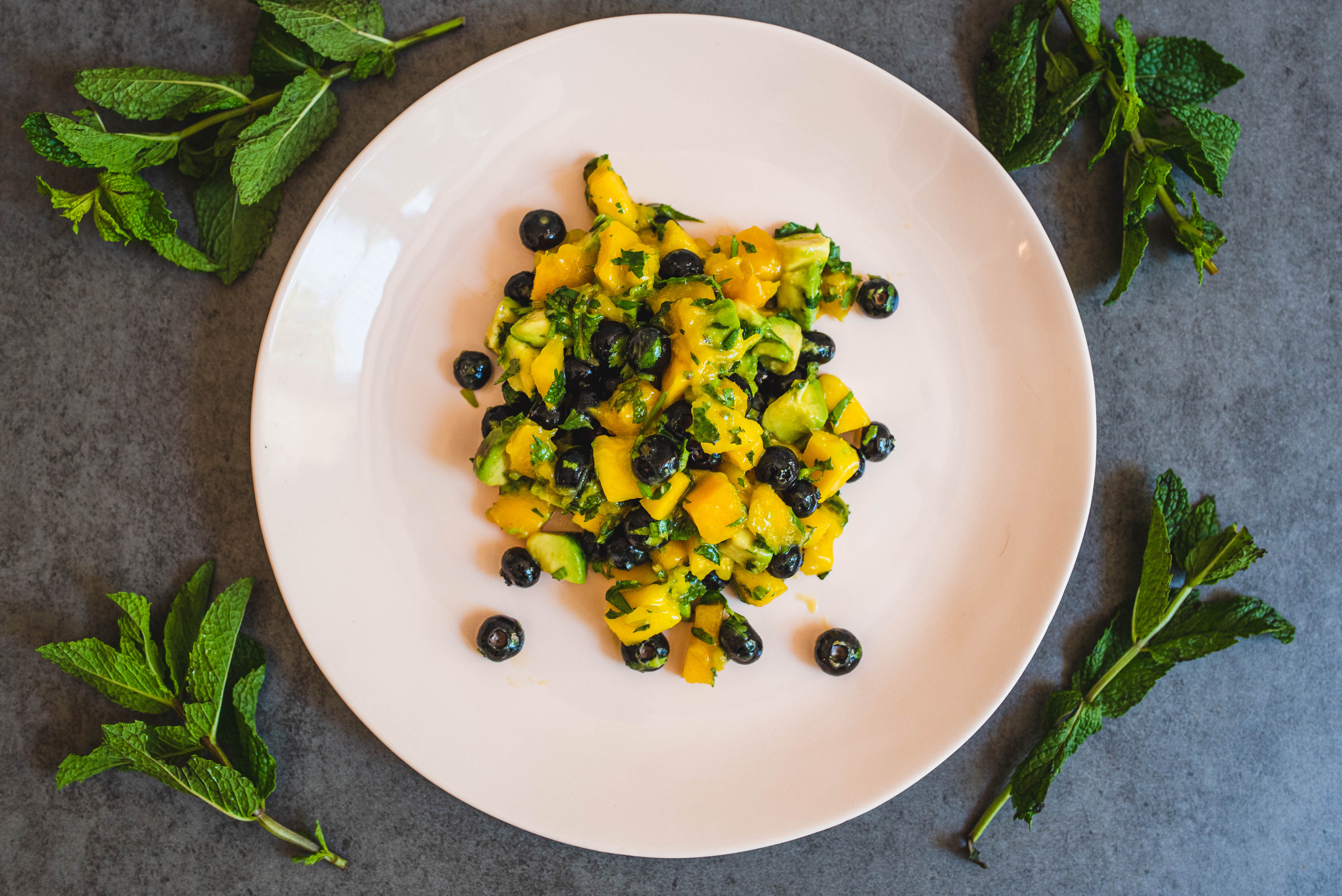 Step 1 -In a medium bowl, combine the mangoes, the avocado, the blueberries, the mint, the basil, and the cilantro.