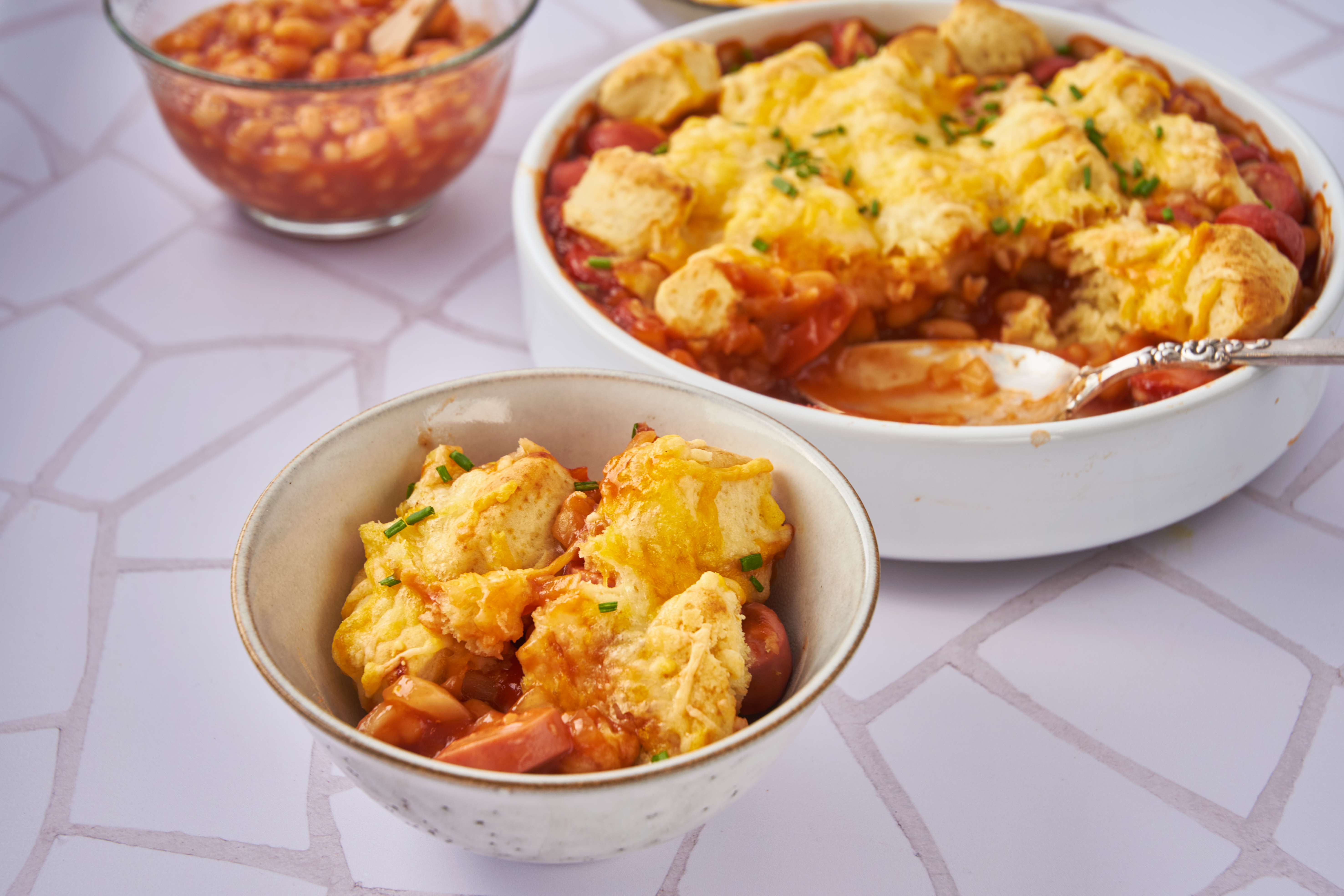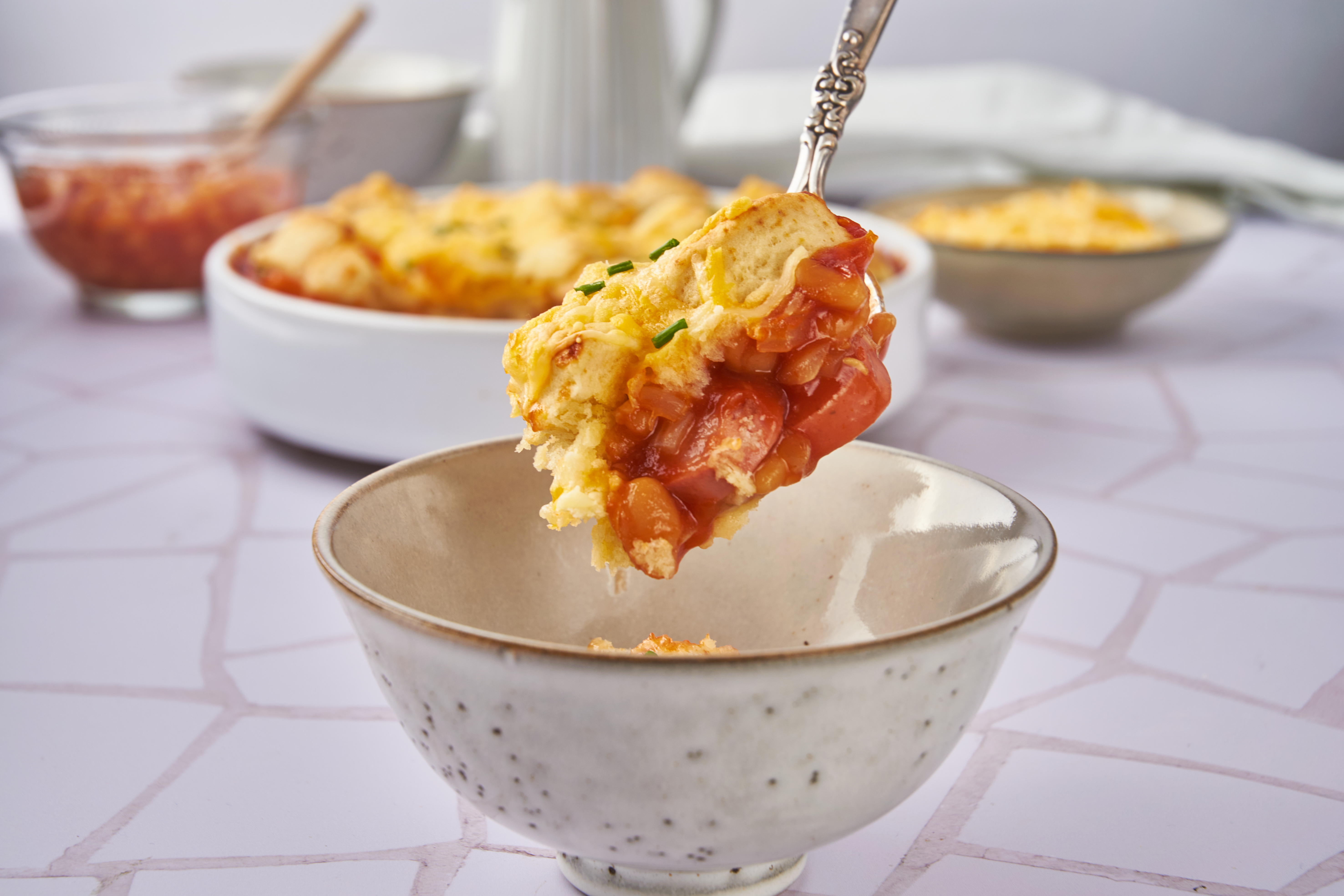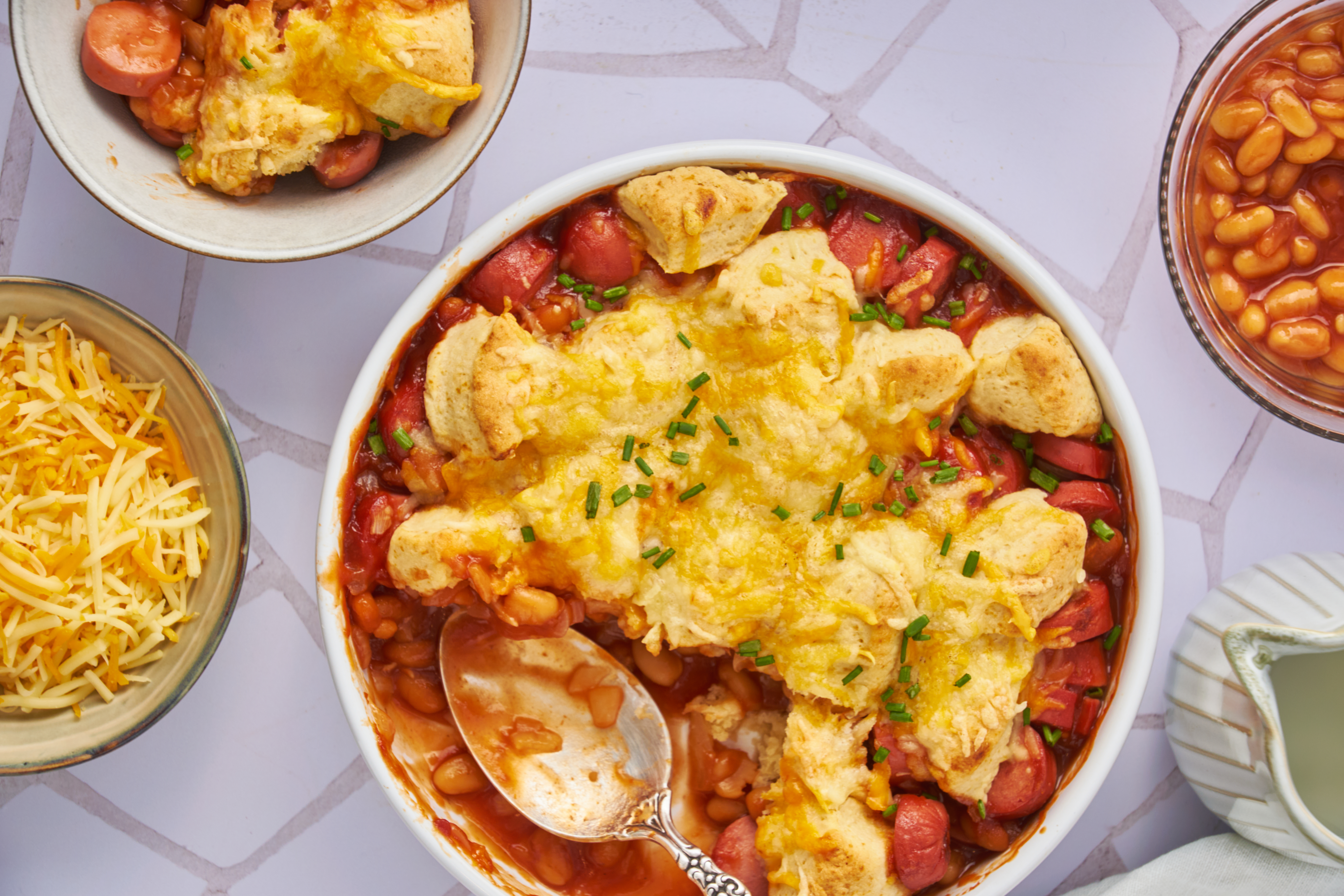 There is nothing like the nostalgia of eating food that you recall from your childhood. This Dog-Gone-Good Bake will certainly put you right back at grandma's house on a Sunday afternoon. Loaded with plump hot dogs, always-tasty pork and beans, and flavorful onions, you know it's going to be good! That all gets soaked in a sweet and savory, ketchup-and-brown-sugar-based sauce, topped with Southern-style buttermilk biscuits, and a generous layer of deliciously melted cheddar cheese. This piece of the past will be relished by all, and it will certainly keep you coming back for more. Dog-Gone-Good Bake is just the reminder you've been looking for. Dog gone it, it's just like grandma used to make!