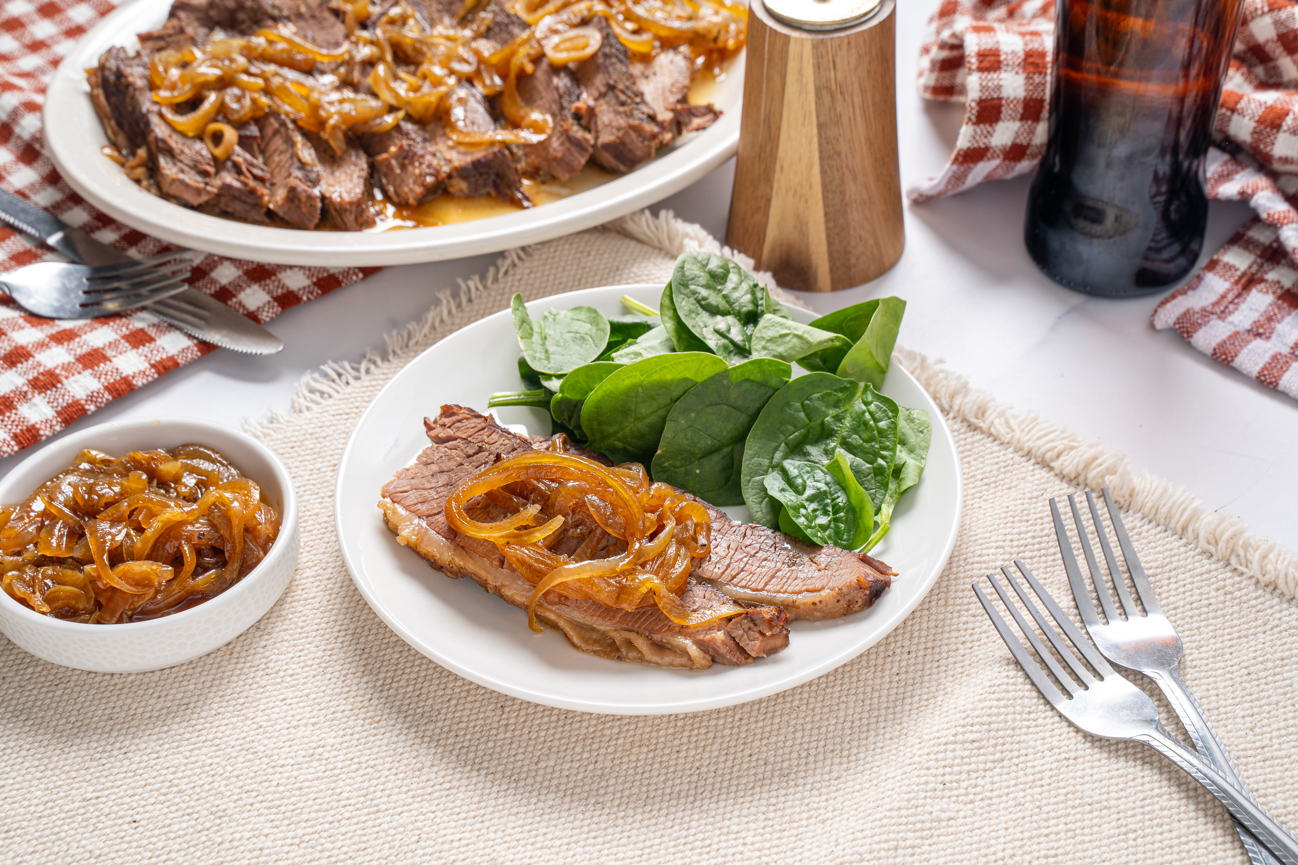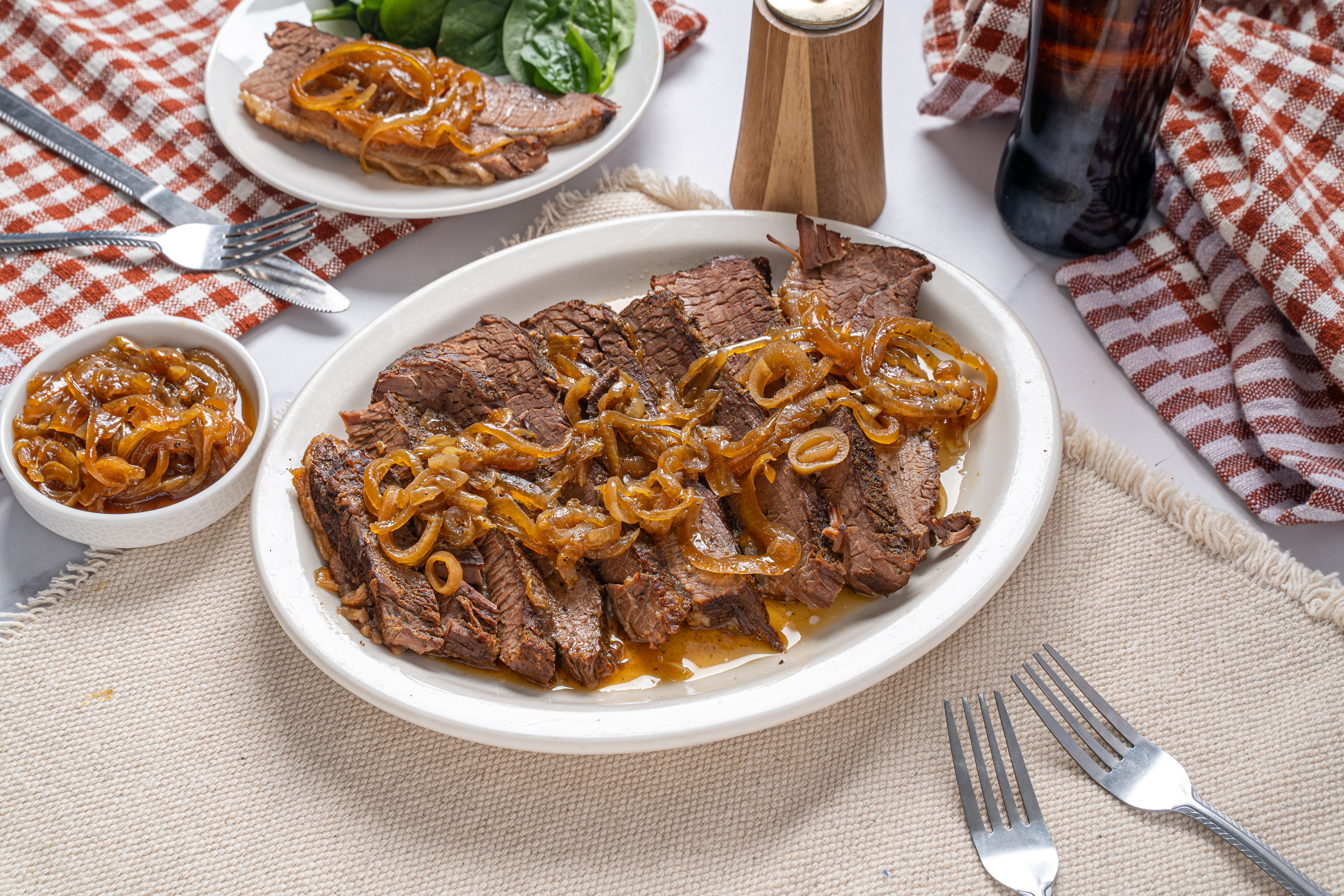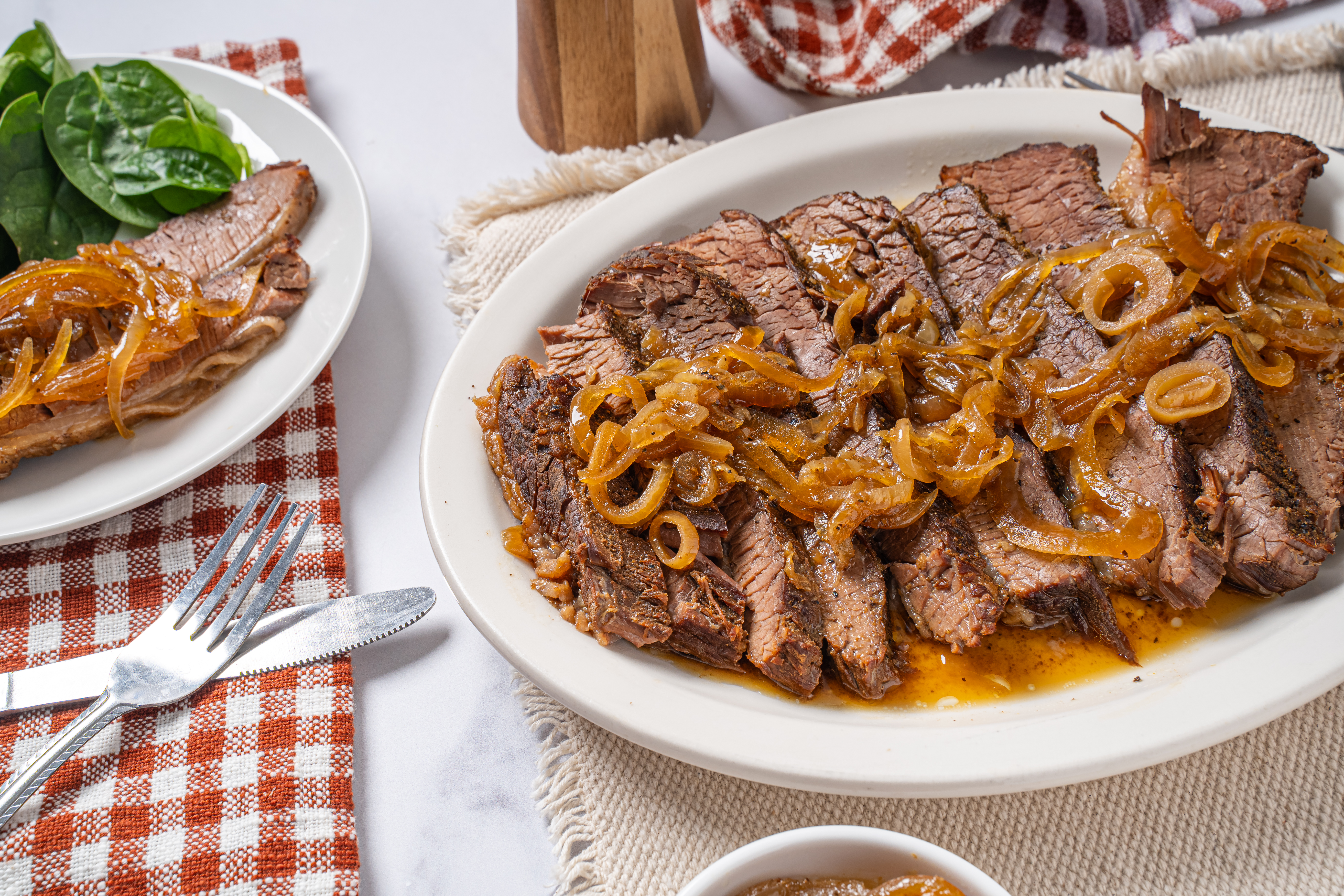 Step 9 -Serve the brisket drizzled with the gravy and topped with the onions.