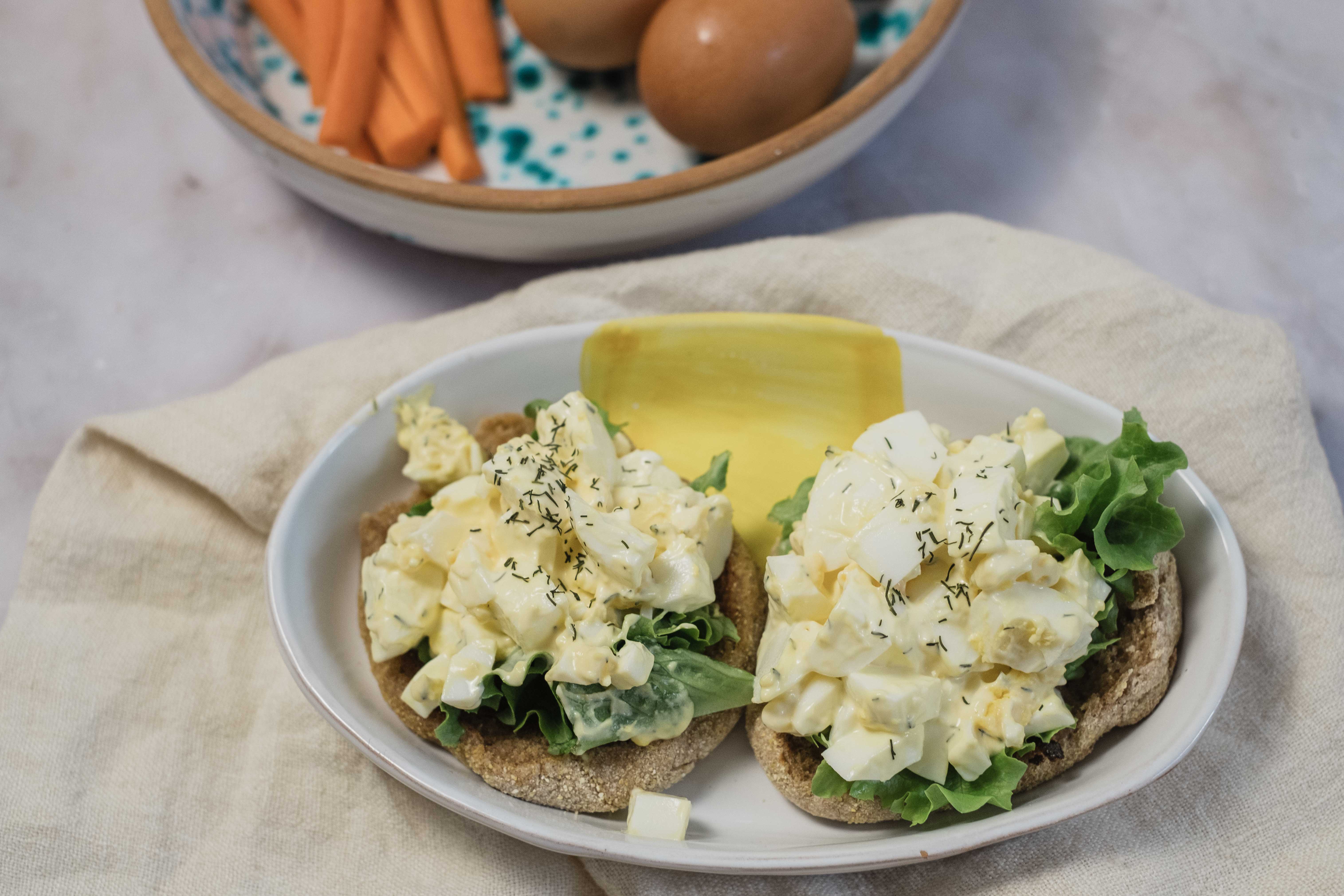 The Egg Salad Muffin is a wonderfully refreshing lunch that can be made in a hurry! Chopped, savory, hard-boiled eggs are mixed with herbaceous carrot tops and a touch of creamy mayonnaise, all on top of crisp, toasted egg muffins. Sounds wonderful, right?! Egg Salad Muffin is simple but filling and so tasty; not a bad way to start the day!