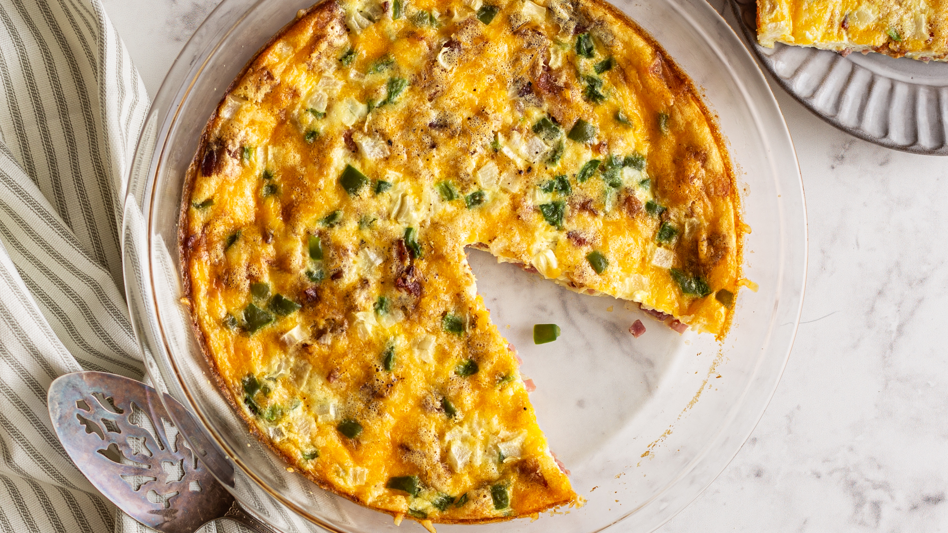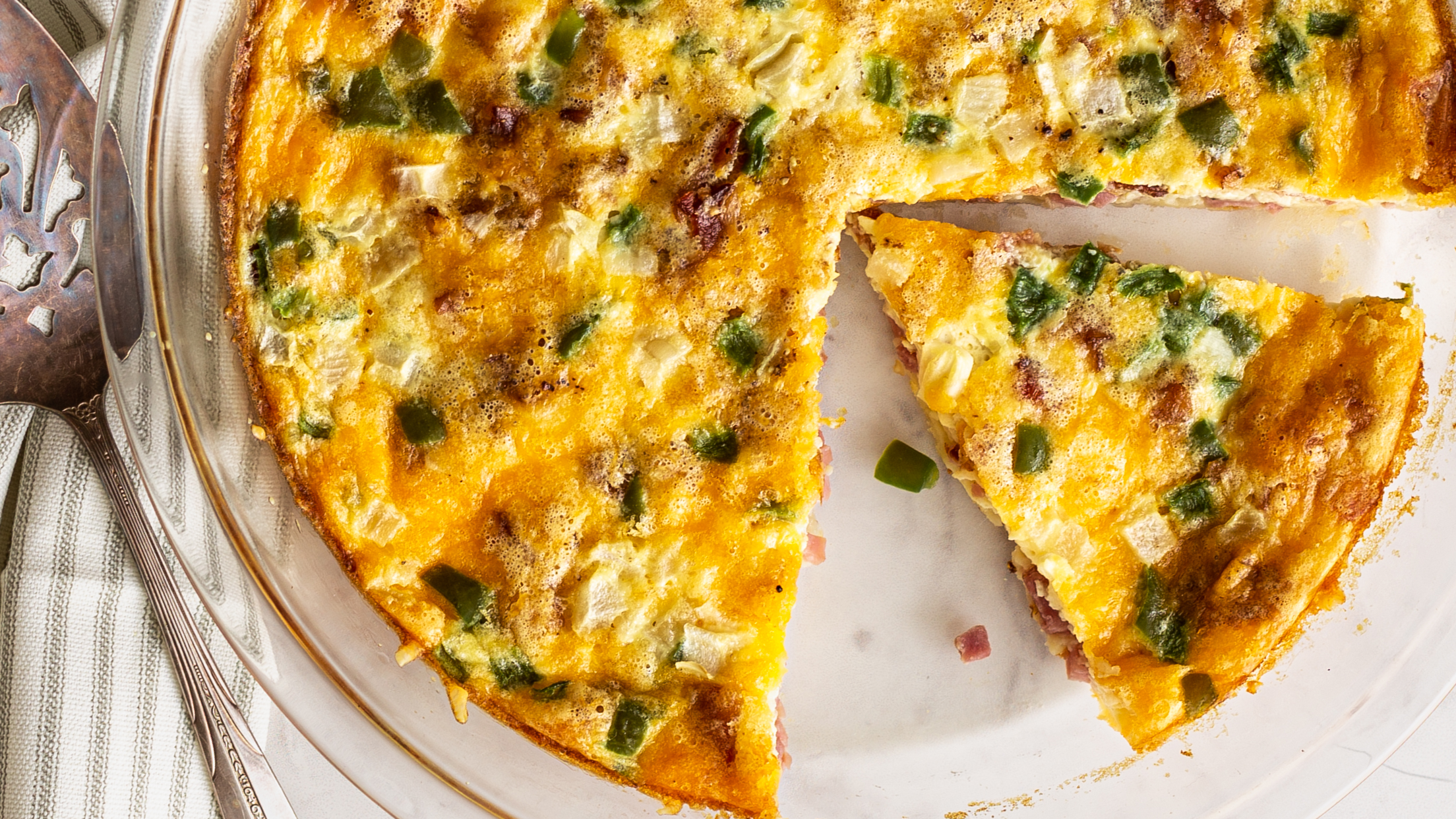 Is Ham N' Cheese Pie a pie or a quiche? Hard to say for sure, but it's delicious no matter its label! Ham N' Cheese Pie is loaded with savory ham, creamy Swiss cheese, sharp cheddar, and plenty of bacon, all within a fluffy, seasoned bed of eggs! You can just melt away into the melty goodness of this Ham N' Cheese Pie; it's not just a breakfast of champions, it's the champion of breakfast!