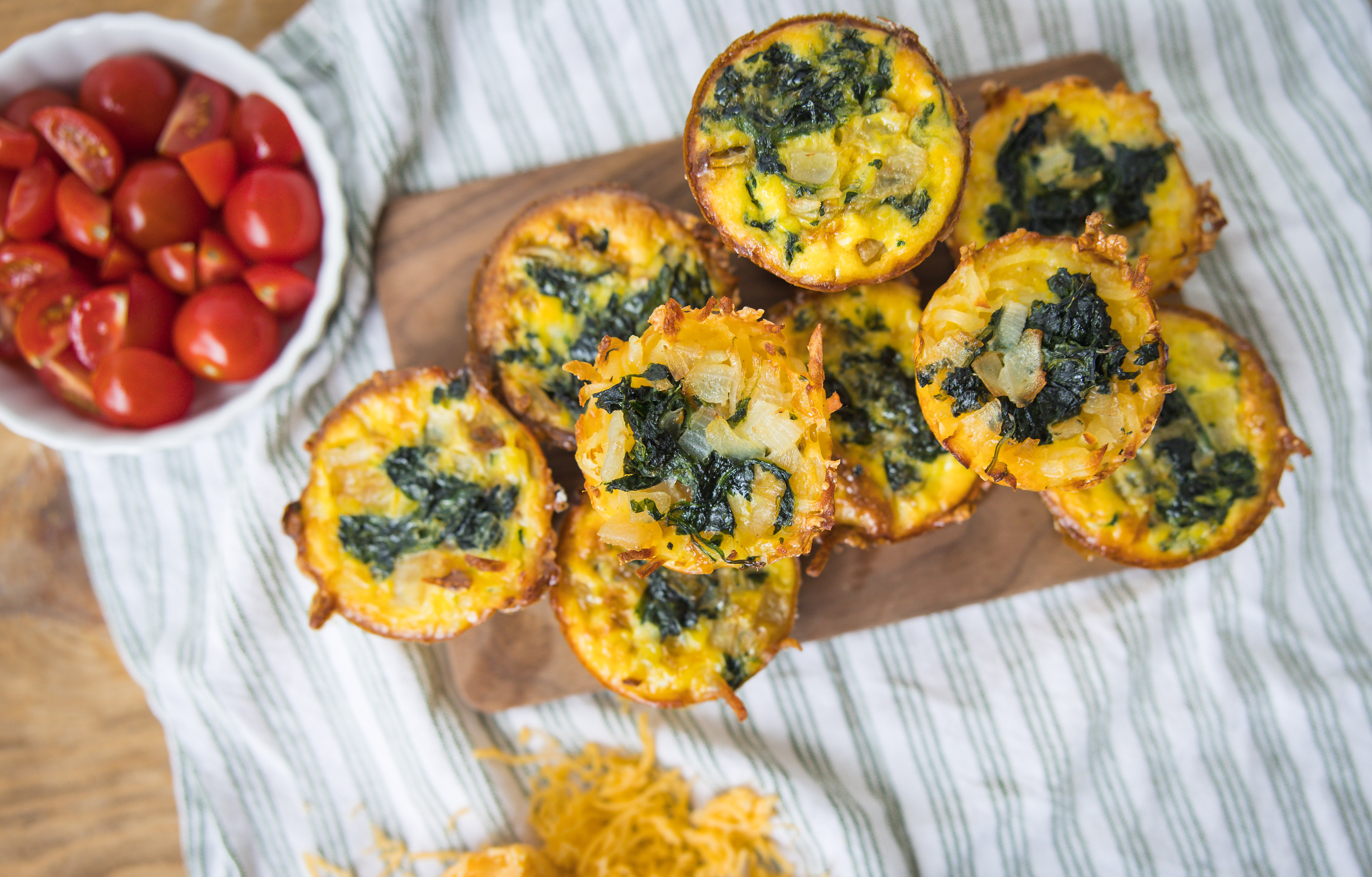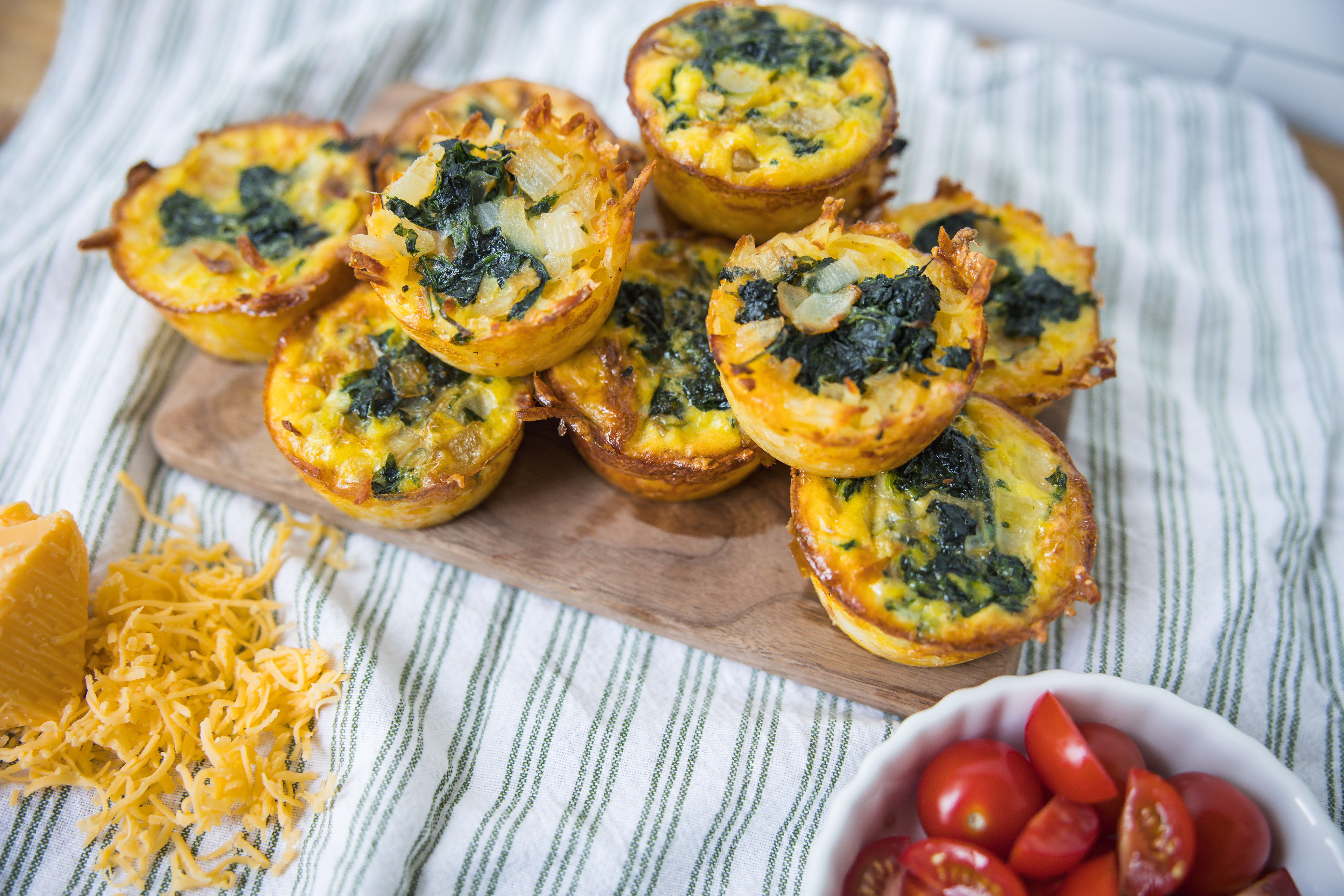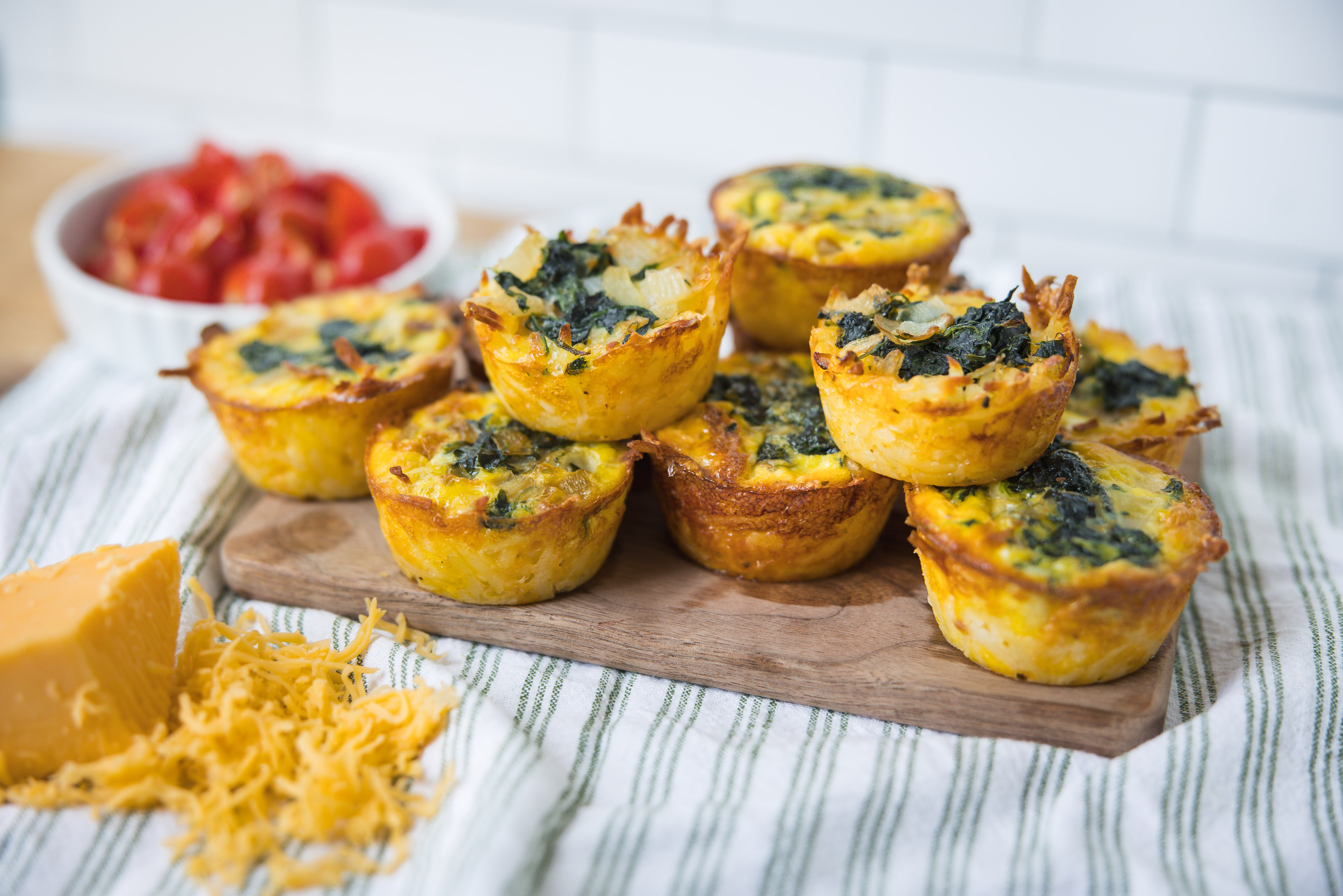 Huddle up! Hash Brown Huddle is an egg bite snack with a little bit extra... or a lot extra when it comes to flavor! Each of these tender little savory egg bites are loaded with butter-sautéed onions and spinach, and then are topped with fresh tomatoes and melty cheese. But then they get cooked in crispy hash brown cups! Hash Brown Huddle is perfect for getting you psyched up for the day!