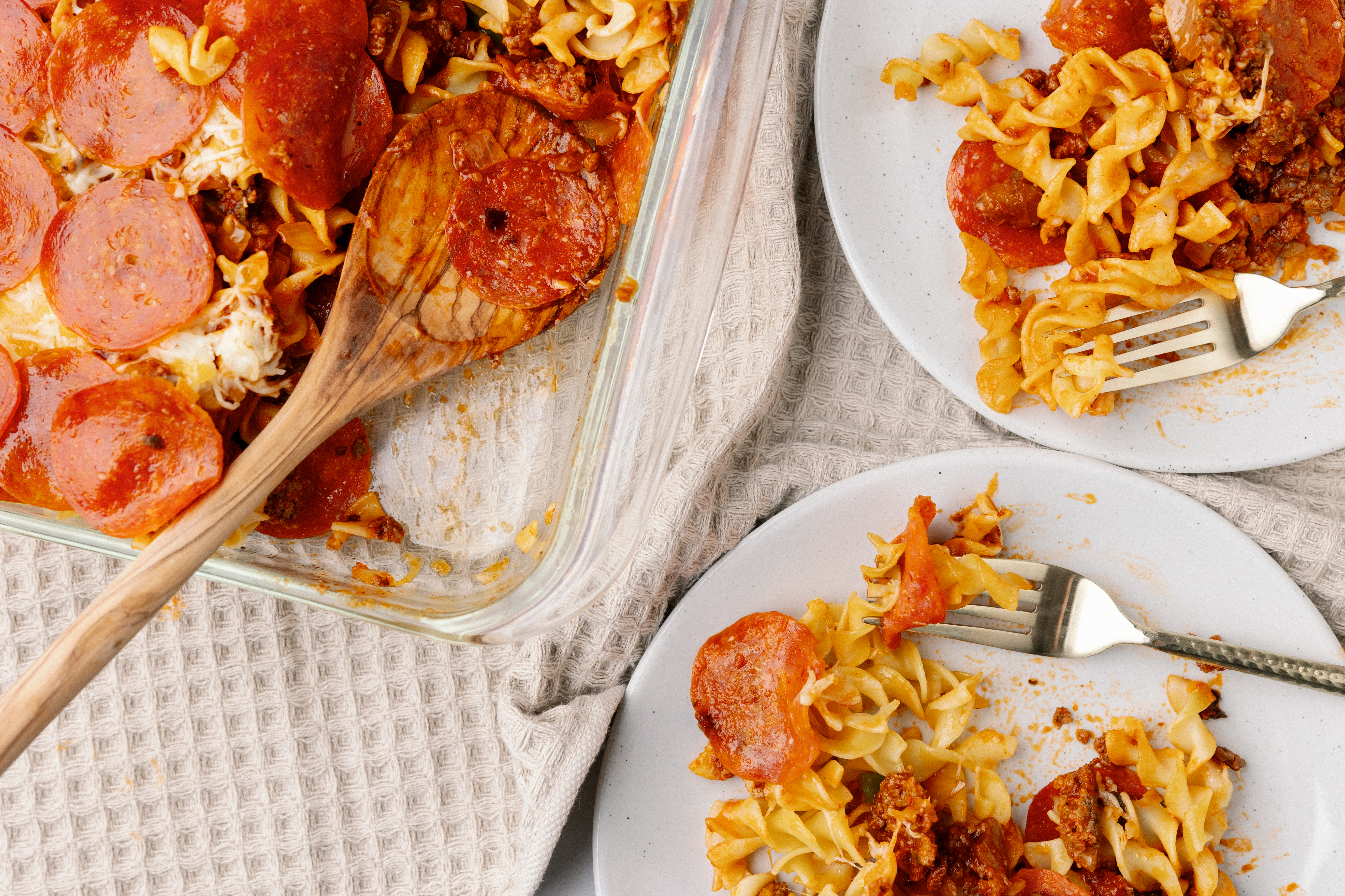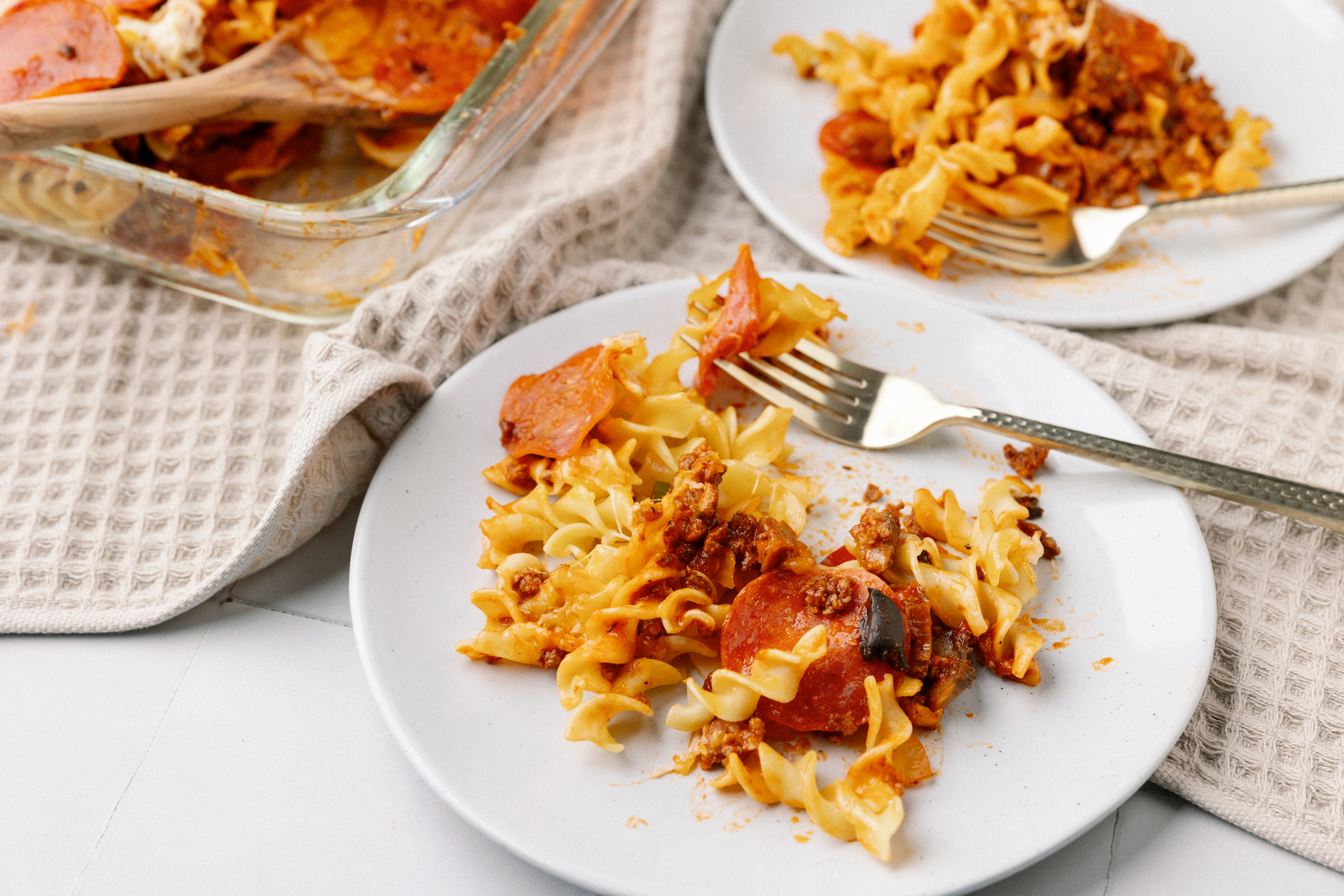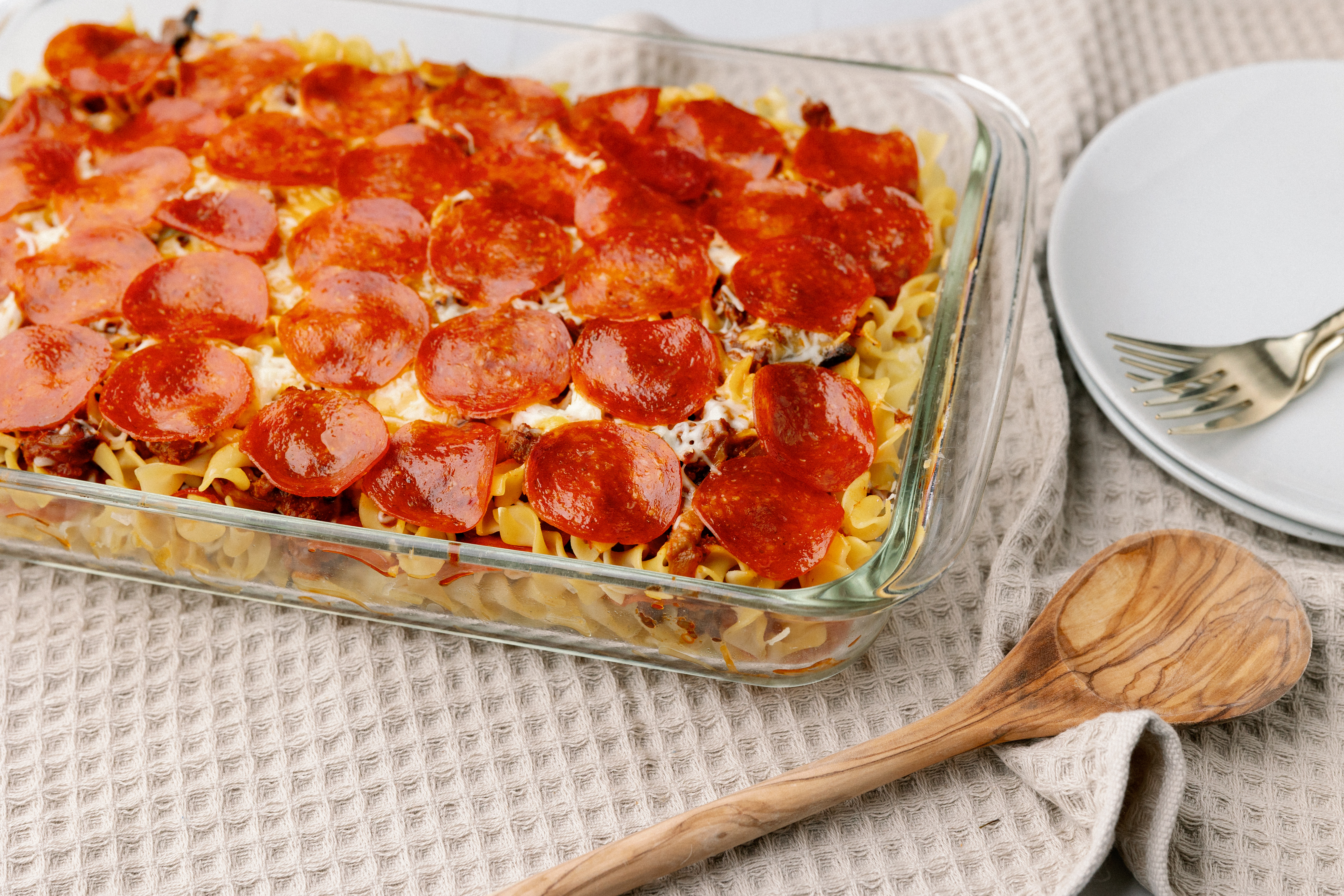 With a dish this filling, it's no wonder we call it the Hearty Pizza Noodle Bake! Layers of buttery egg noodles sandwich melty, sharp cheese and spicy, savory pepperoni, which are both nourishing and oh-so-delicious. But then, on top of all of that, there are plenty of other classic pizza toppings, such as mushrooms and green peppers, all in a rich, bright, and sweet pizza meat sauce! Yes, Hearty Pizza Noodle Bake delivers the goods with all the pizza satisfaction you could ever want!