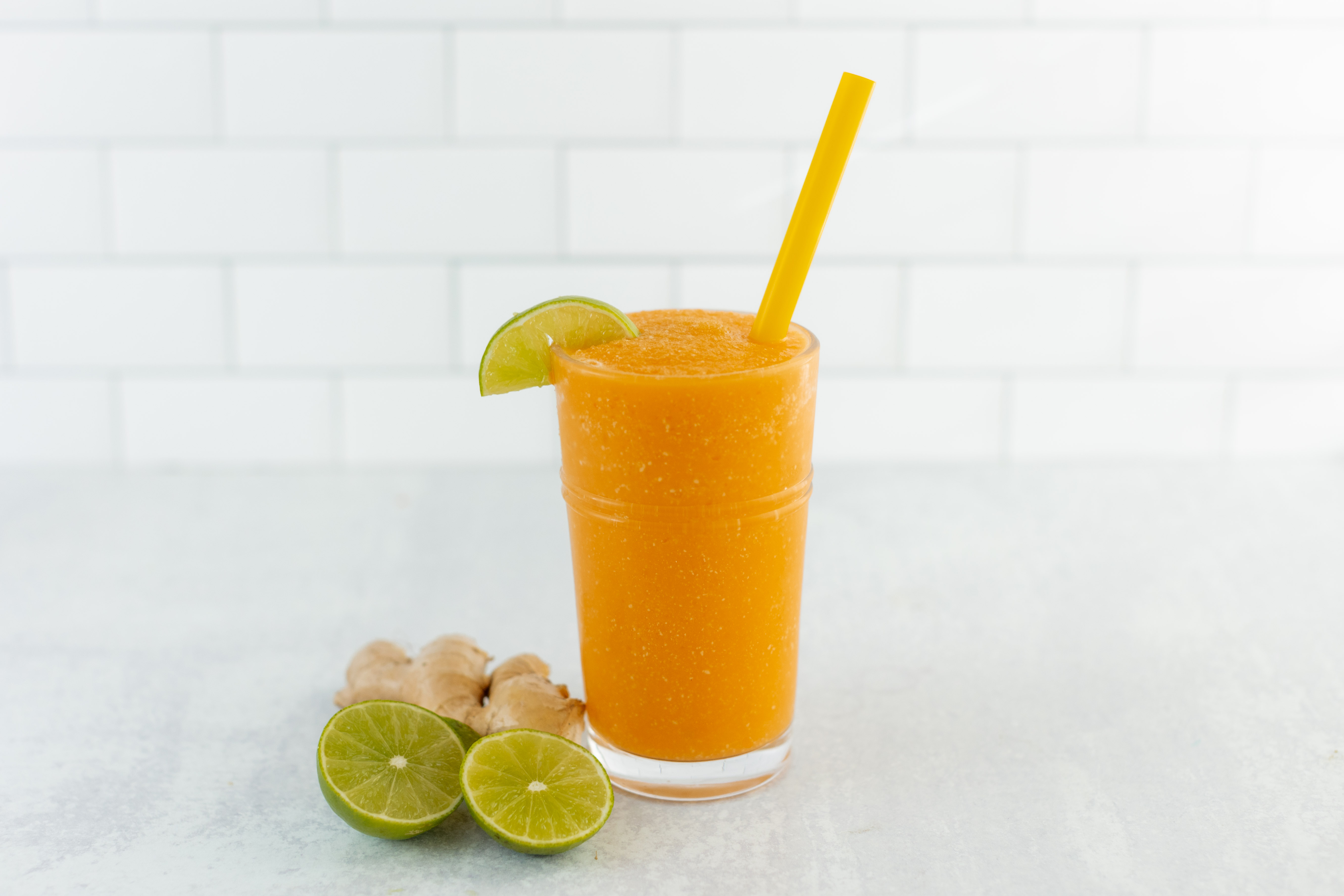 Step 1 -In a blender, add the carrot juice, the pineapple cubes, the bananas, the ginger, the cashew nuts, and the juice of 1 of the limes and blend until smooth.