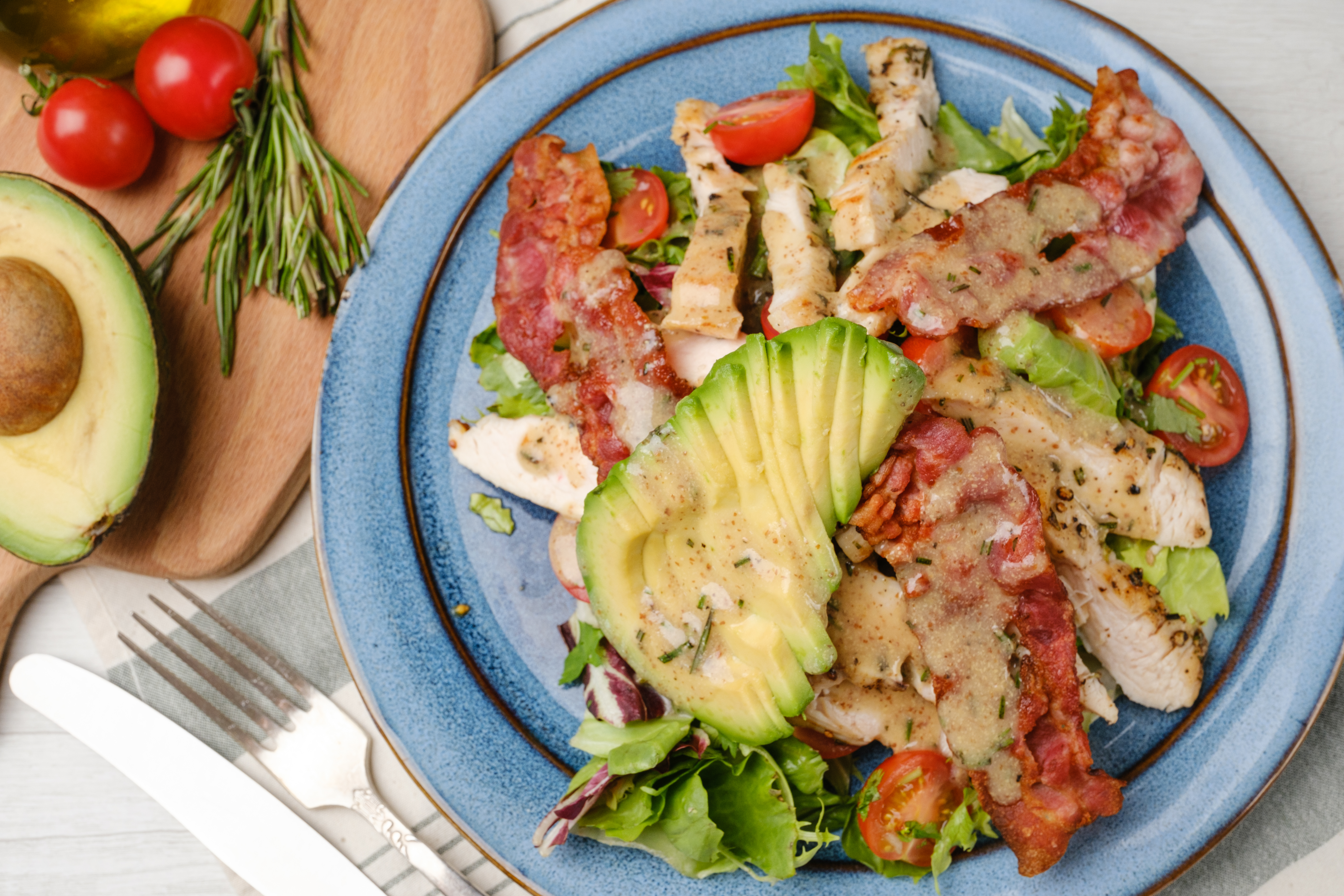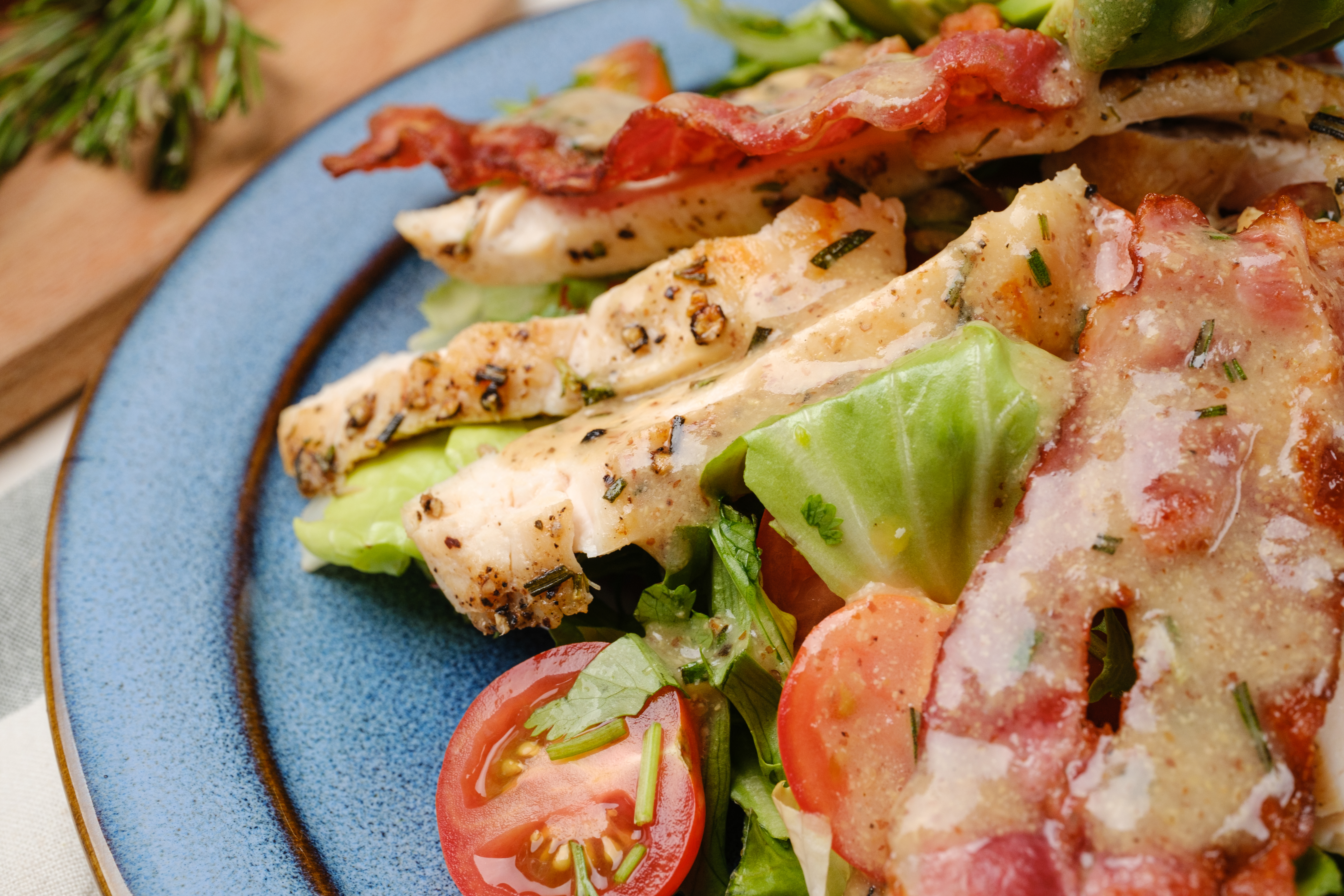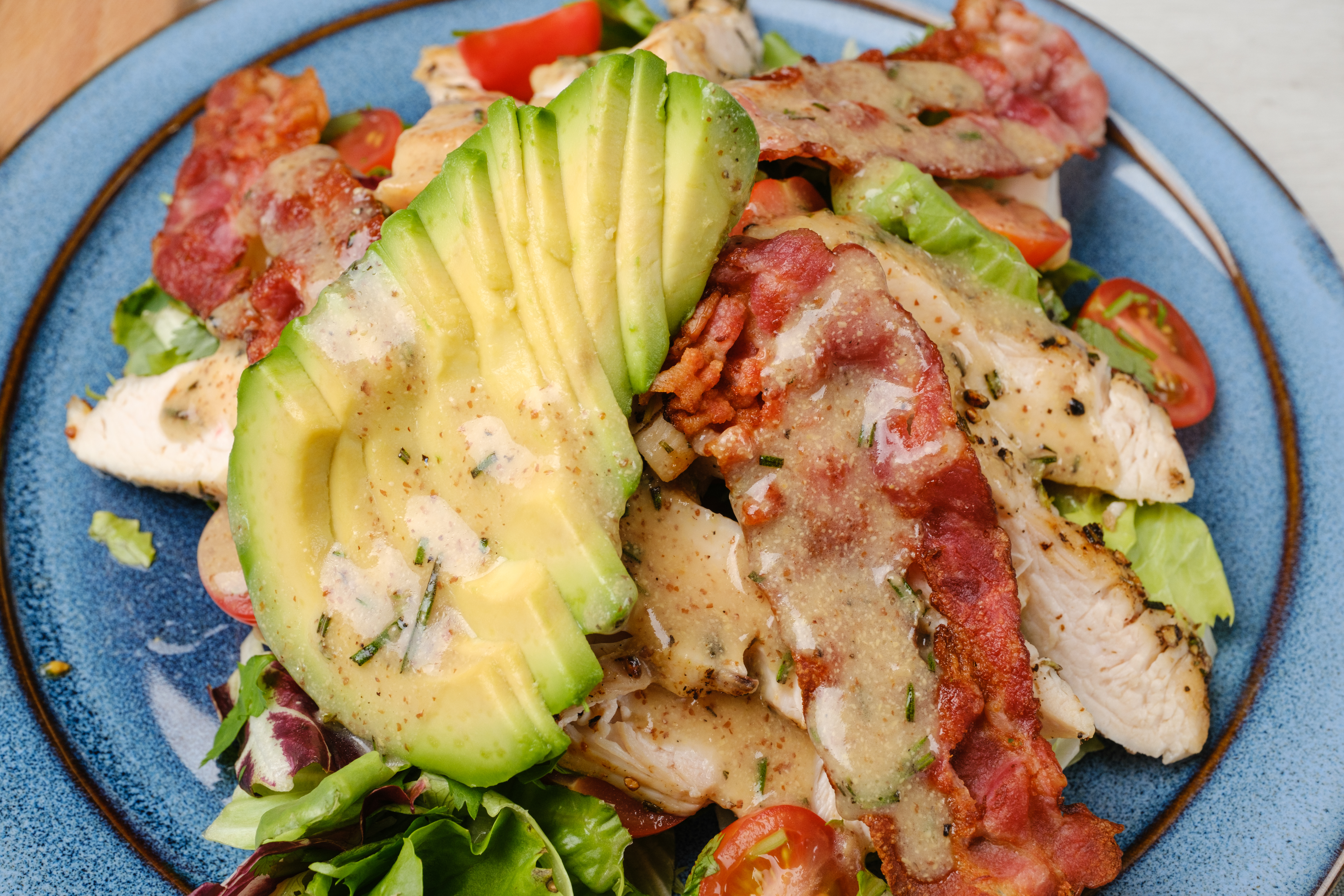 Step 10 -Top the salad with the sliced chicken, the bacon, and the avocado.