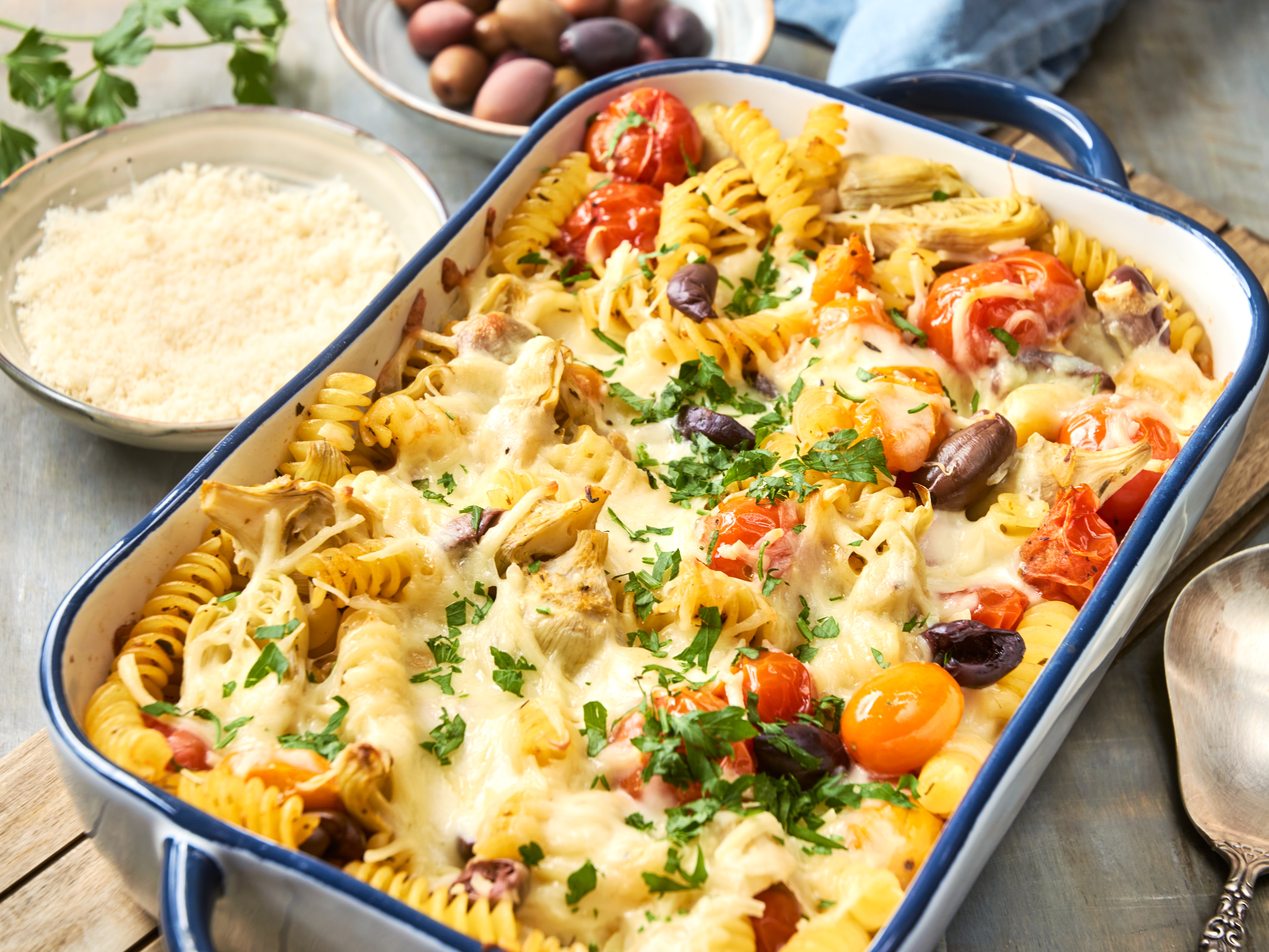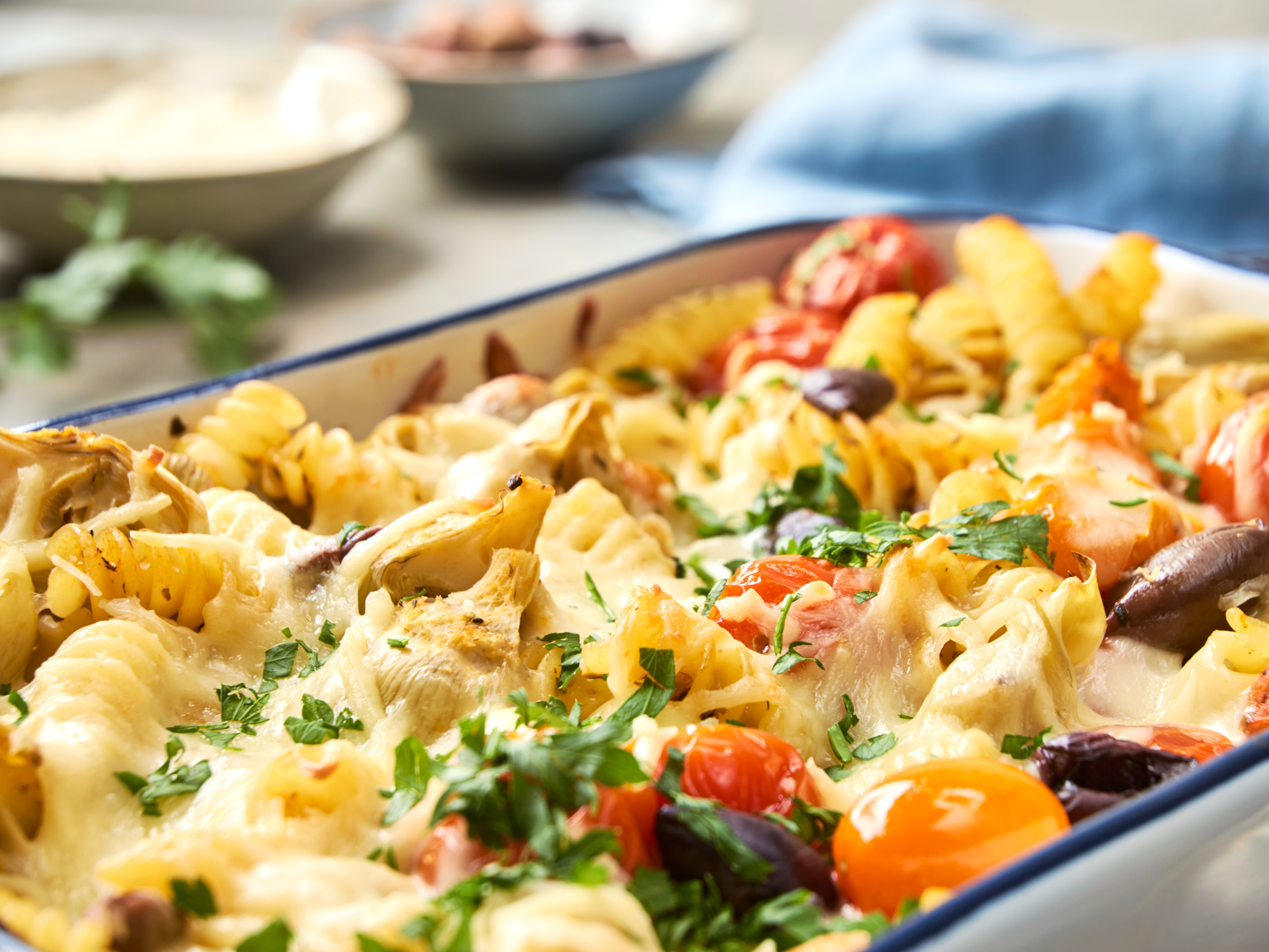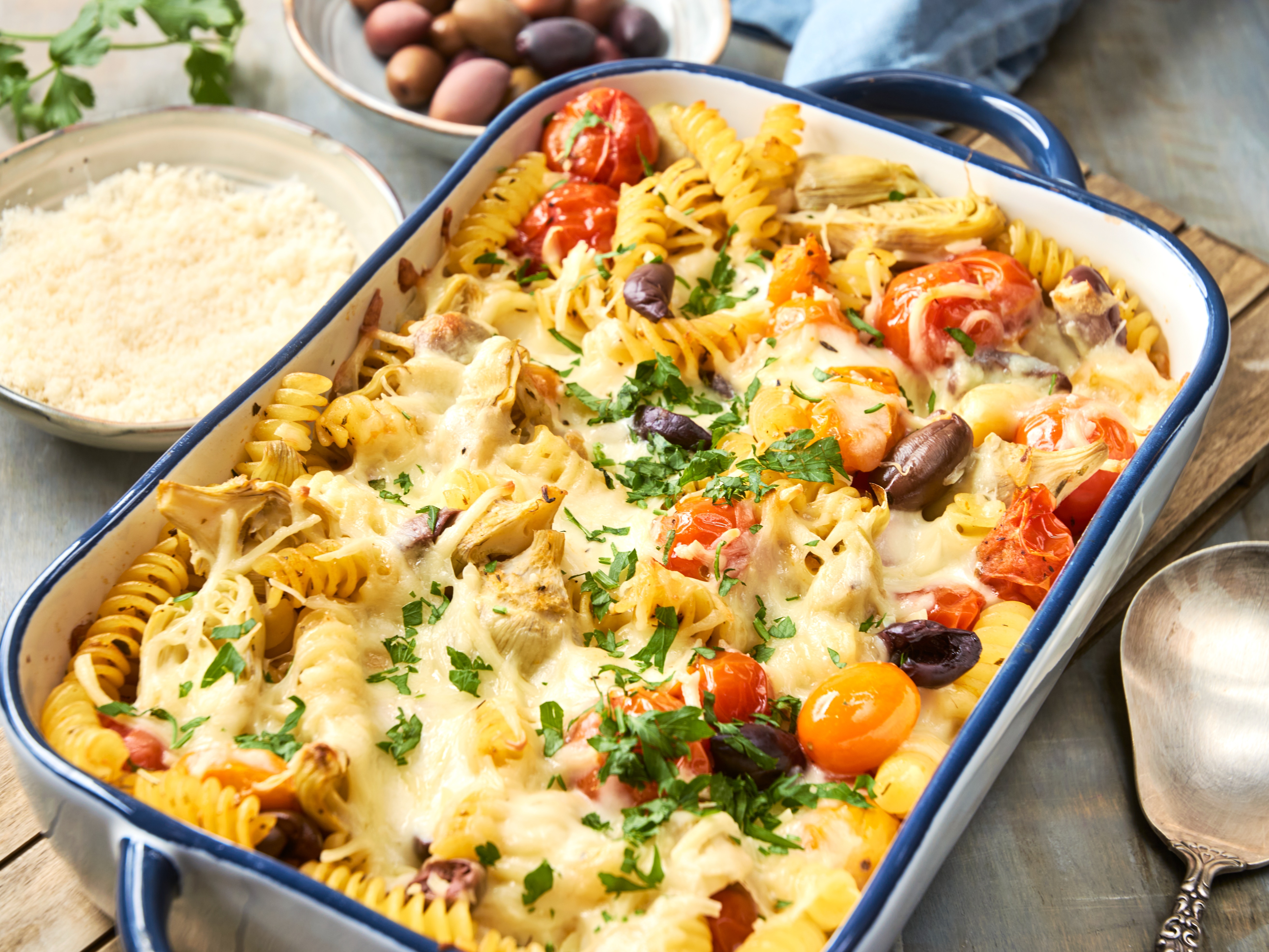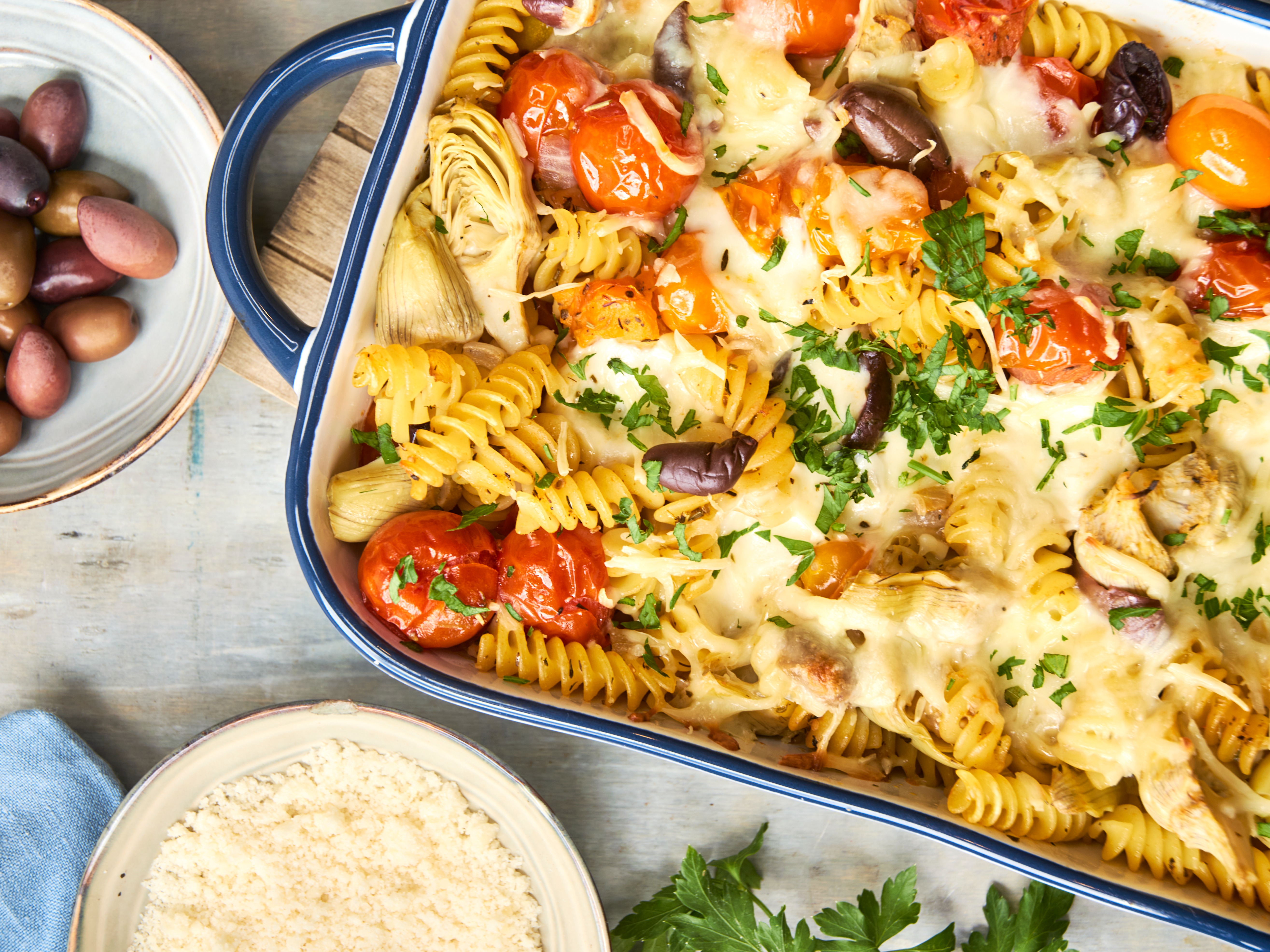 Ready for the tastiest trip with the Mediterranean Pasta Casserole?! This flavor-packed dish is loaded with bouncy rotini, fresh veggies, and melty mozzarella and will become your delicious (taste) tour guide! Colorful and so filling, you'll never want to leave the house again with this one. Mediterranean Pasta Casserole is a dish you must experience!