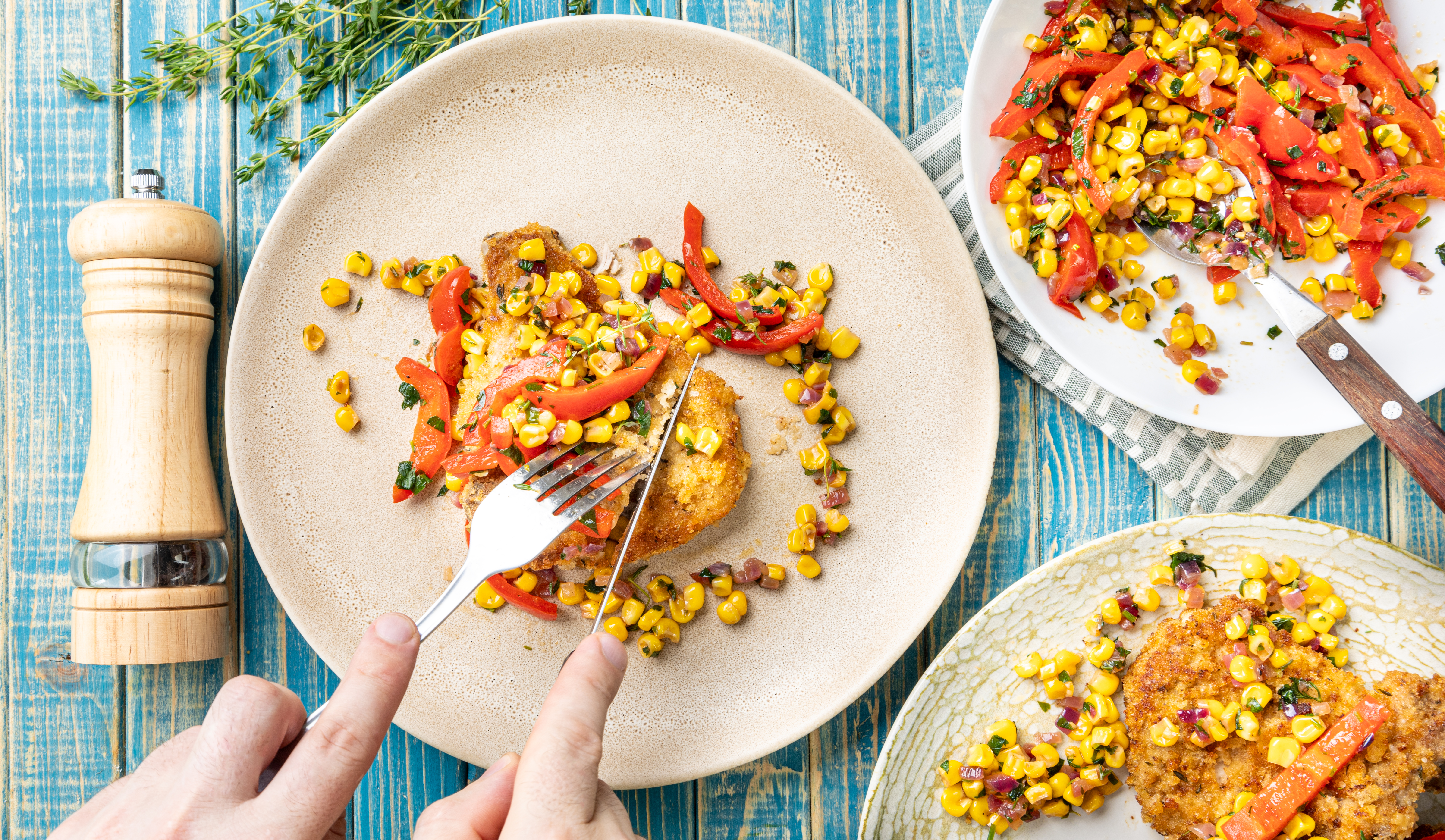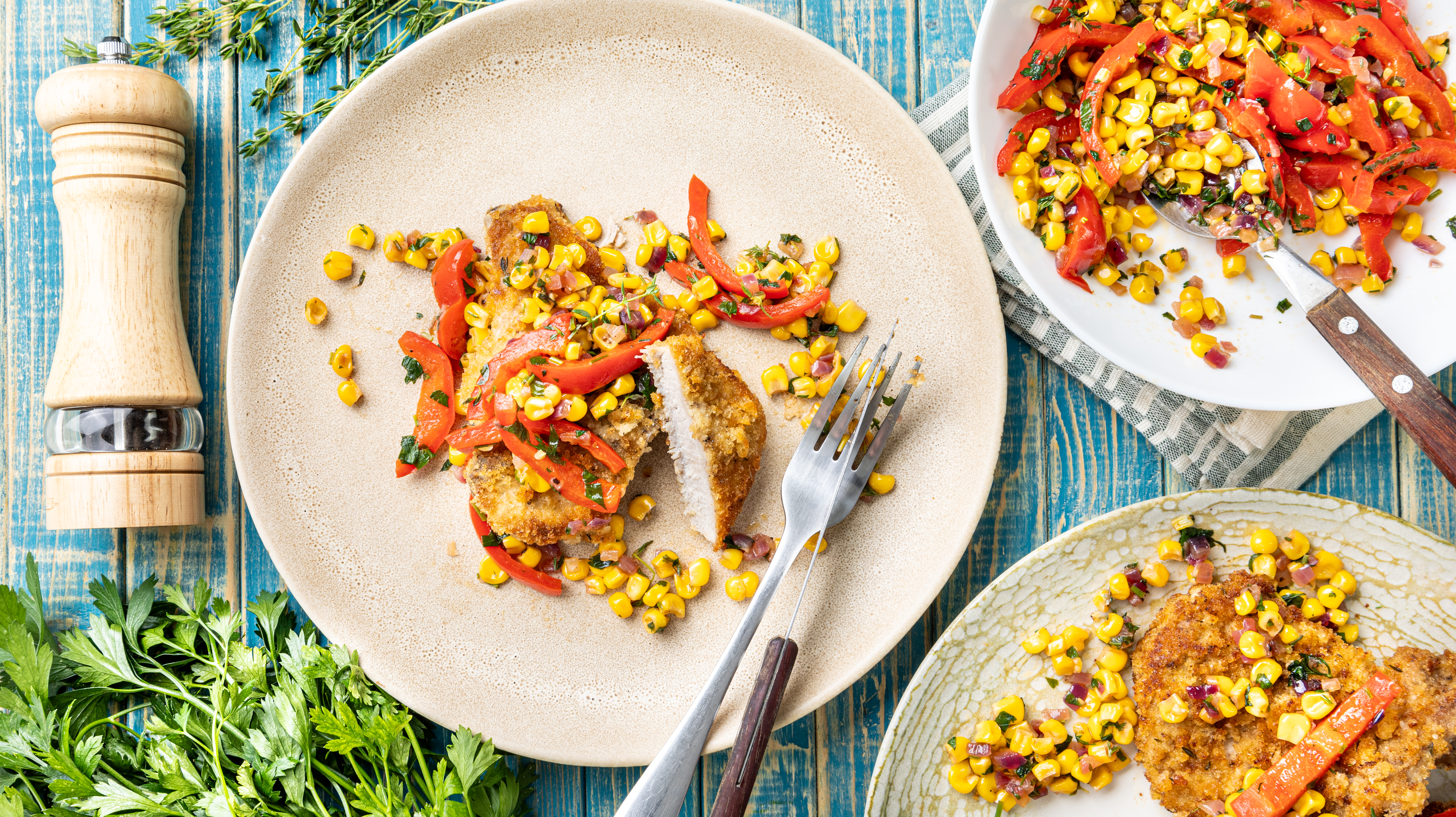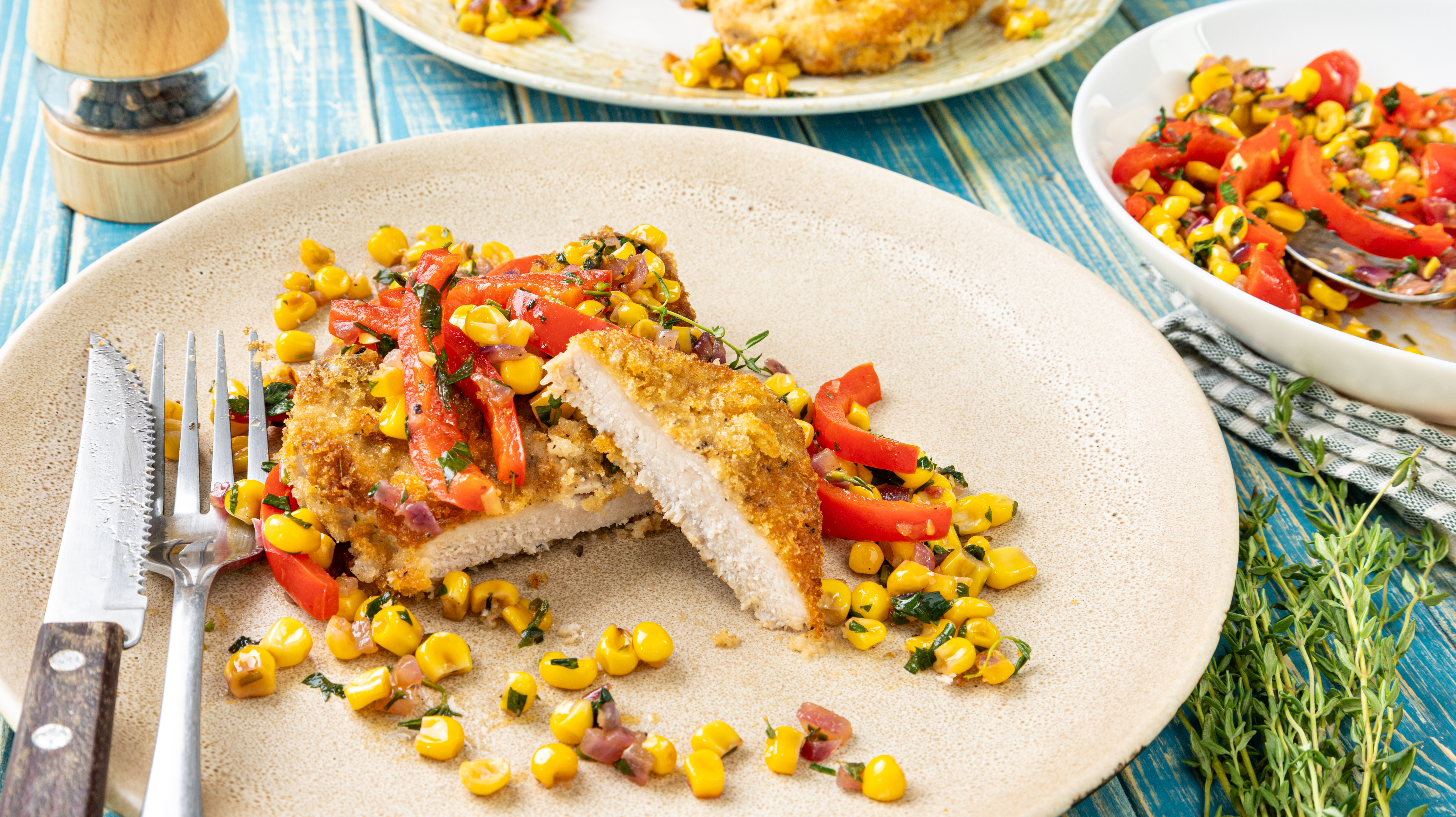 Oven-Fried Pork Chops are another tasty entry in the oven-frying trend, and wow! It certainly shows off its chops (see what we did there?)! The pork is baked, so it is far less greasy than conventional frying, while remaining juicy and tender, but it's also baked in butter with a crunchy stuffing coating, so it has all the flavor of frying! Then, served along with your Oven-Fried Pork Chops, you'll find a savory, summery strawberry salsa with creamy avocado, spicy peppers, and vibrant corn and pepper relish! Oven-Fried Pork Chops are a magically flavorful dish with no deep frying required!