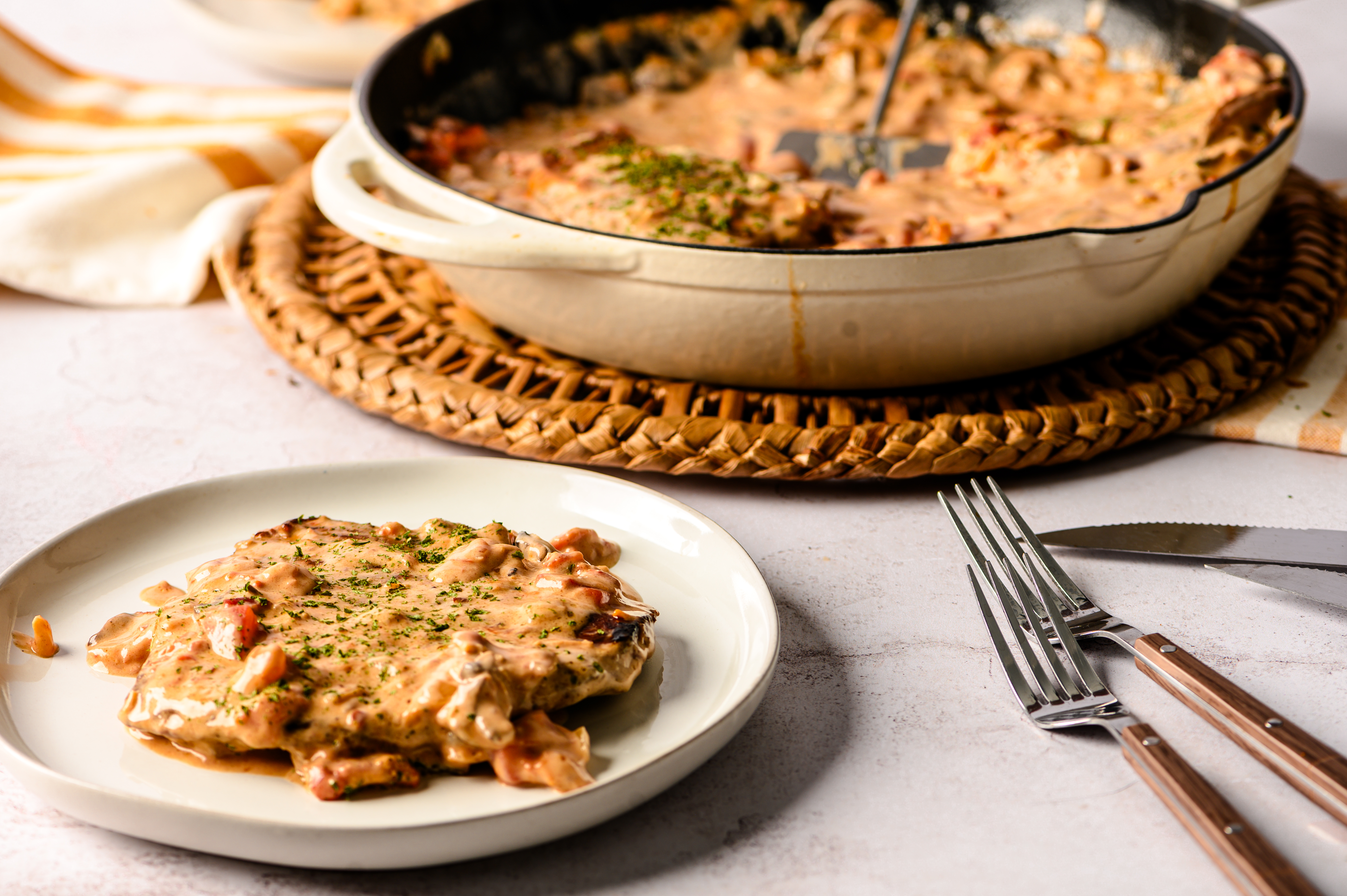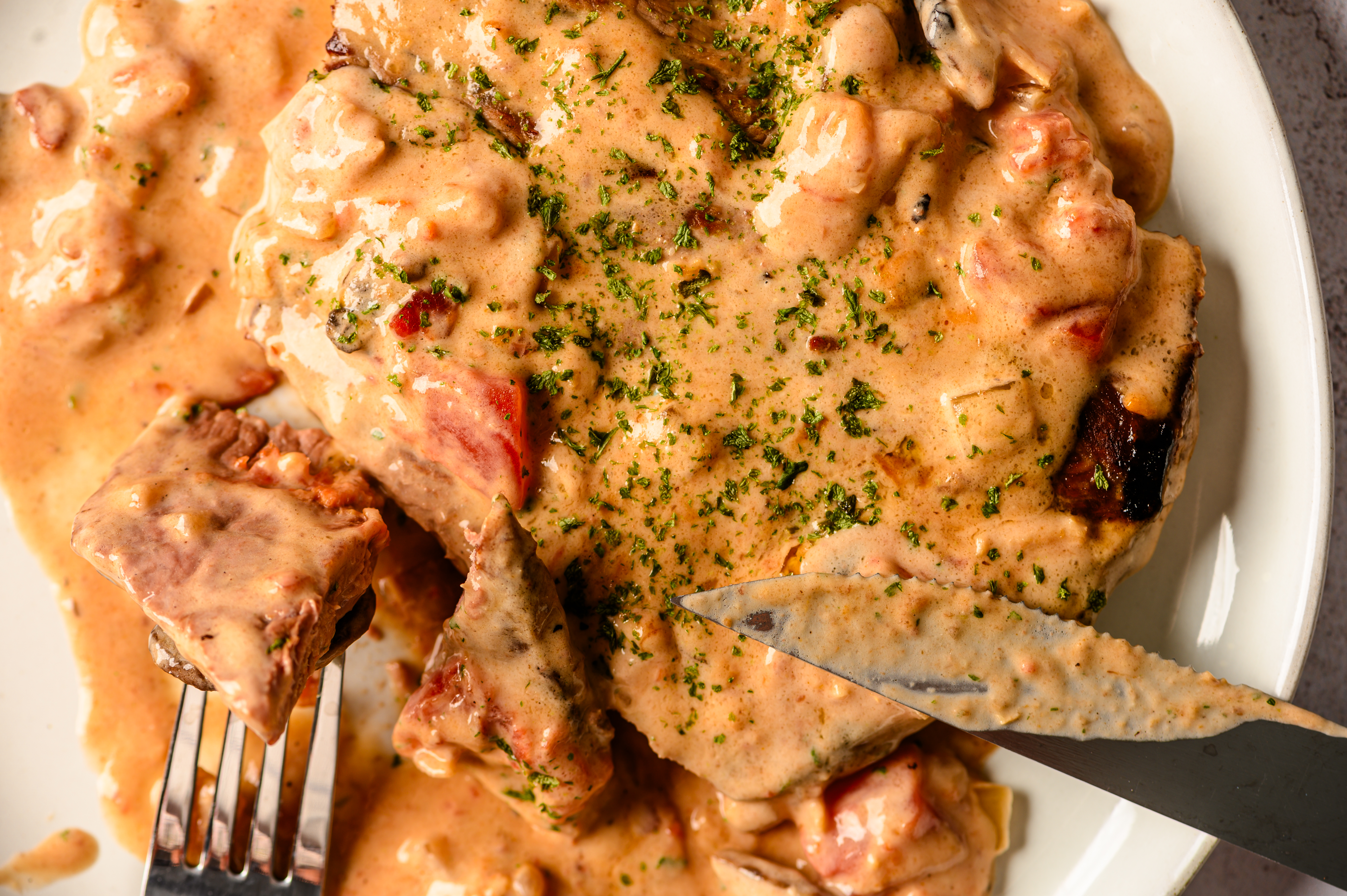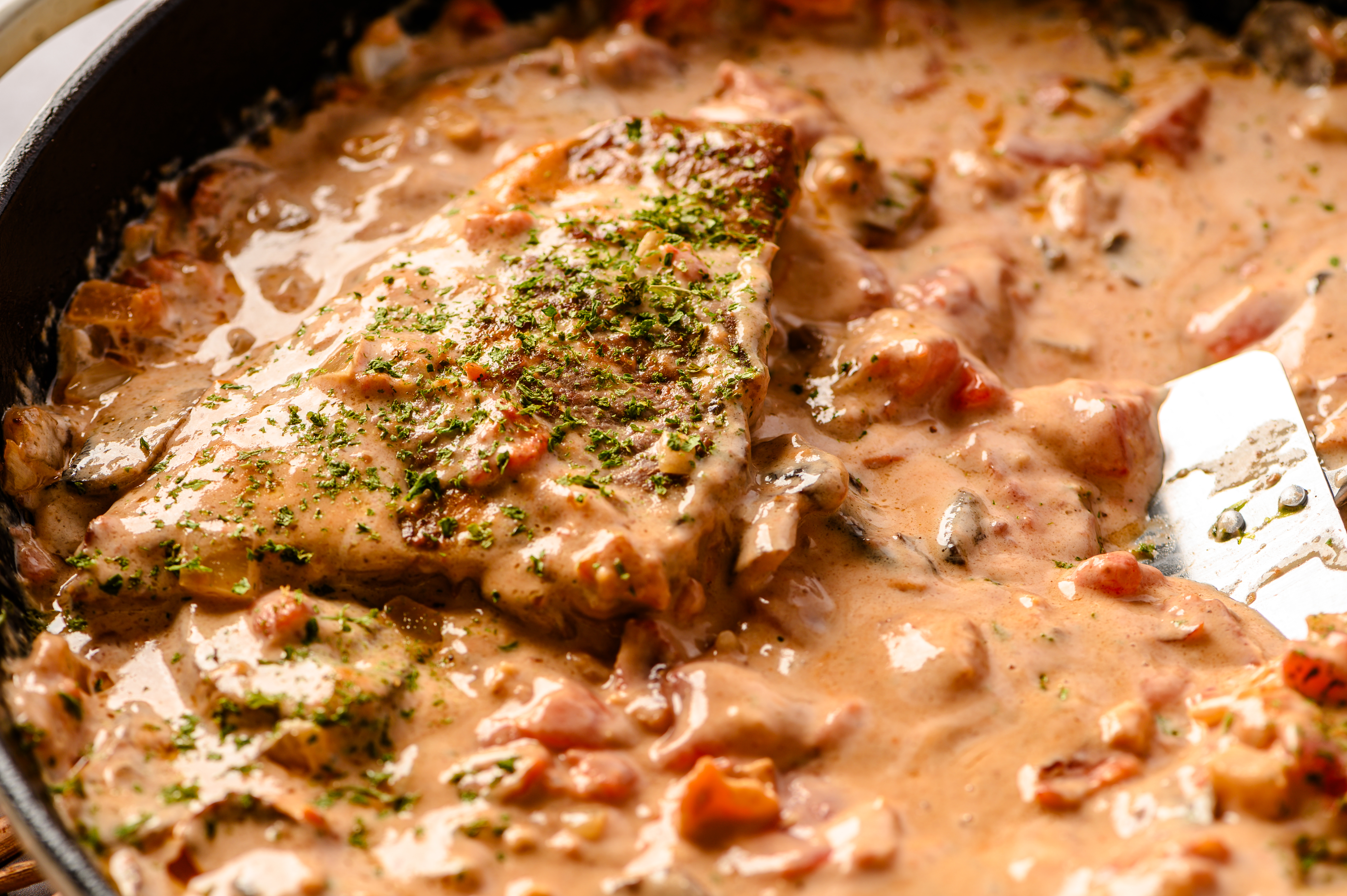 Interestingly, Oven Swiss Steak features no Swiss cheese whatsoever. Instead, it braises its savory steaks in a creamy sauce with notes of bright tomato, beefy mushrooms, and succulent bacon. This is the perfect dish to pour over mashed potatoes or buttery egg noodles; you'll find yourself amazed at how deep the flavor of Oven Swiss Steak goes! The Alpine goodness of this dish will have you marveling!