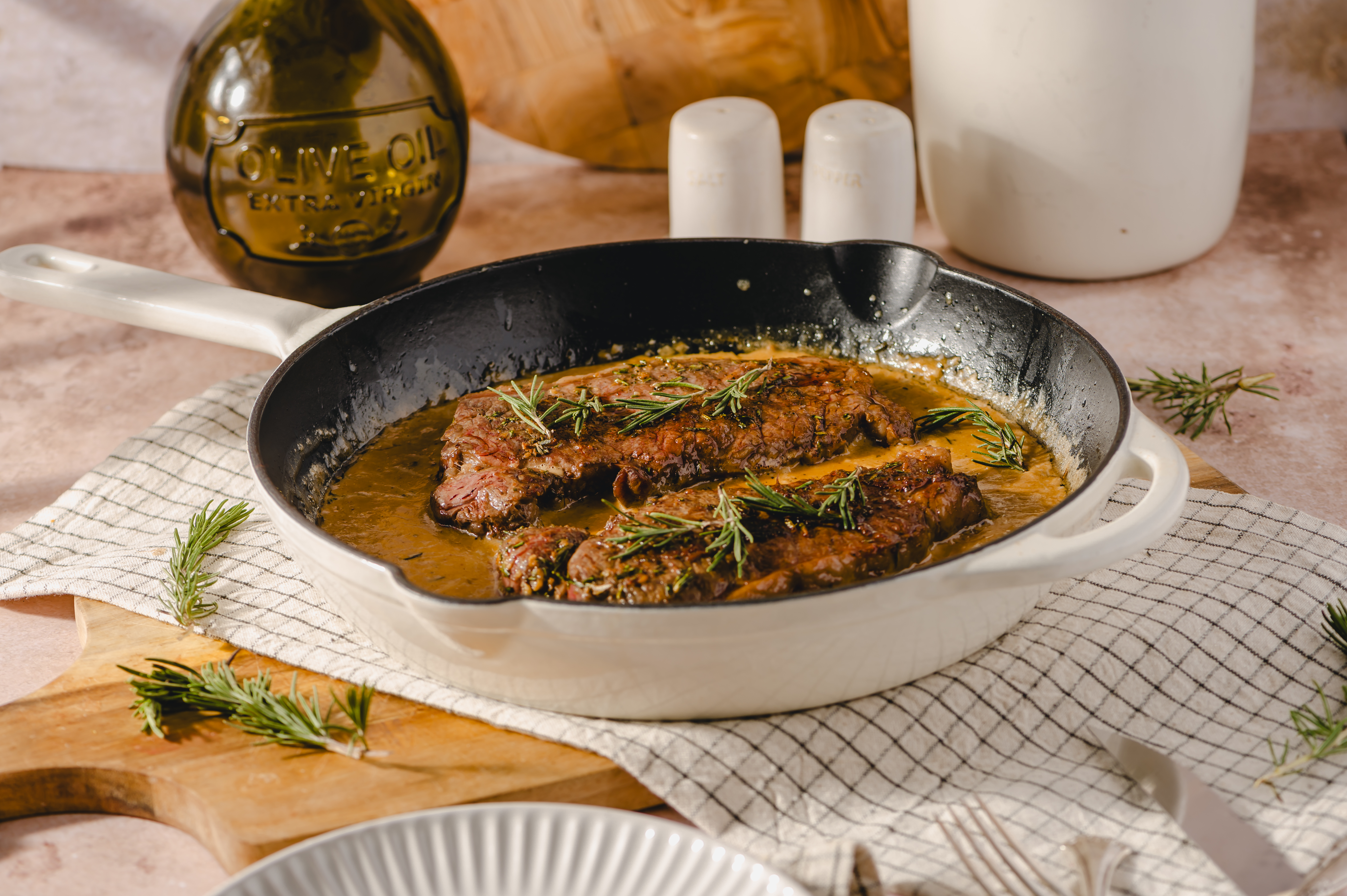 Step 4 -Add the steaks to the butter-oil mixture and cook until a light jacket forms, about 2-3 minutes per side.