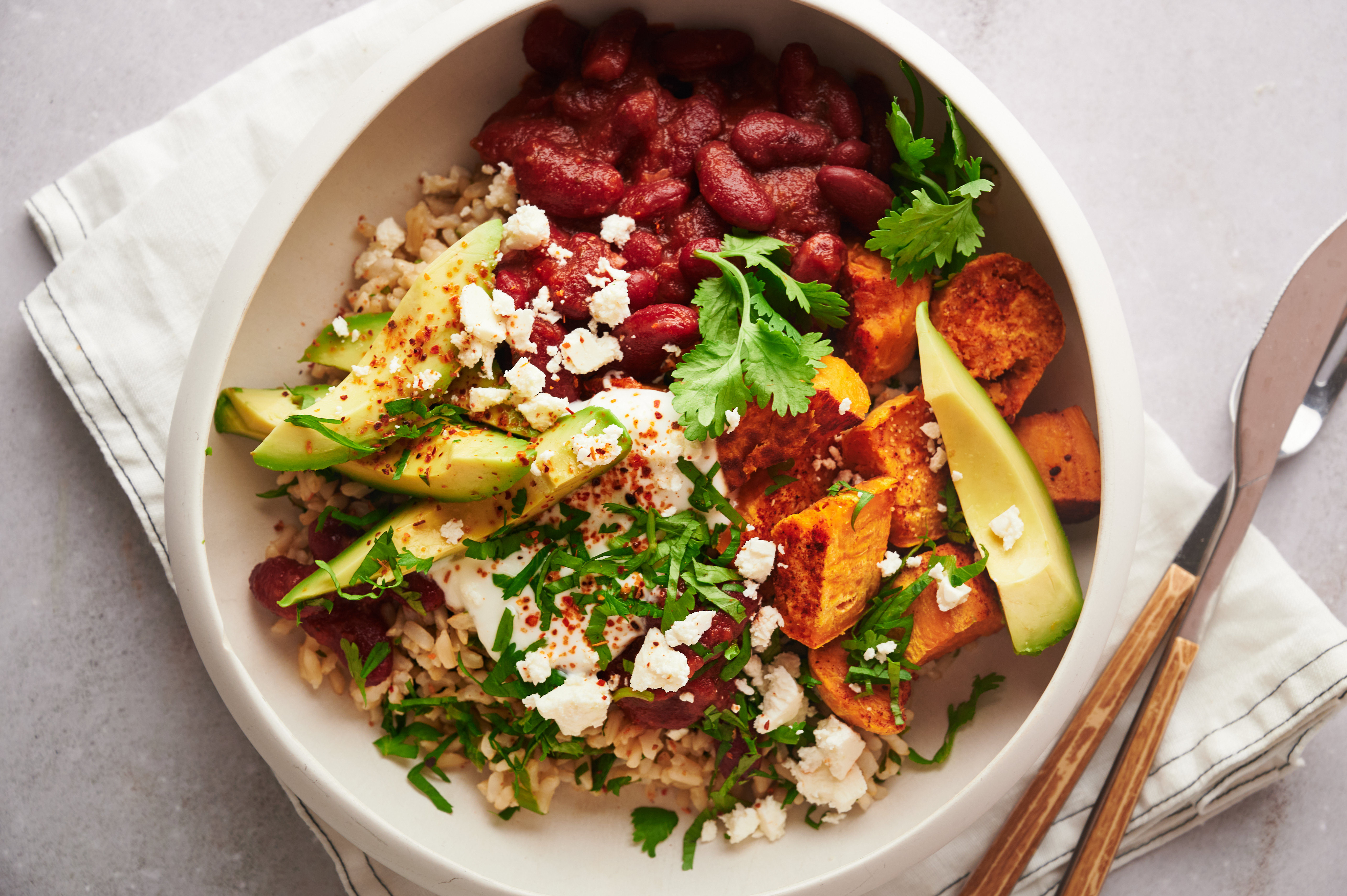 When you're stressing out about what to make for dinner, SOS Bowls come to the rescue! These nutritious and nourishing bowls are loaded with nutty brown rice, tender sweet potatoes, vibrant red pepper, and hearty beans, and then topped with, well, whatever suits your fancy! SOS Bowls know that sometimes you have to be yourself and get creative to have the most satisfying dinner! No need for distress with this dish on the table!