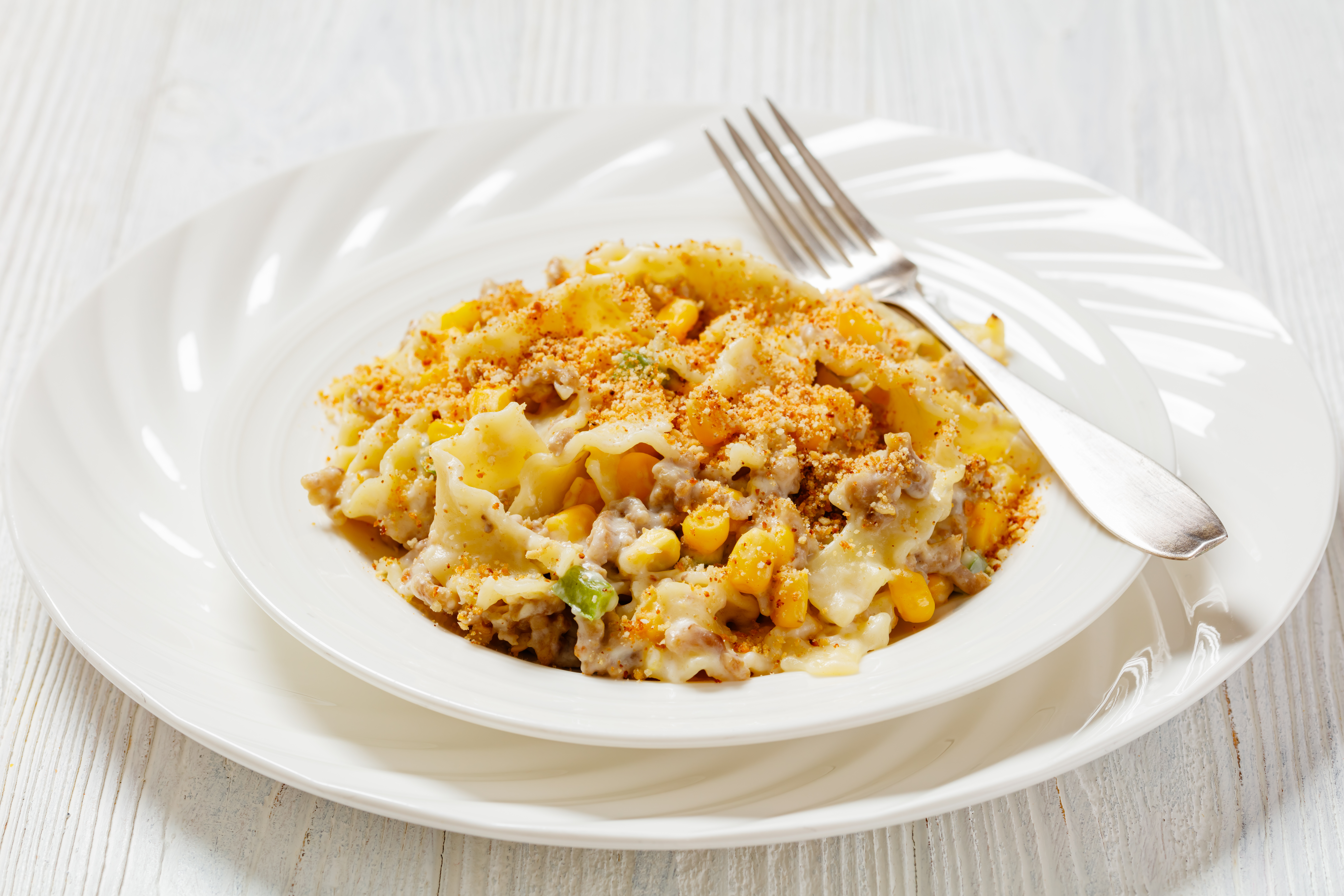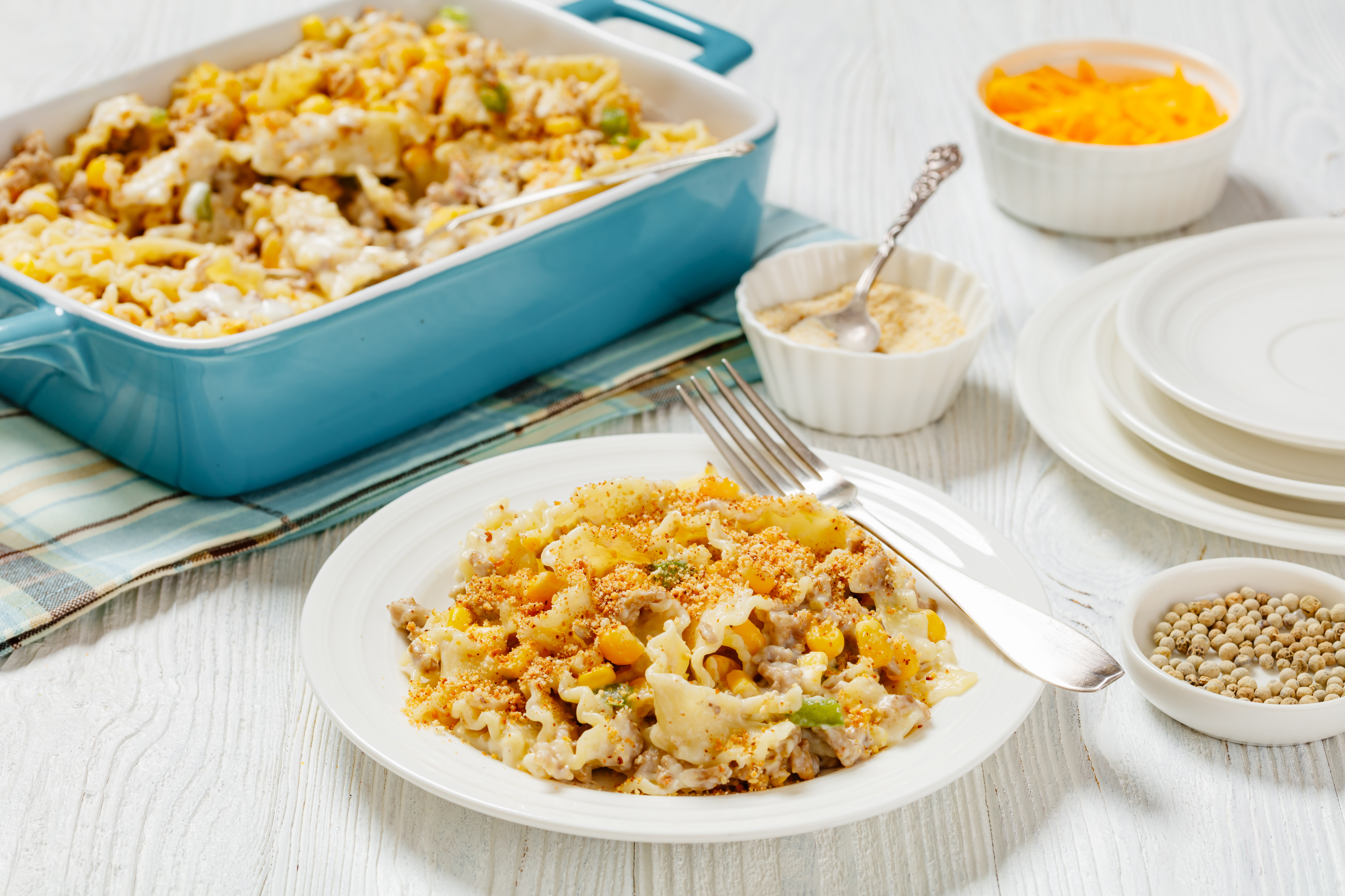 It is a tradition in some areas for casseroles to take center stage at many family meals or potluck gatherings. Southern-Style Corn Casserole is a repeat guest for such events! This baking-dish-blessing welcomes savory pork sausage, creamy cream-style corn, and tender egg noodles in a sharp cheddar cheese-enhanced sauce, and hugs it with a crunchy bread crumb topping for the perfect house or picnic party. Invite Southern-Style Corn Casserole to your next feast and enjoy that Southern hospitality we all know and love. You'll be so glad to meet this new casserole friend!