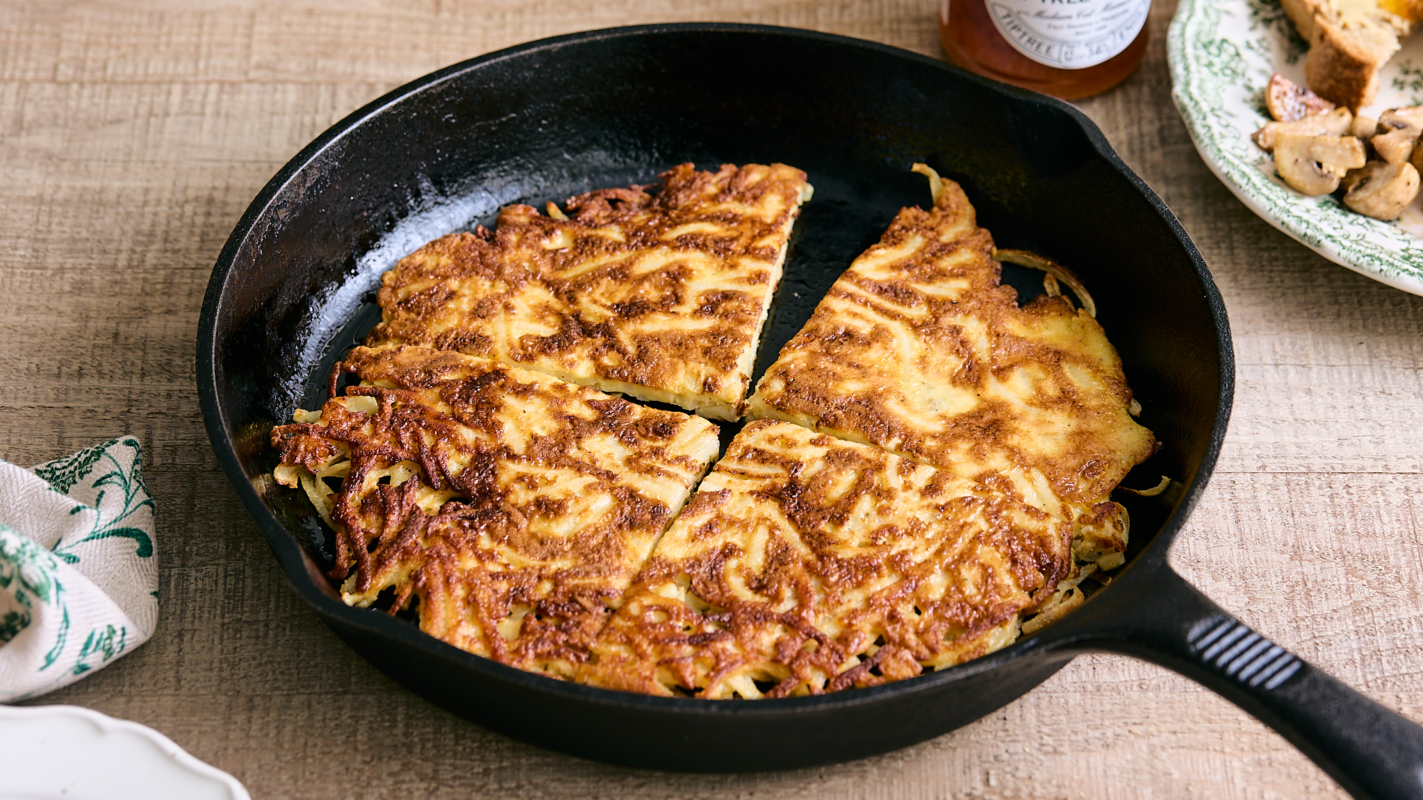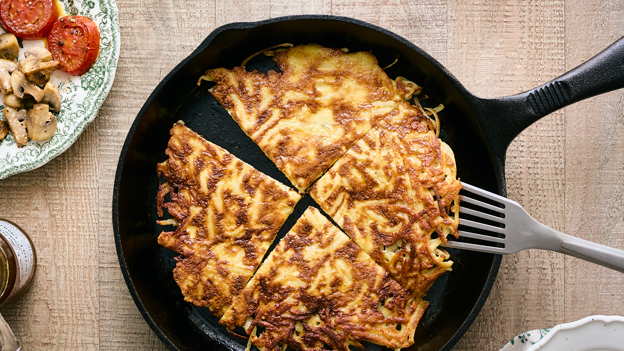 Step 4 -Add the potato mixture to the melted butter and cook, flipping as needed, until the surface is golden-brown and the potato is cooked through, 8-10 minutes on each side.