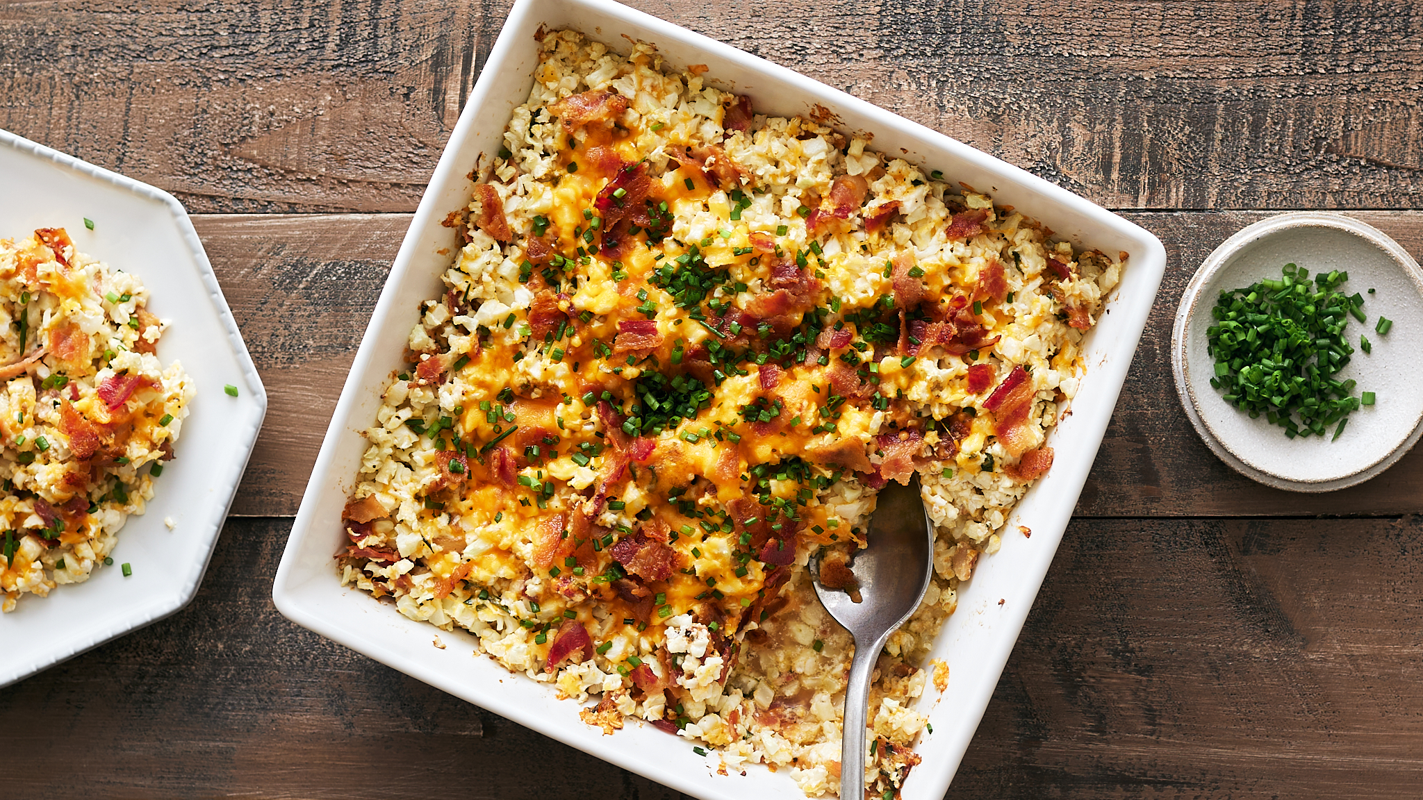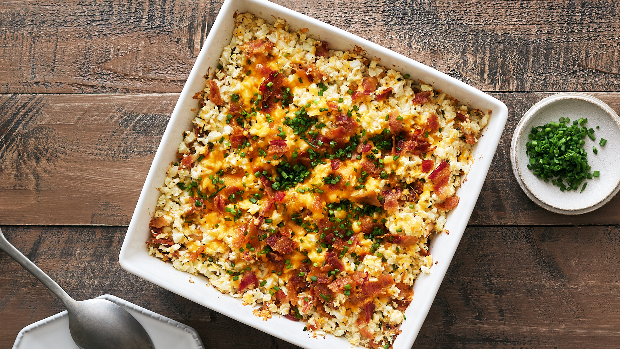 This is the Supercharged Bake! It's electrifying! And more than that, it's actually quite nourishing! Mild, tender cauliflower makes a nutritious base for topping succulent bacon and rich, sharp cheddar cheese. It's health food that tastes like fast food, truly the best of both worlds. If the Supercharged Bake doesn't give your tastebuds a most welcome shock, we'd be shocked!