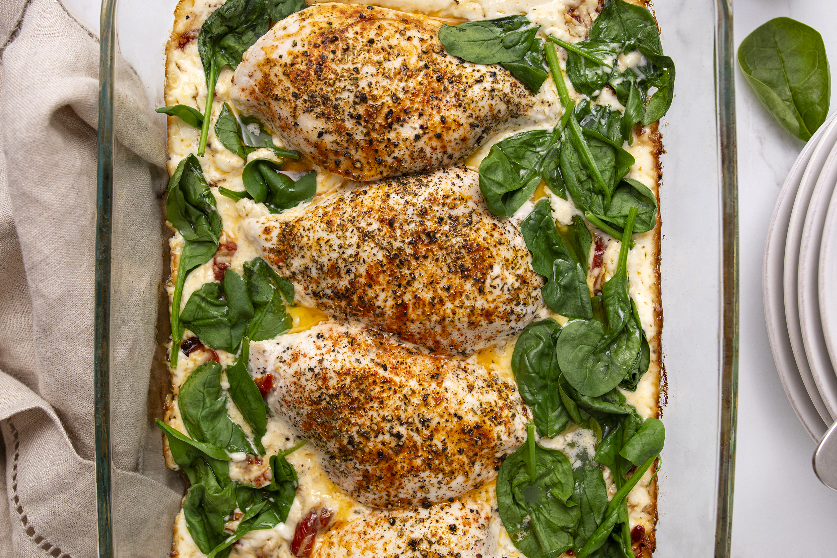 Step 4 -Remove the plastic wrap and place the chicken breasts in a 9x13-inch baking dish.