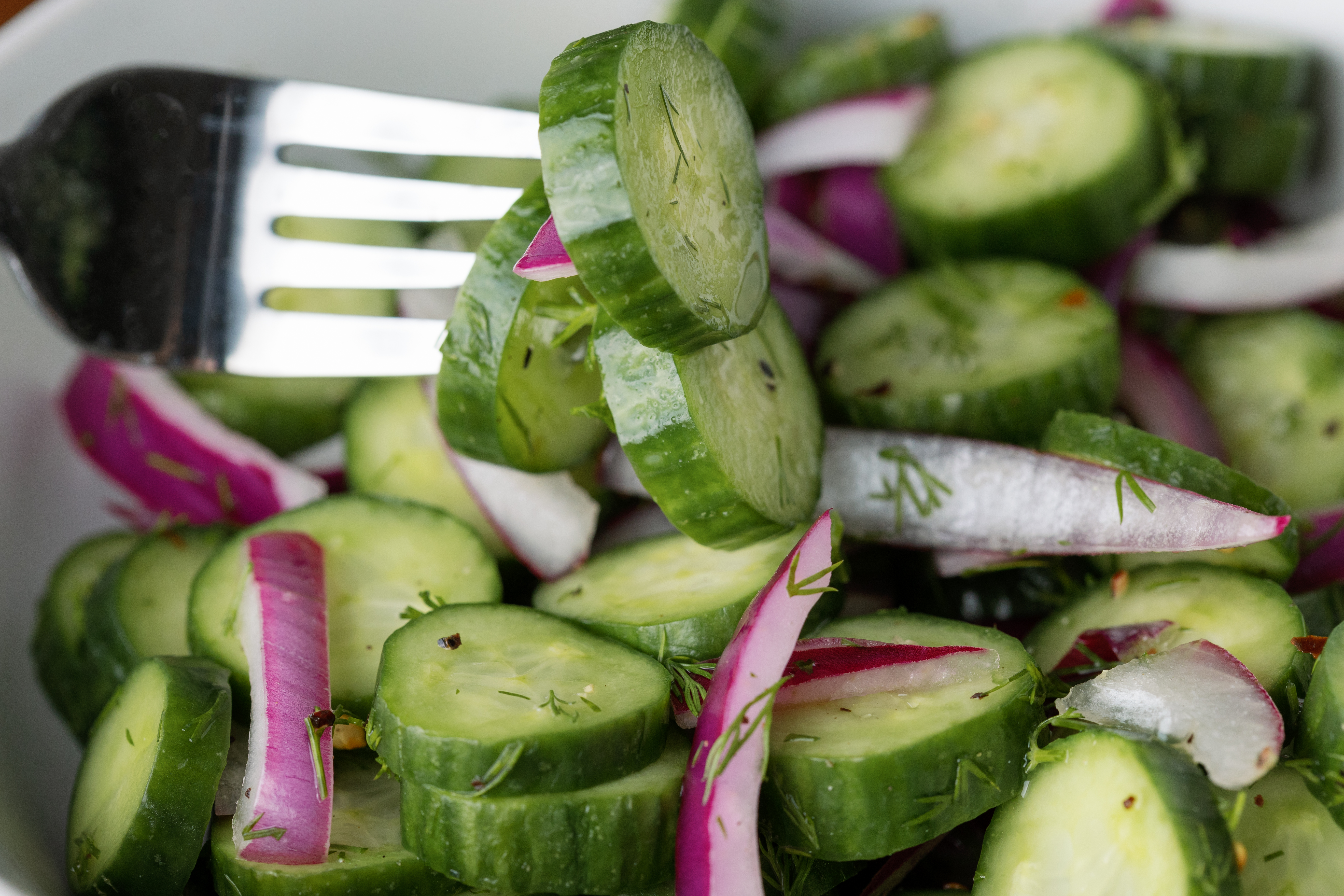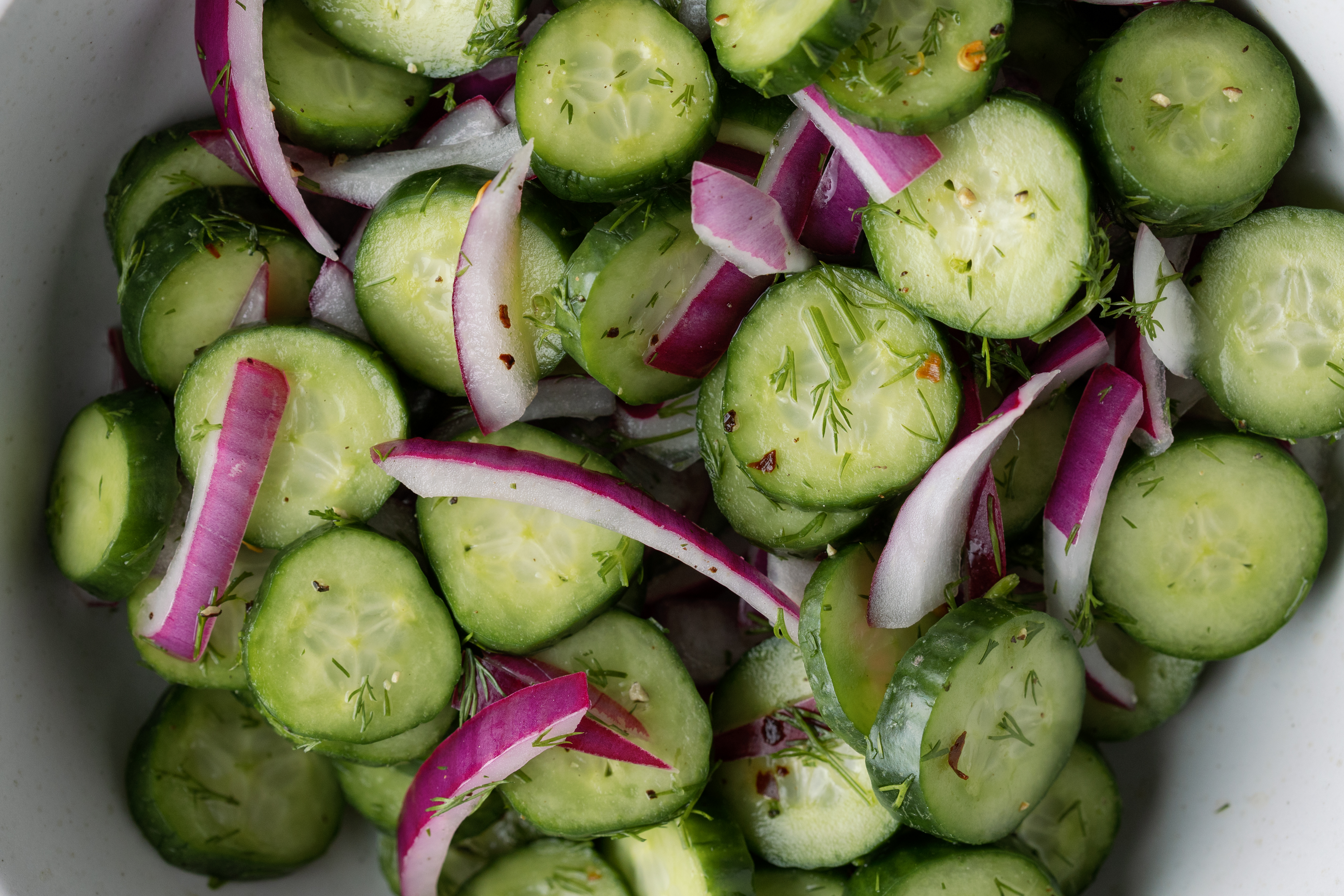 Nothing says fresh like a crisp salad, and this one will be playing on repeat... especially during the summer! This Tangy Cucumber Salad is the perfect amount of crunch for all your summer (or anytime) salad wishes! The mild Persian cucumbers and sassy red onions swimming in a refreshing and tart dressing are always welcomed guests at your table. Jazz things up a bit with this Tangy Cucumber Salad whenever you need that burst of summer you're craving. It is so easy, so make-ahead friendly, and so, so good! It's just a big "dill"!