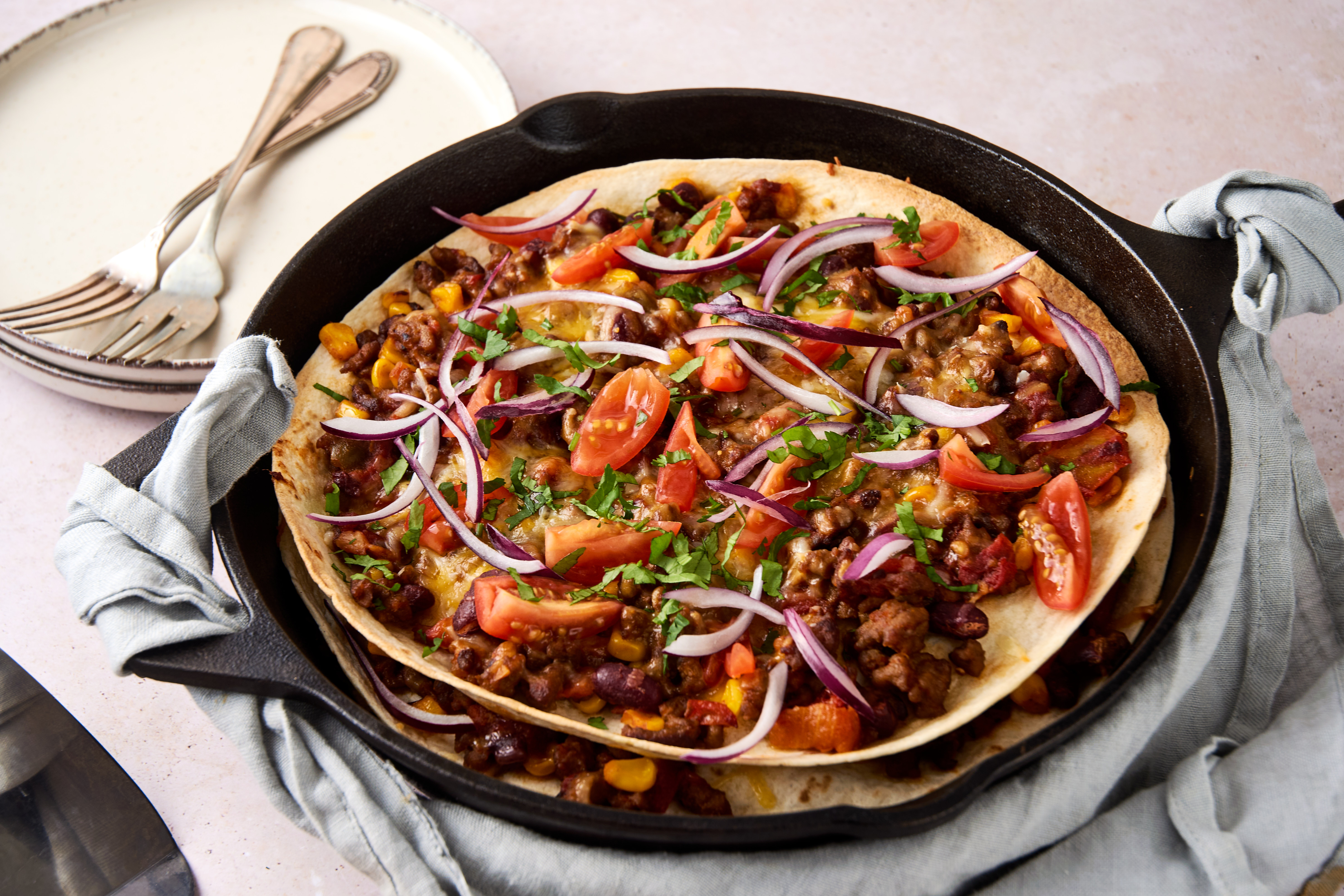 Step 9 -Spread 1 1/2 cups of the ground beef mixture evenly over the tortilla in the skillet.