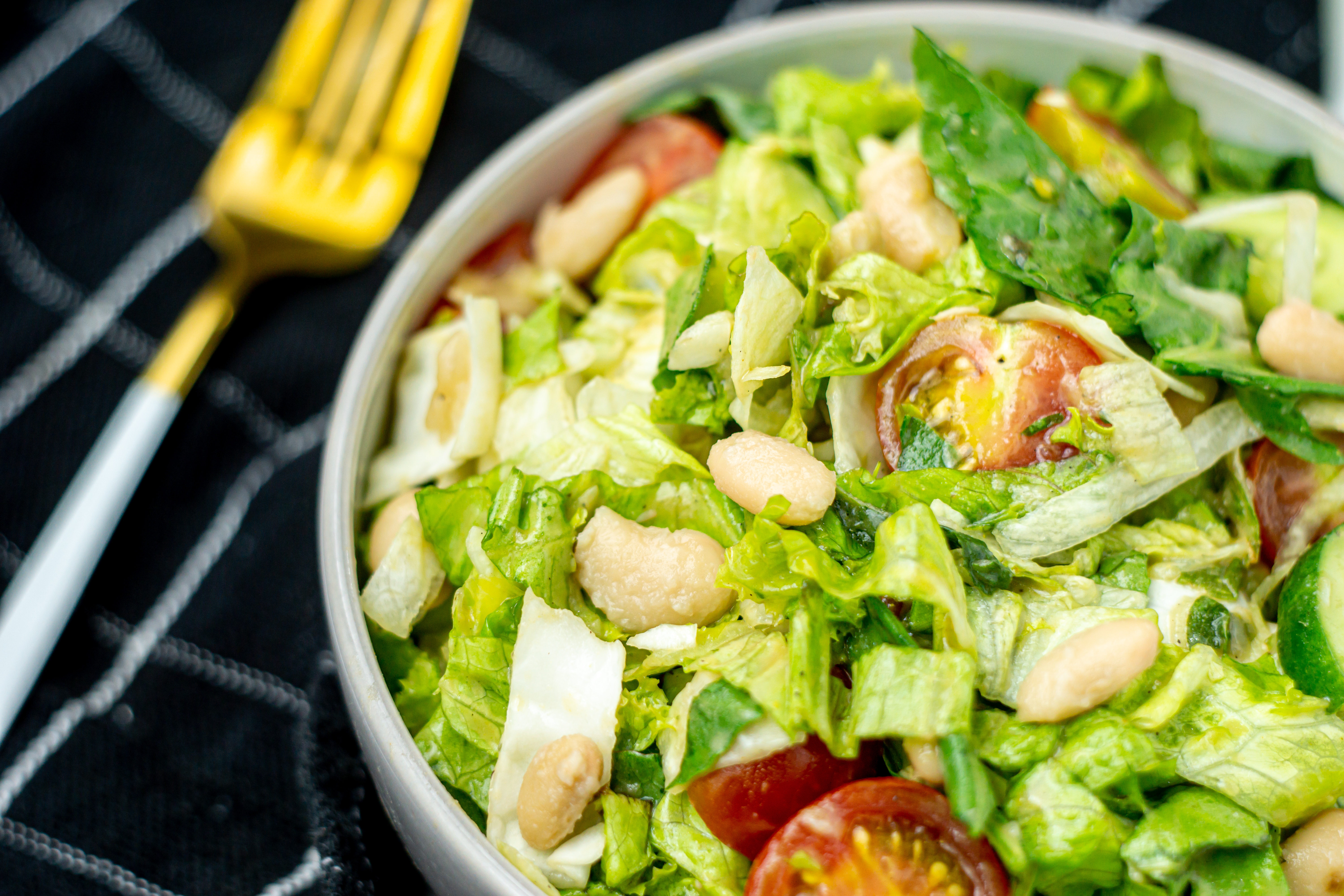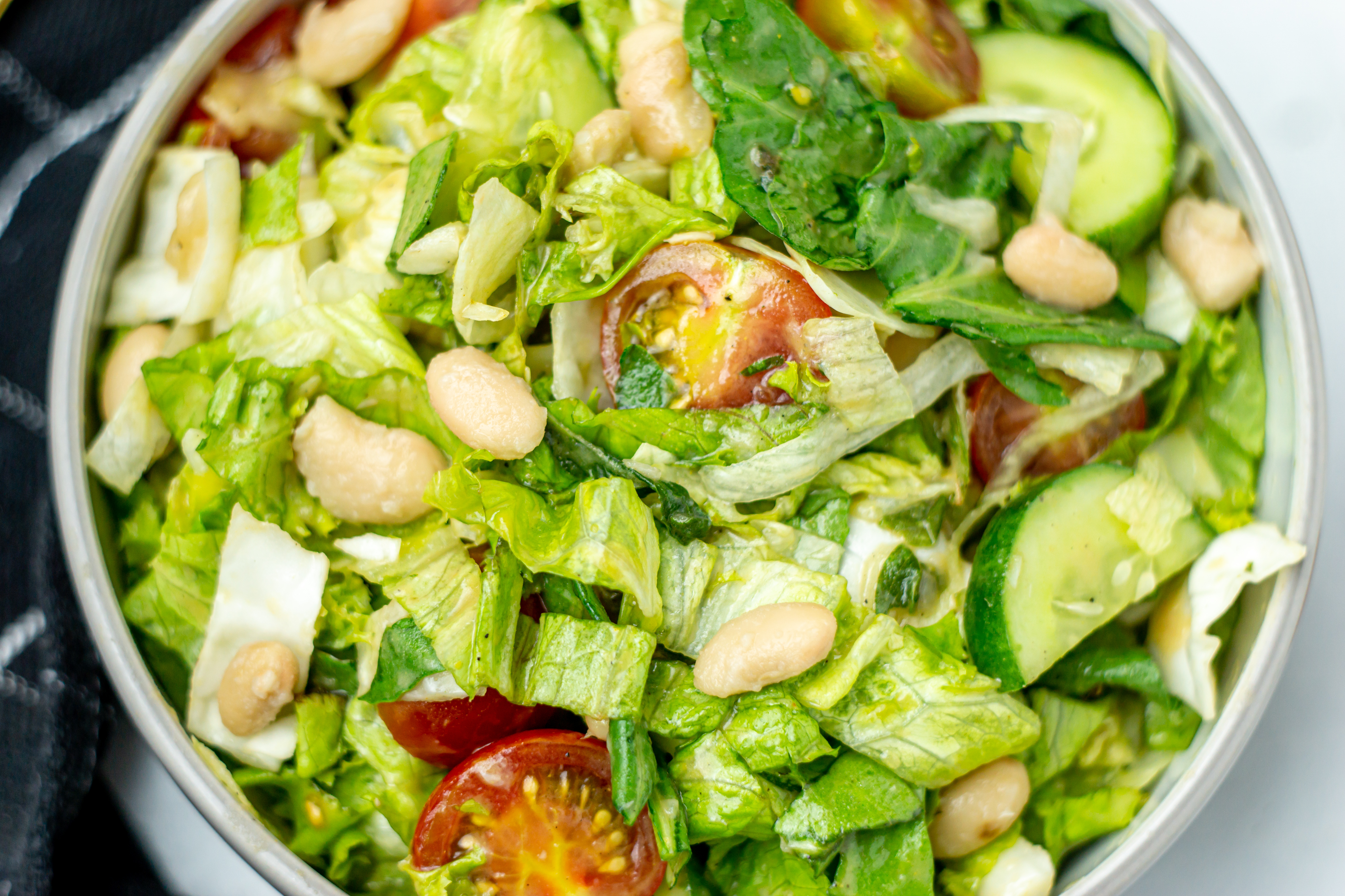 Step 2 -Add the salad greens, the beans, the tomatoes, and the cucumber to a large bowl.