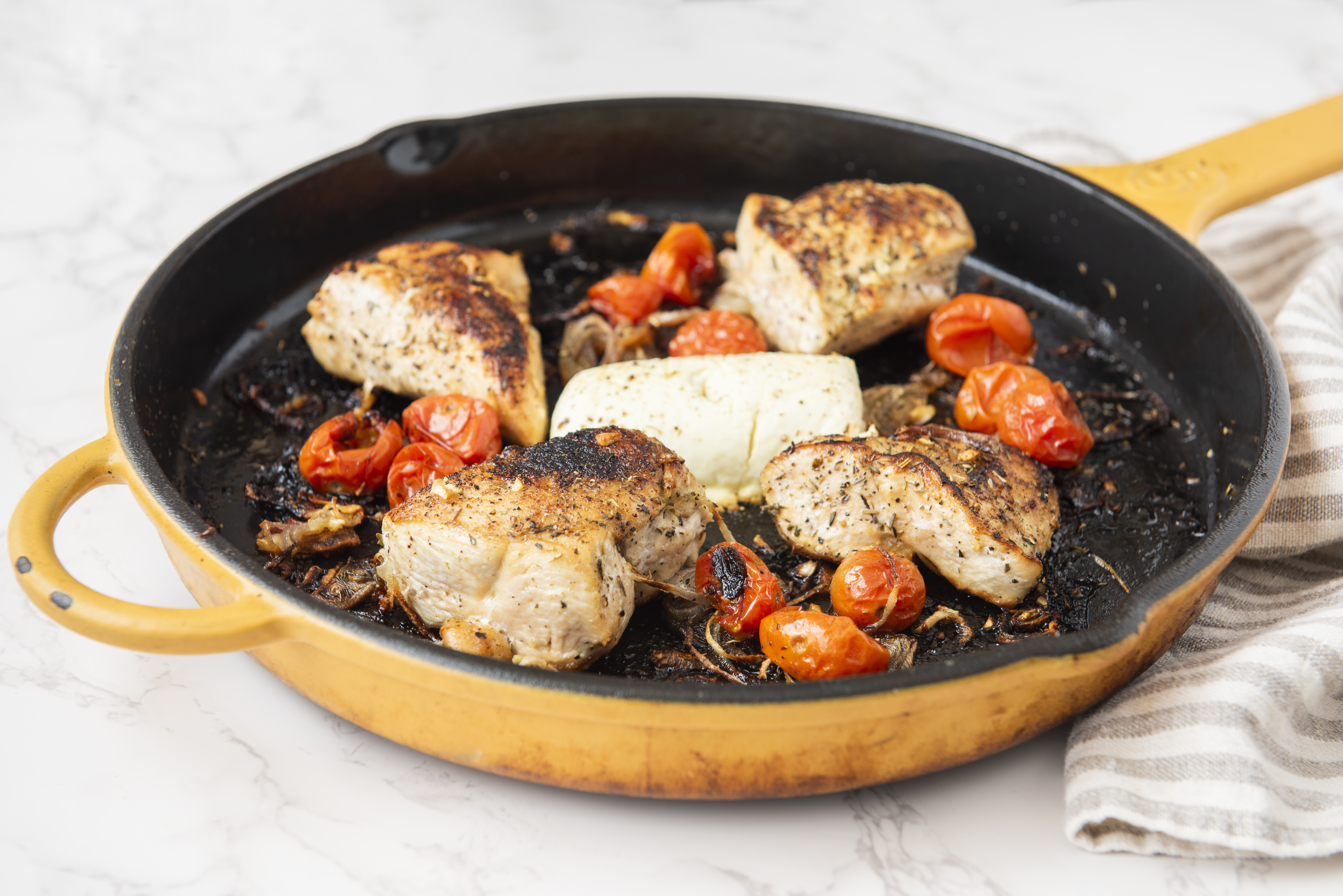 Step 8 -Nestle the goat cheese log in the center of the skillet.