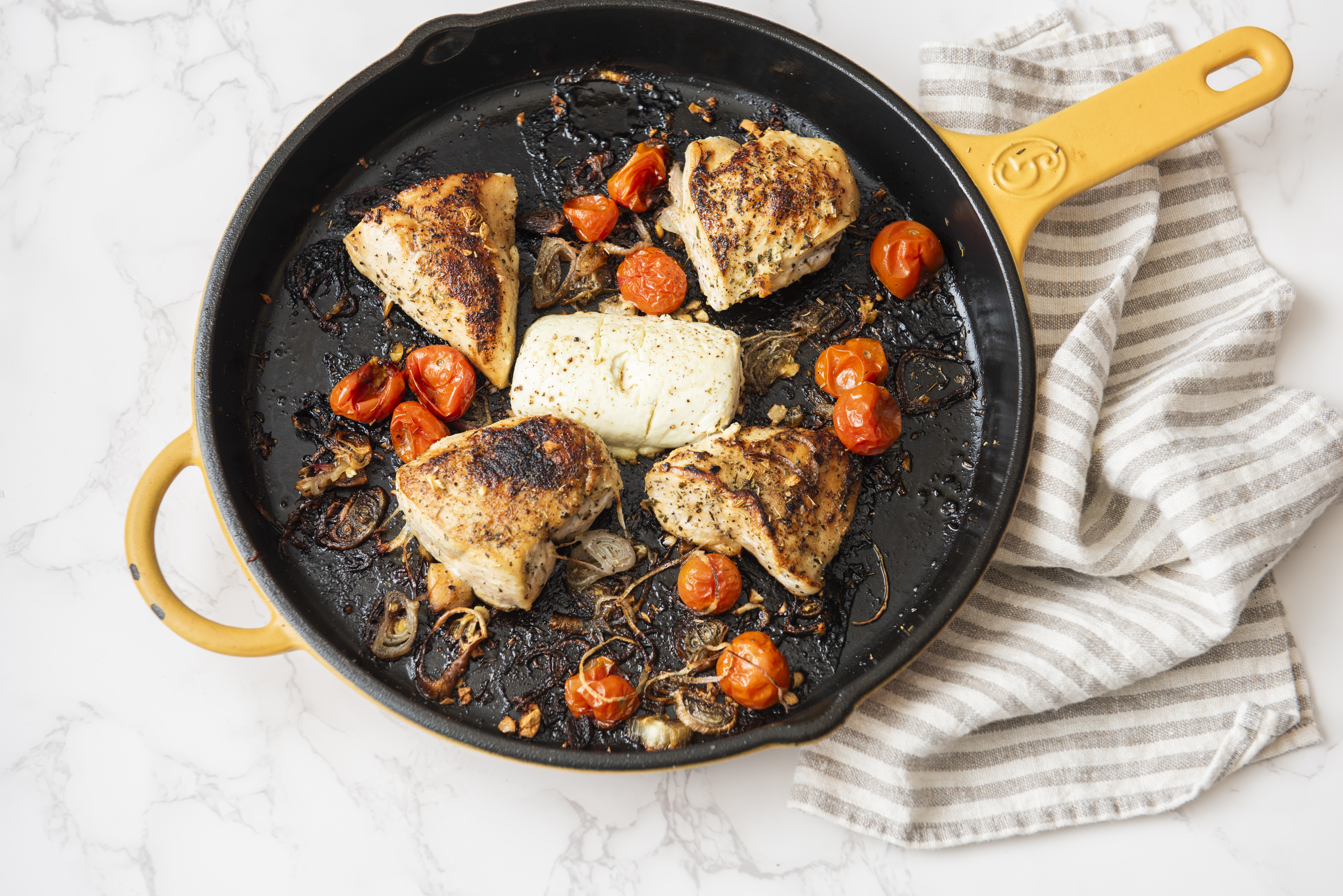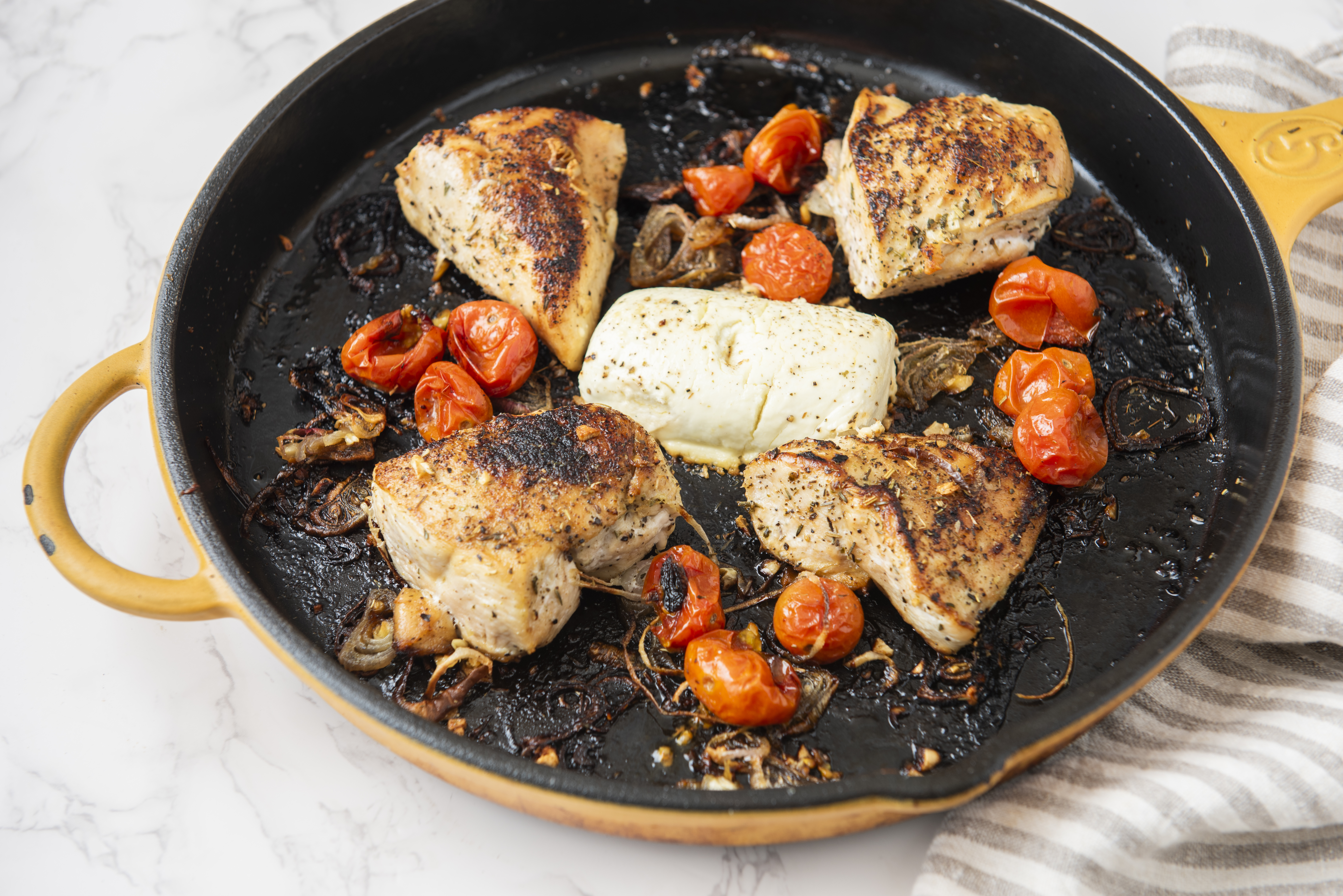 Step 12 -Optionally, transfer the skillet from the oven and, using a fork, mash the tomato mixture and the goat cheese together to form a creamy tomato sauce.