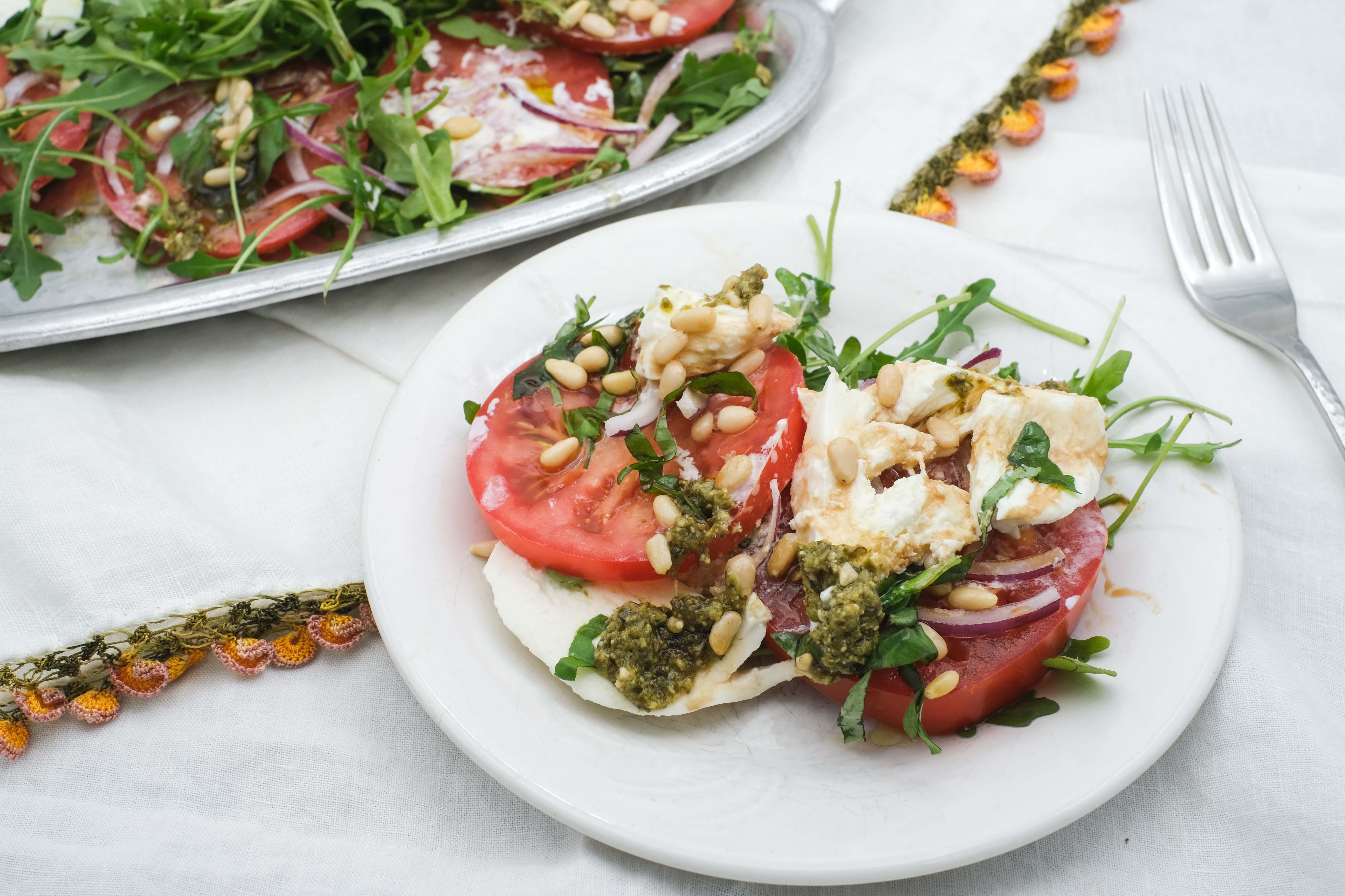 Part of the fun of going on vacation is getting to experience new foods and flavors. Well, pack your bags (grocery bags that is) and try this fresh, vacation-like Tomato Burrata Salad right in your own backyard (or dining room). Almost like taking a furlough from the kitchen, this easy, made-in-minutes, vacation-on-a-plate salad will make it look like you pulled out all the stops. Picture it; fresh, crispy arugula, juicy, ripe tomatoes, flavor-packed red onions, and bougie, creamy burrata topped with some of the best balsamic glaze you can imagine. This picturesque Tomato Burrata Salad will definitely take you on a flavorful trip. So, take it easy, relax, and enjoy this salad sabbatical with the ones you love. A mind-vacay is a wonderful place to go! It's always in season... enjoy your trip!
