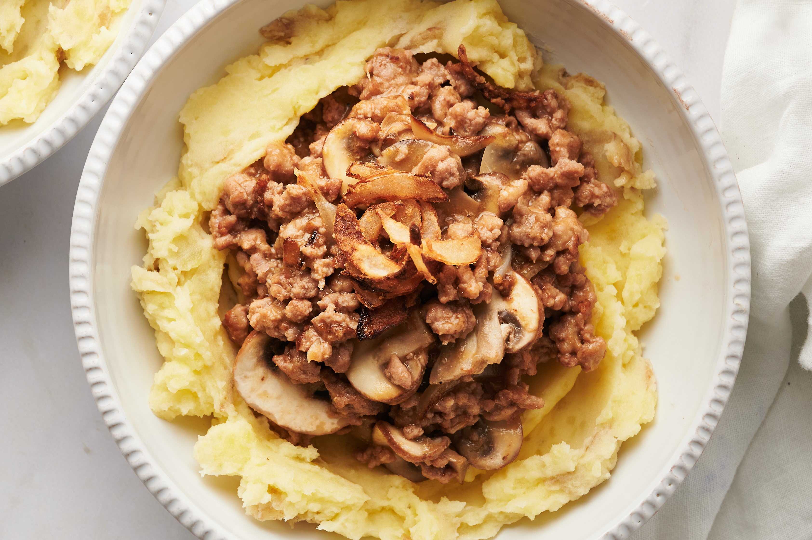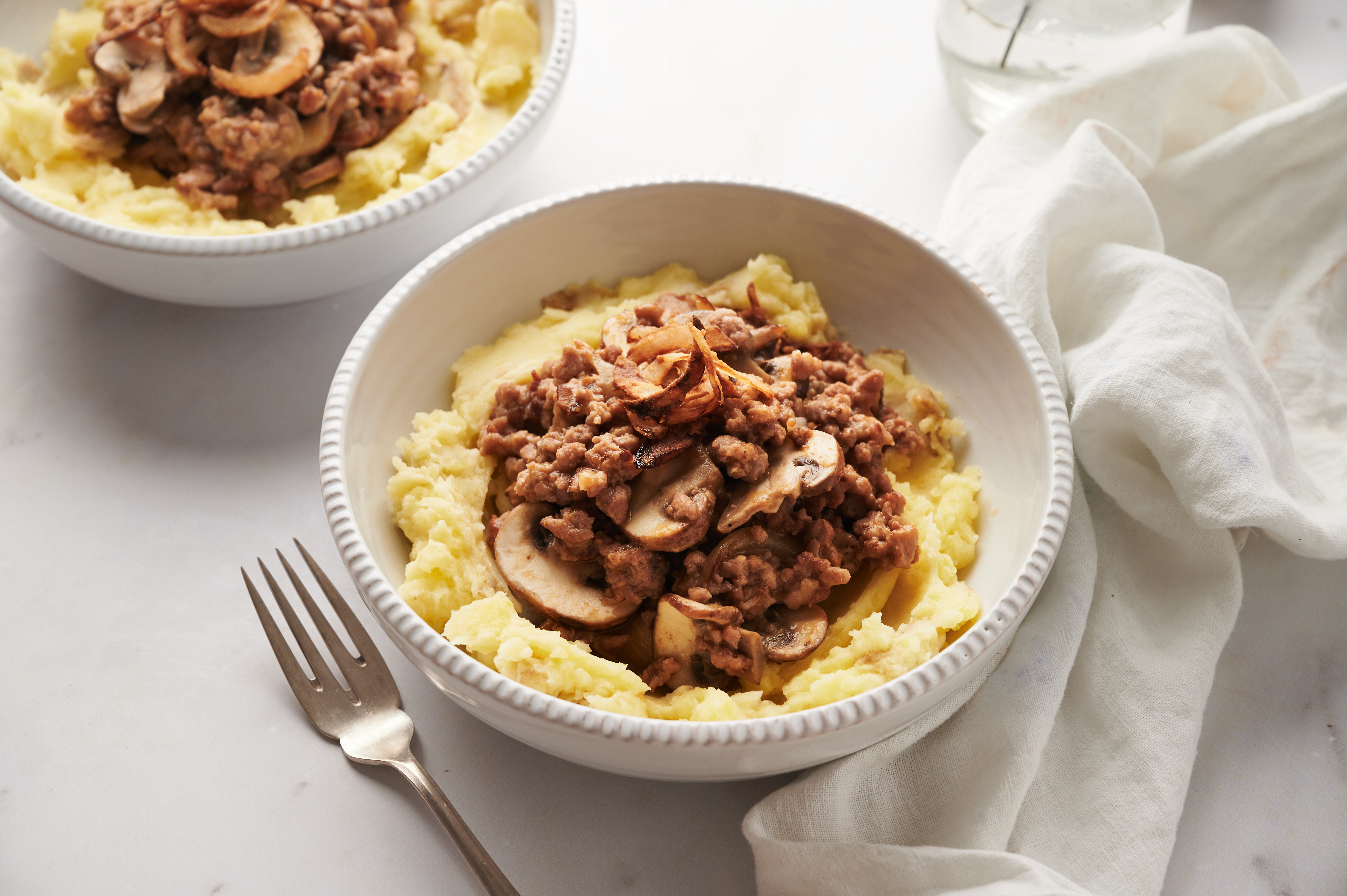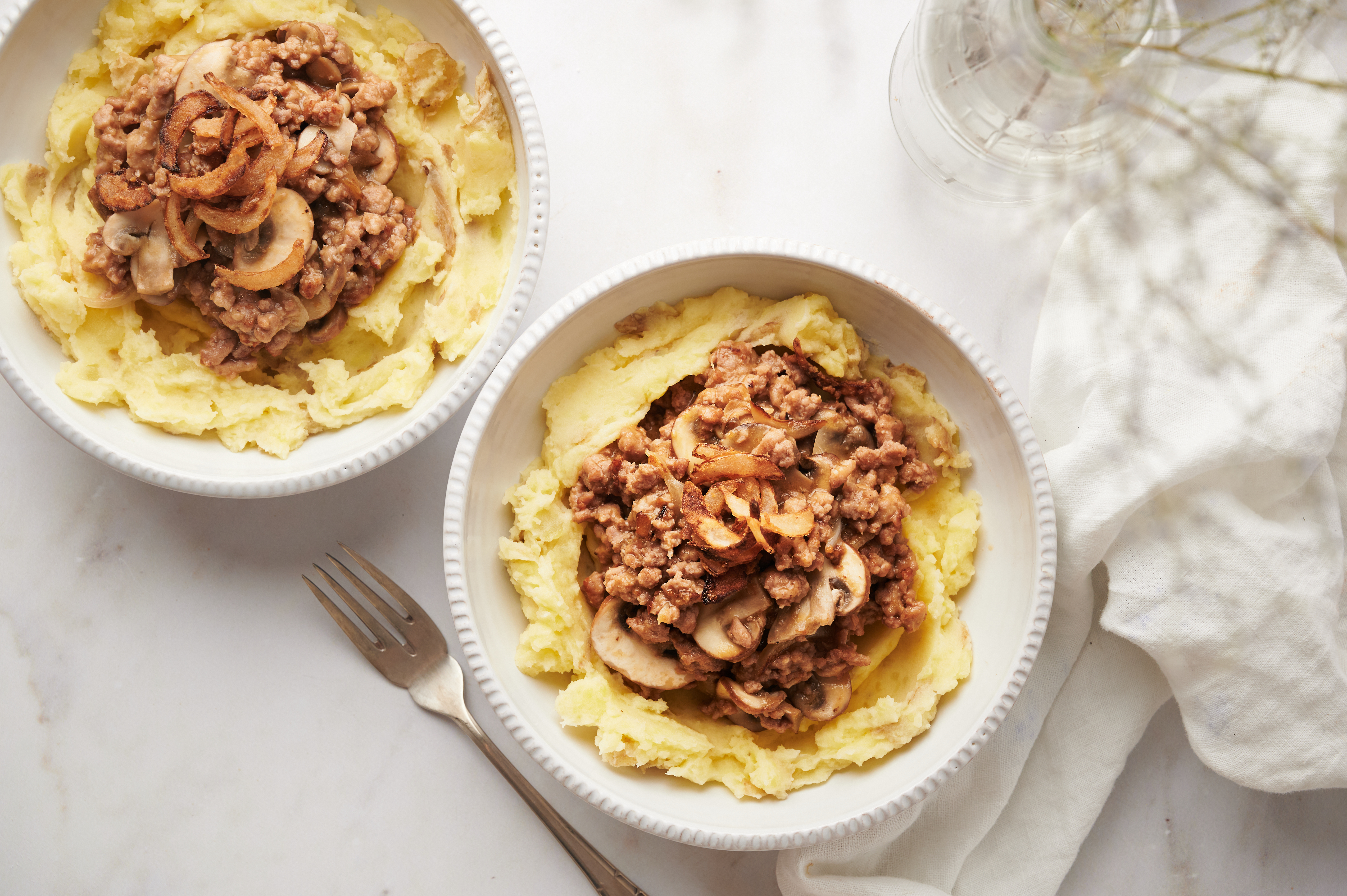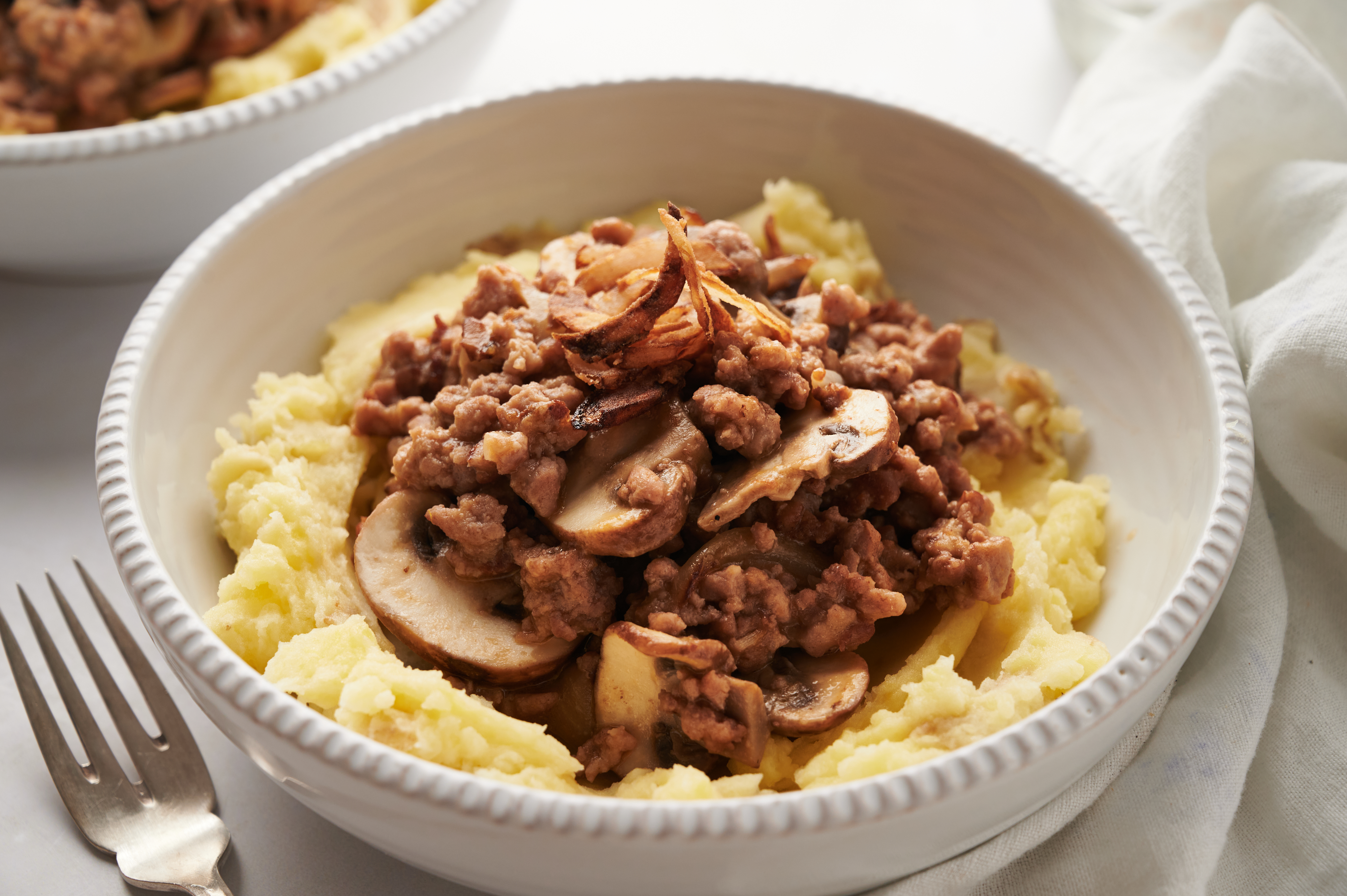It's time for a little comfort at home, isn't it? Put on your favorite cozy house outfit, snuggle in on the couch, put your favorite movie on, and dig into the Ultimate Comforting Dinner. Filled with creamy, fluffy, rich mashed potatoes and a beefy, savory mix of meat, mushrooms, and onions, the Ultimate Comforting Dinner really finds a way to warm the heart and fill the belly. Being topped with crispy fried onions is the proverbial cherry on top... or perhaps that's the fact it only takes half an hour to bring all this relaxing deliciousness to your table? Either way, you'll know why this is the end-all and be-all of comfort food from your very first bite.