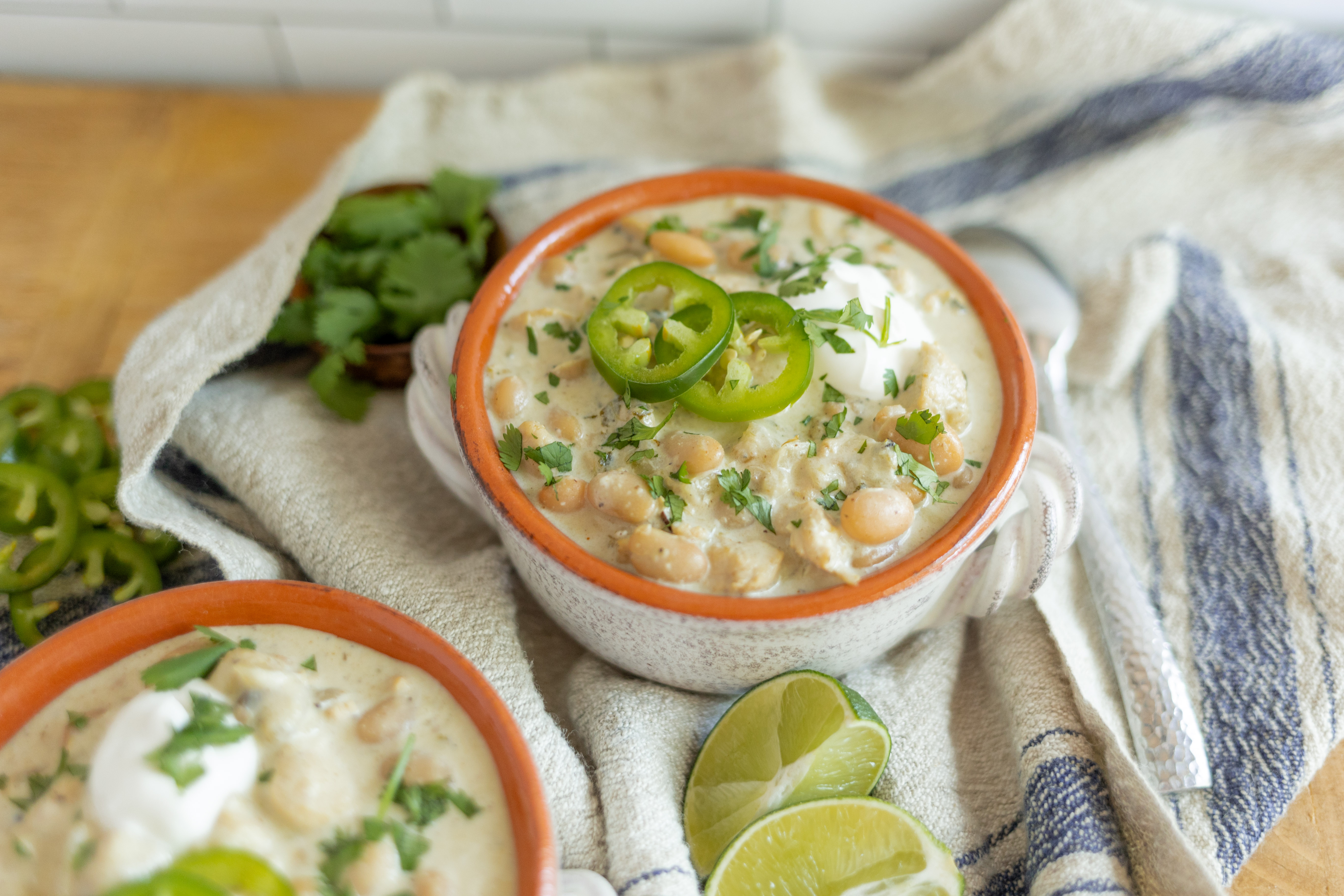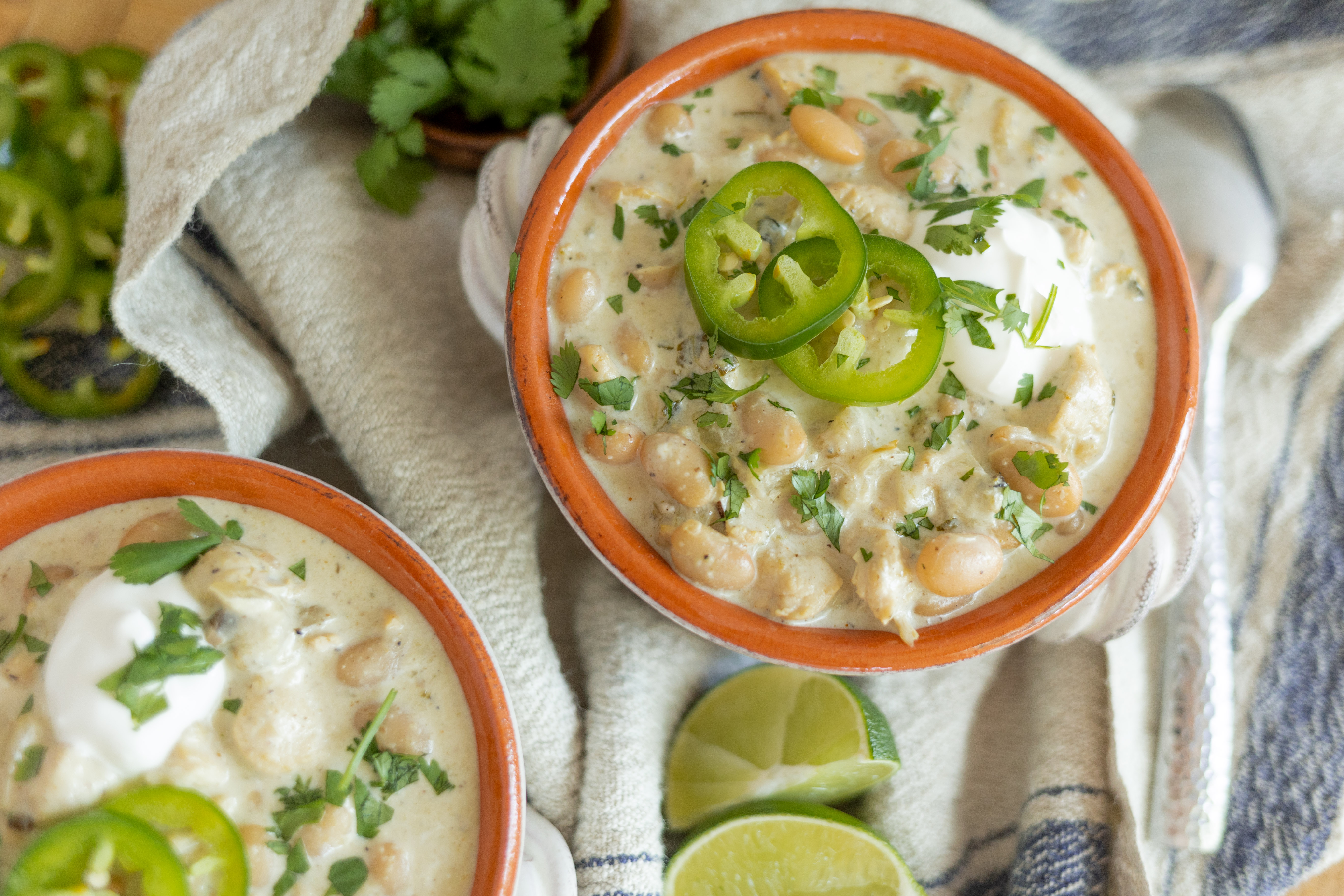 Step 9 -Serve the chili topped with the tortilla chips, the cheddar, the jalapeños, the cilantro, the sour cream, and the lime wedges.