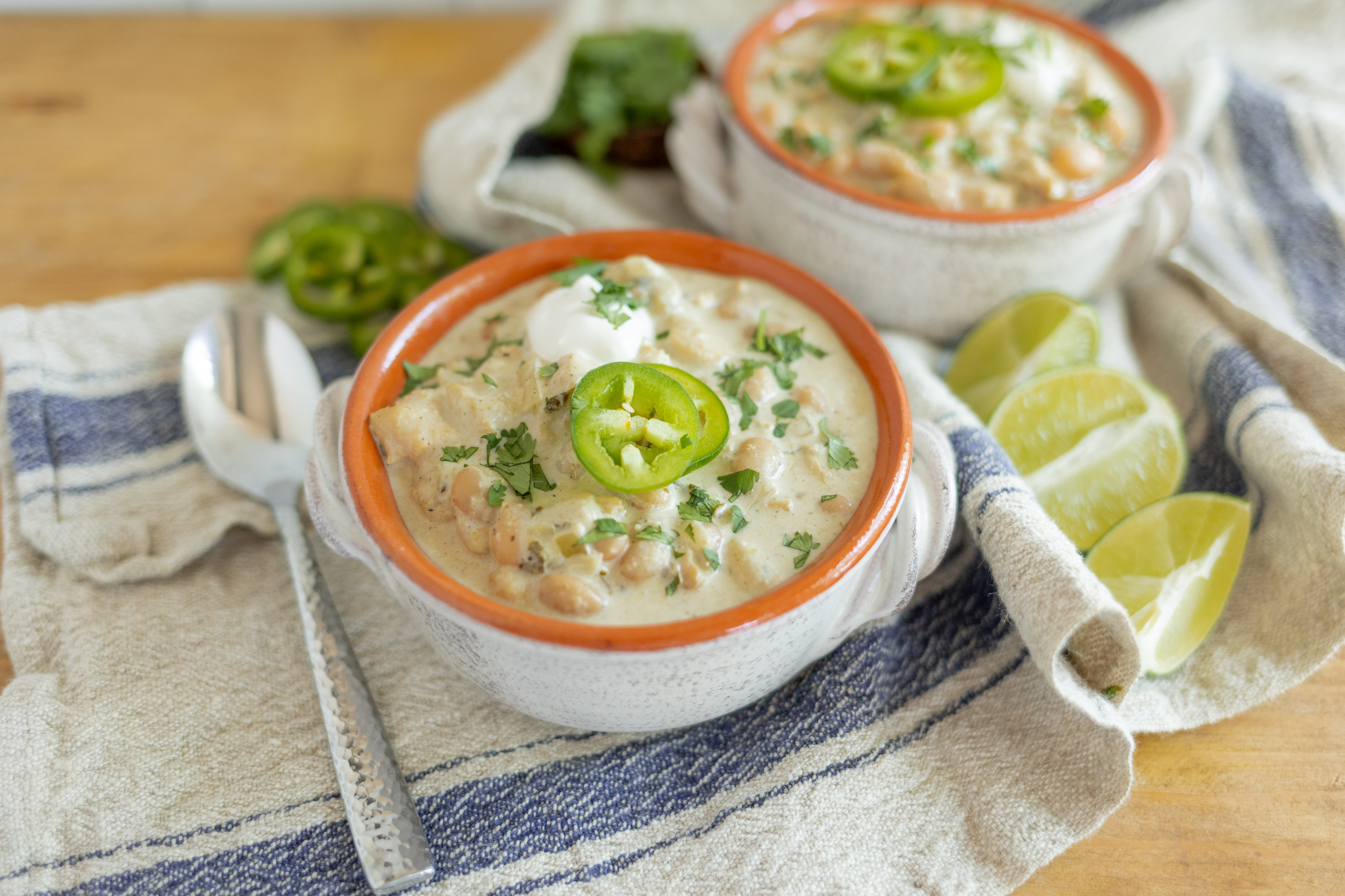 When the cold winds are blowing or you just need to get your fix, we have a warm and inviting bowl full of yumminess for you. Yummy White Chili is the exact comfort food you've been longing for, no matter the temperature outside! Sautéed chicken breasts are tenderly cooked and soulfully surrounded with great northern beans, spicy green chiles, sumptuous seasonings, and a thick and creamy broth. Add crunchy tortilla chips, sharp cheddar, and some hot jalapeños, and Yummy White Chili is jumping with all the comforts of home. It's getting hot up in here!